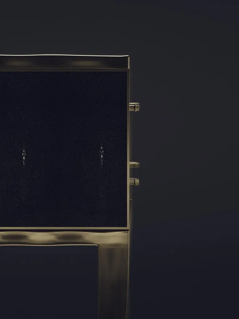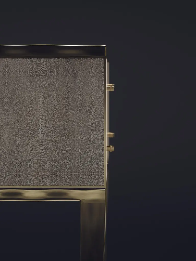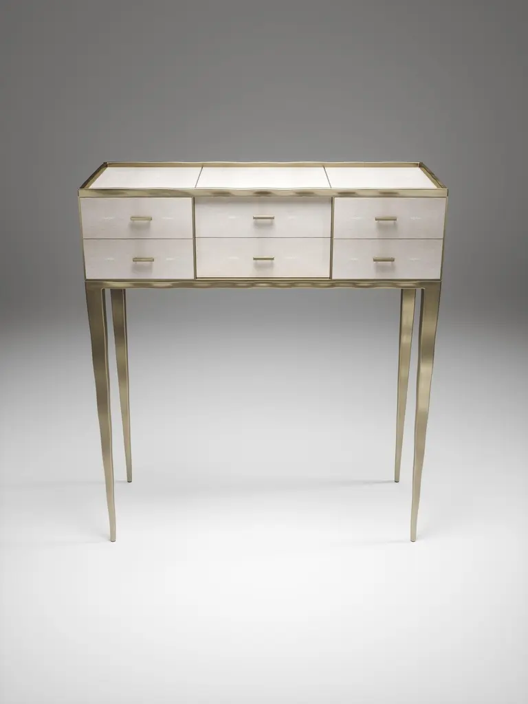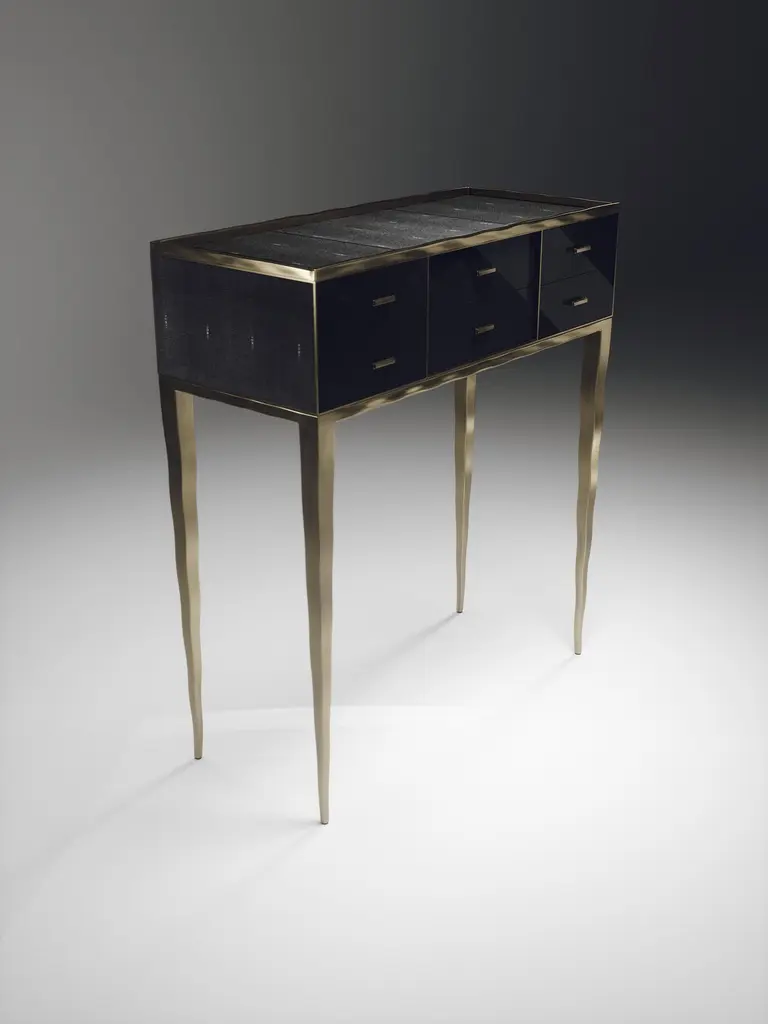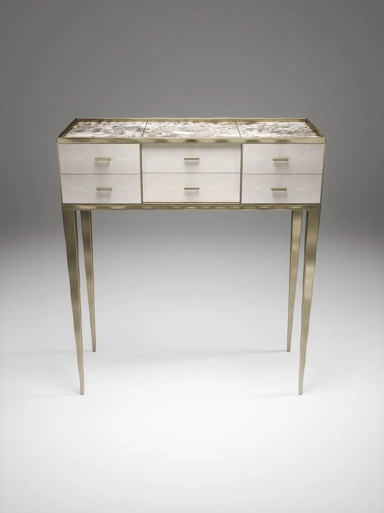 The Paris based label has distinguished themselves since their launch, with their iconic use of shagreen mixed with brass and other exotic materials. All furniture is handcrafted by skilled artisans, ultimately making each piece unique, designed in Paris and produced in the Philippines.The Melting Cosima console table by R&Y Augousti is a stunning multi-faceted piece. The beautiful signature "melting" inlay work in bronze-patina brass demonstrates the incredible artisan work of Augousti. This piece includes 6 drawers total, and the tabletop is slightly dipped making this a great console for your entrance or vanity. This piece is inlaid in cream shagreen, available in other finishes. Custom sizing/finishing available on request.The dimensions of this piece are33 x 14 x 36.5"All R&Y Augousti pieces are handmade by artisans, ultimately making each piece unique. Custom color or sizing available on request. Wipe clean with soft dry cloth.Acclaimed design duo Ria & Yiouri Augousti have established themselves since the 1990s as pioneers of modern-vintage style through their luxurious Art Deco inspired collections.The Paris based label has distinguished themselves since their launch, with their iconic use of shagreen mixed with brass and other exotic materials. All furniture is handcrafted by skilled artisans, ultimately making each piece unique. All shagreen-covered items should be kept out of direct sunlight, color variants may occur on the stingray and other exotic finishes, but this showcases the Parisian label's commitment to creating authentic luxurious products using natural components.