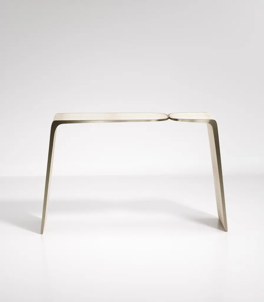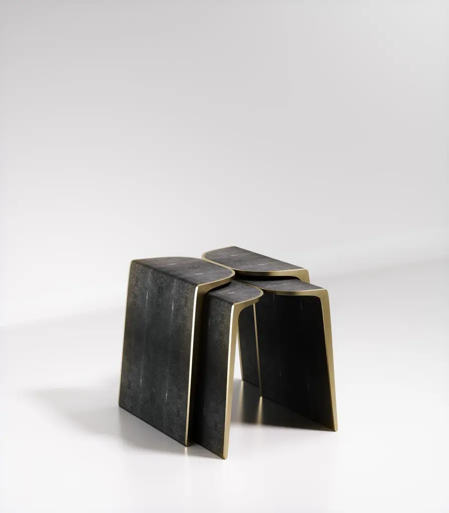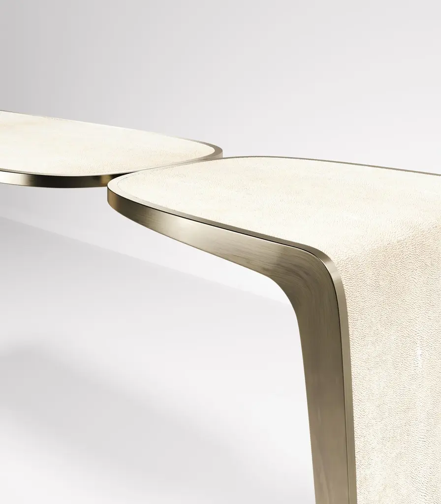 The Paris based label has distinguished themselves since their launch, with their iconic use of shagreen mixed with brass and other exotic materials. All furniture is handcrafted by skilled artisans, ultimately making each piece unique, designed in Paris and produced in the Philippines.The Kiss console by Kifu Paris is an elegant and organic piece in it's unique design. The cream shagreen inlaid piece curves inwards to create the "kiss" effect. The borders are accentuated by bronze-patina brass. This piece is designed by Kifu Augousti the daughter of Ria and Yiouri Augousti. Available in other finishes. Part of the Kiss Capsule, see images of the collection at end of the slide.The finish of the shagreen is authentic as it is hand-dyed and the designer calls the finish look: "antique natural shagreen."The dimensions of this piece are depth 35 cm / top width 126.4 cm / bottom width 149.5 cm / height 90 cmAll Kifu Paris pieces are handmade by artisans, ultimately making each piece unique.Custom color/sizing available on request.Wipe clean with soft dry cloth.Although inspired by her parents, her collection of Home Accessories and Furniture is a distinct identity of its own. Kifu uses handmade techniques of elaborate inlay patterns of shagreen, shells, semi-precious stones, materials she experienced as a child growing up in her parent’s studio, but interpreted in a younger quirkier way reflecting her youth. From her "jewelry inspired knobs" on decorative boxes, gold bar boxes and an extravagant inlay pattern mix of shagreen and shell inspired by galactic constellations, as seen on her enormous round mirror, is refreshing to see. Kifu embodies whimsical elements throughout her collection and is not afraid to be daring and unexpected in her approach to design.All shagreen-covered items should be kept out of direct sunlight, color variants may occur on the stingray and other exotic finishes, but this showcases the Parisian label's commitment to creating authentic luxurious products using natural components.