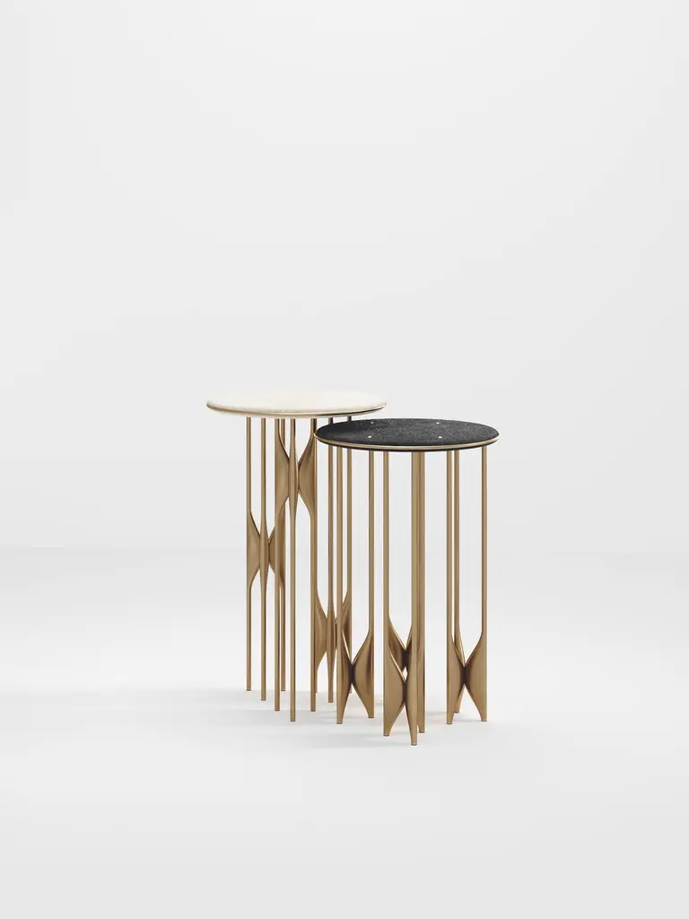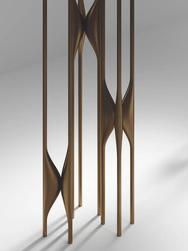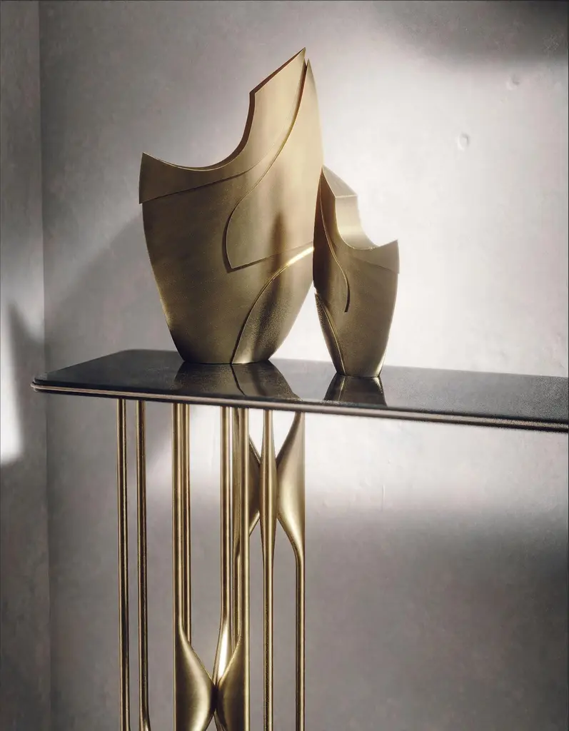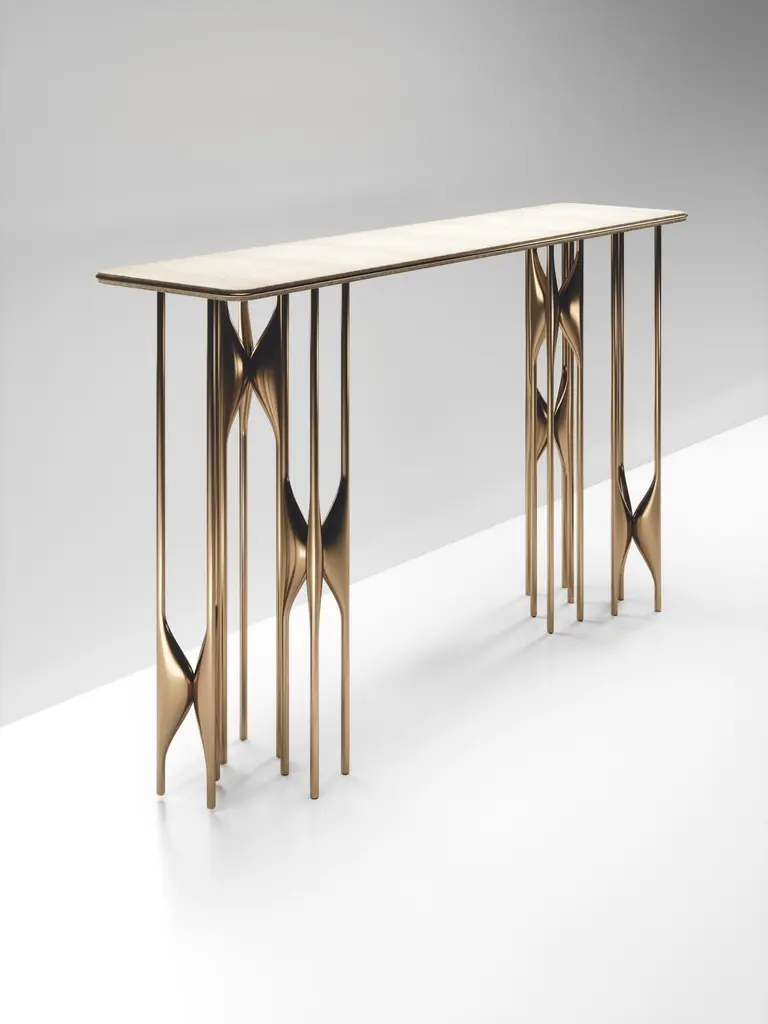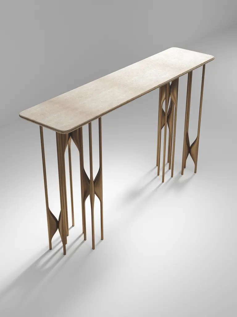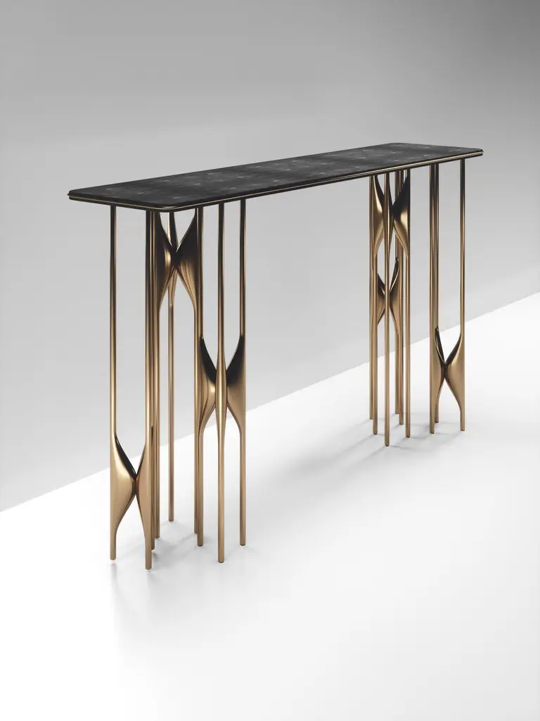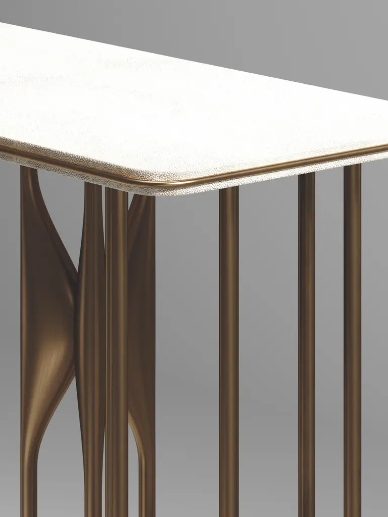 The Paris based label has distinguished themselves since their launch, with their iconic use of shagreen mixed with brass and other exotic materials. All furniture is handcrafted by skilled artisans, ultimately making each piece unique, designed in Paris and produced in the Philippines.The Plumeria Console by Kifu Paris is a dramatic and sculptural piece. The cream shagreen inlaid top sits on clusters of bronze-patina brass legs that are conceptually inspired by bird feathers floating on top of a lake. The border of the top is accentuated by a subtle and elegant bronze-patina brass indentation detail. This piece is designed by Kifu Augousti the daughter of Ria and Yiouri Augousti. Available in other finishes. Part of the Plumeria Capsule, see images of the collection at end of the slide.The finish of the shagreen is authentic as it is hand-dyed and the designer calls the finish look: "antique natural shagreen."The dimensions of this piece are 150 x 35 x 90 cmAll Kifu Paris pieces are handmade by artisans, ultimately making each piece unique.Custom color/sizing available on request.Wipe clean with soft dry cloth.Although inspired by her parents, her collection of Home Accessories and Furniture is a distinct identity of its own. Kifu uses handmade techniques of elaborate inlay patterns of shagreen, shells, semi-precious stones, materials she experienced as a child growing up in her parent’s studio, but interpreted in a younger quirkier way reflecting her youth. From her "jewelry inspired knobs" on decorative boxes, gold bar boxes and an extravagant inlay pattern mix of shagreen and shell inspired by galactic constellations, as seen on her enormous round mirror, is refreshing to see. Kifu embodies whimsical elements throughout her collection and is not afraid to be daring and unexpected in her approach to design.All shagreen-covered items should be kept out of direct sunlight, color variants may occur on the stingray and other exotic finishes, but this showcases the Parisian label's commitment to creating authentic luxurious products using natural components.
