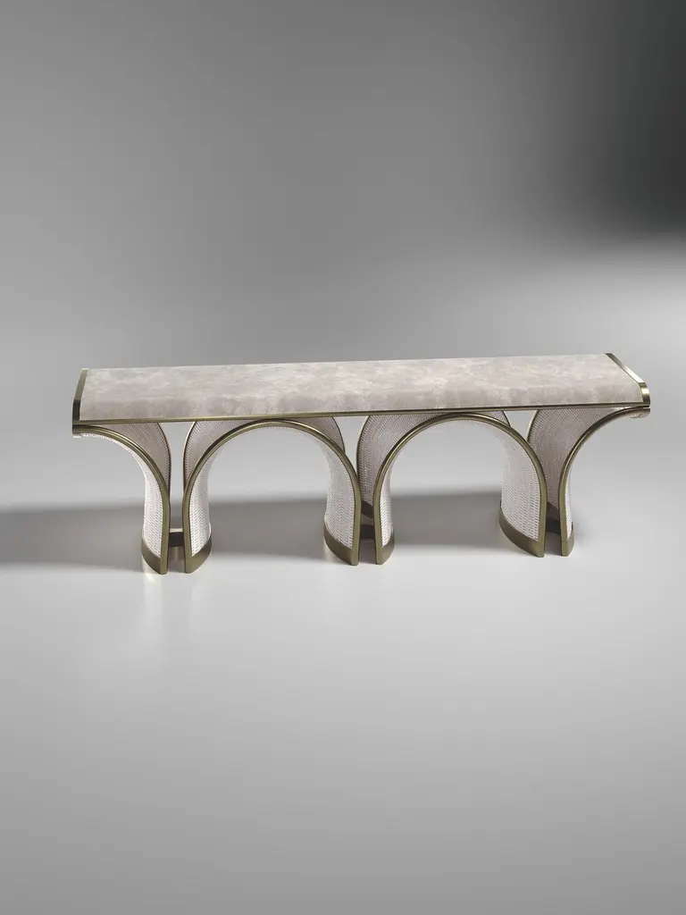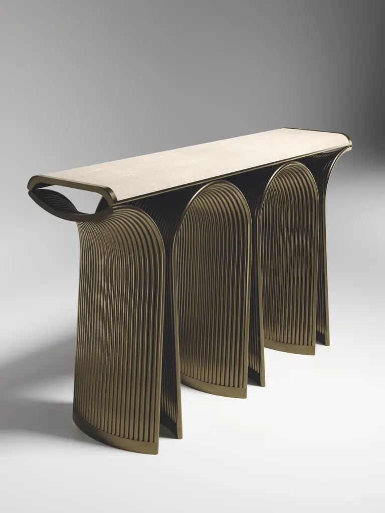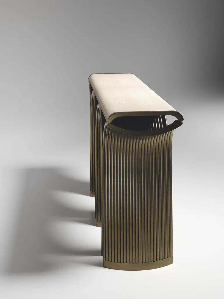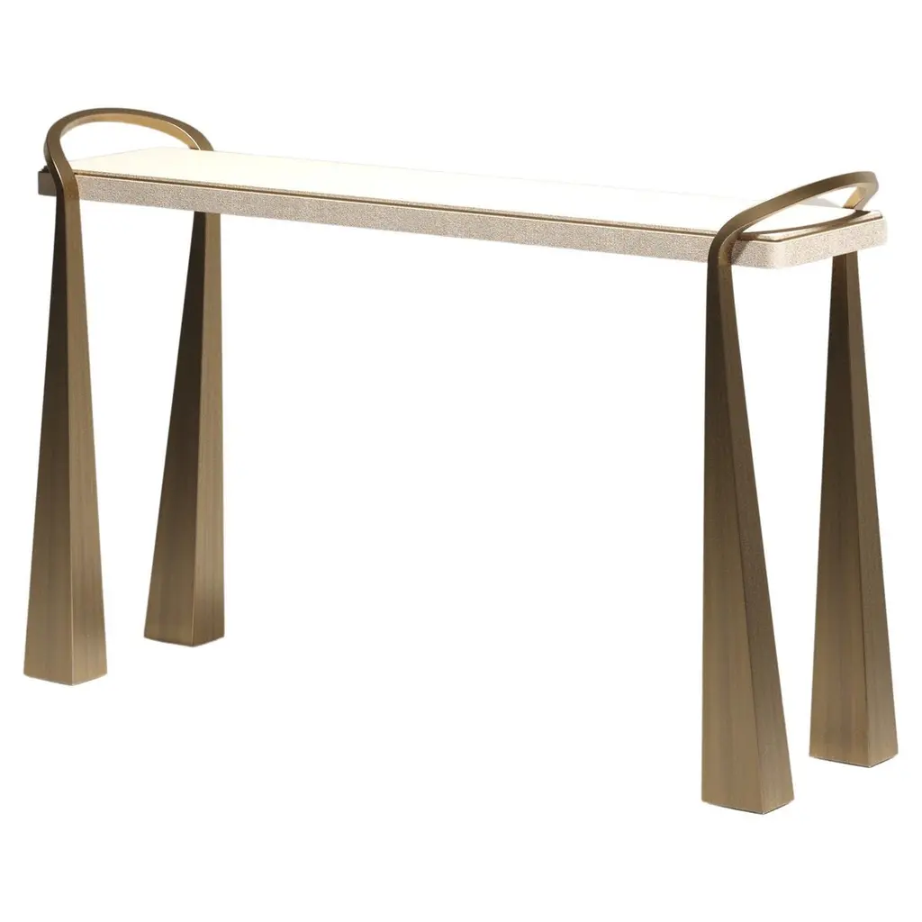 The Paris based label has distinguished themselves since their launch, with their iconic use of shagreen mixed with brass and other exotic materials. All furniture is handcrafted by skilled artisans, ultimately making each piece unique, designed in Paris and produced in the Philippines.The Nymphea console by R&Y Augousti in cream shagreen with bronze-patina brass details explores the brand's iconic DNA of bringing old world artisanal craft into a contemporary and utterly luxury feel. The base of the console is handcrafted with intricate bronze-patina brass piping, showcasing the incredible attention to detail. Available in other finishes. Custom sizing/finishing on requestThis designer calls this finish "antique natural" shagreenThe dimensions of this piece are:Measures: 155 x 41 x 90 cmAll R & Y Augousti pieces are handmade by artisans, ultimately making each piece unique.Wipe clean with soft dry cloth.Acclaimed design duo Ria & Yiouri Augousti have established themselves since the 1990s as pioneers of modern-vintage style through their luxurious Art Deco inspired collections.The Paris based label has distinguished themselves since their launch, with their iconic use of shagreen mixed with brass and other exotic materials. All furniture is handcrafted by skilled artisans, ultimately making each piece unique. All shagreen-covered items should be kept out of direct sunlight, color variants may occur on the stingray and other exotic finishes, but this showcases the Parisian label's commitment to creating authentic luxurious products using natural components.