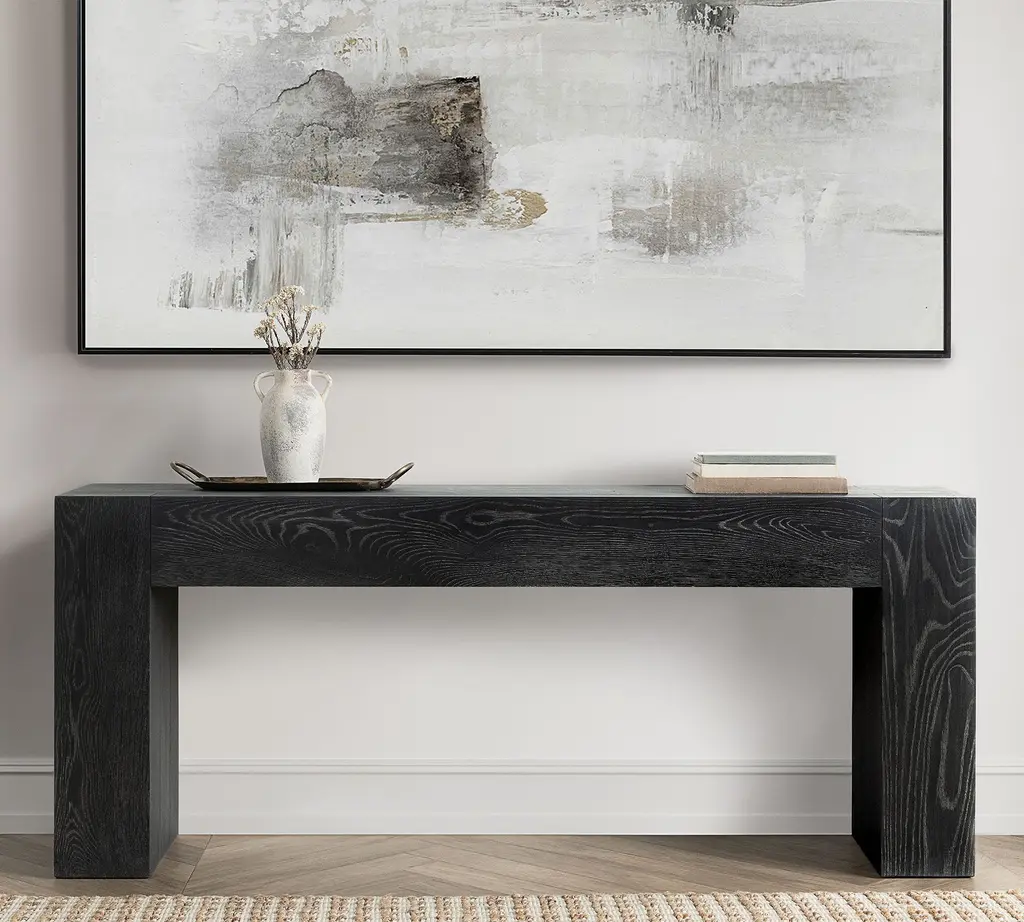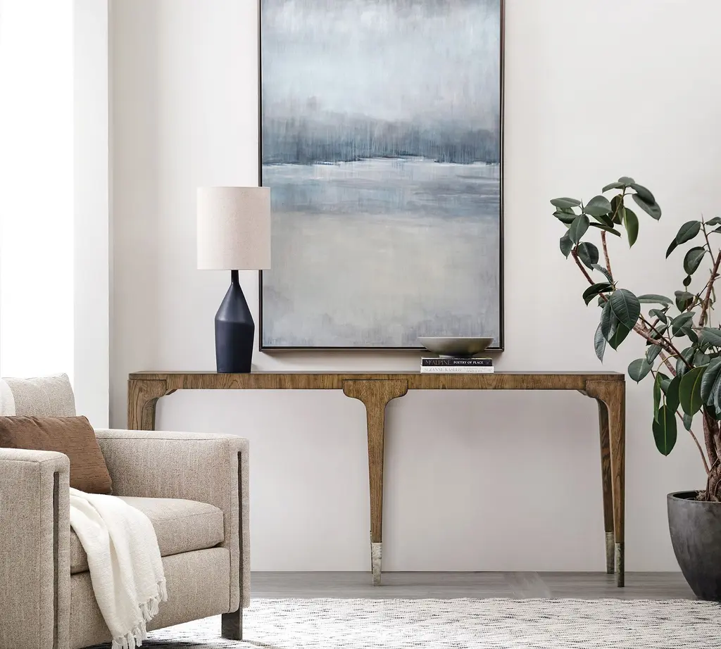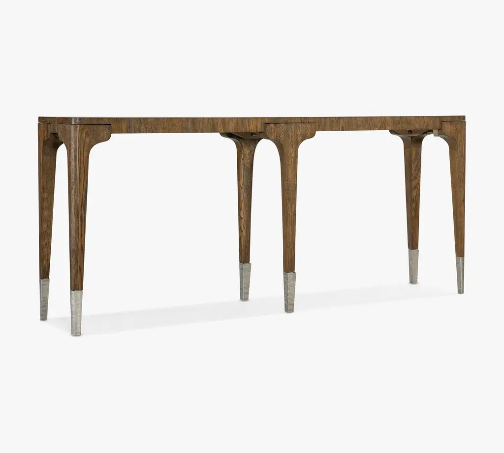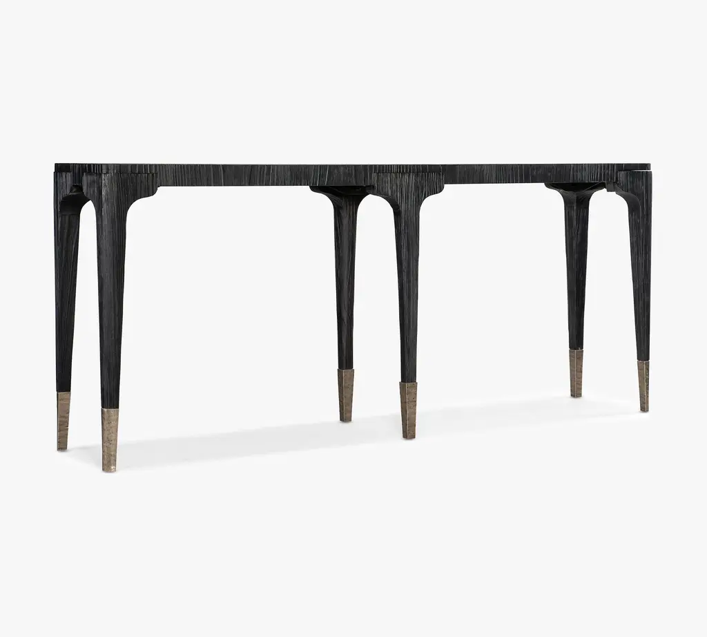 With its shapely, slim silhouette and rich materials, our console table recalls sumptuous Art Deco designs. Crafted of New Zealand pine, Shalina’s graceful form features three pairs of slender legs capped with hand-hammered metal ferrules for a compelling textural contrast. Its narrow proportions make it versatile enough for small apartments and larger homes alike.