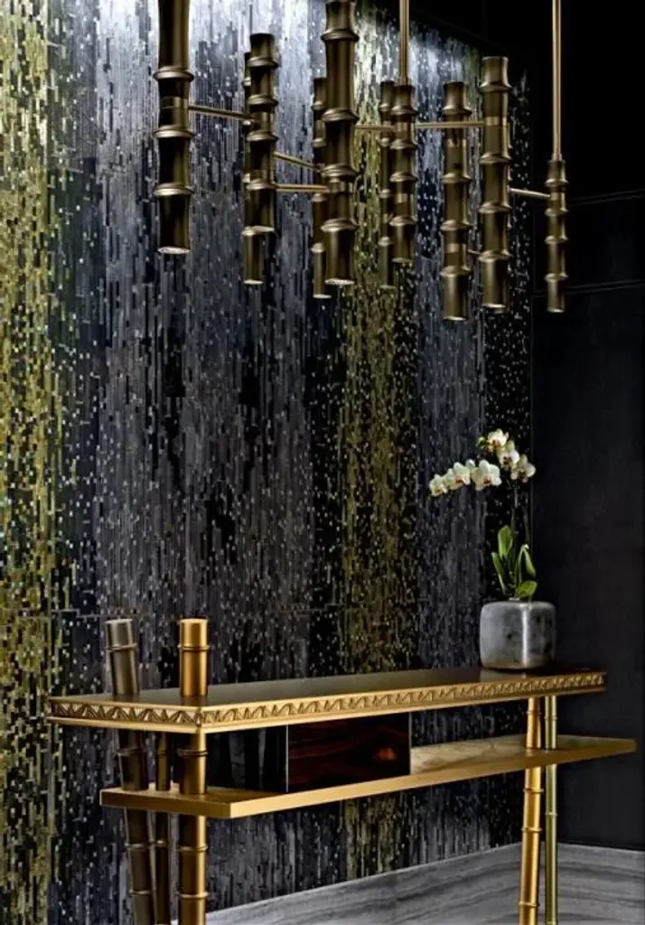 The Siam Console boasts a significant artistic value, and it is perfect to combine with the other elements of the collection to create a suggestive environment with a glam-chic appeal.Console with burnished brass legs. Upper top in brass foil carved at the edges. Lower top in burnished brass covered in artistic mosaic. Drawer with glossy ebony finish.