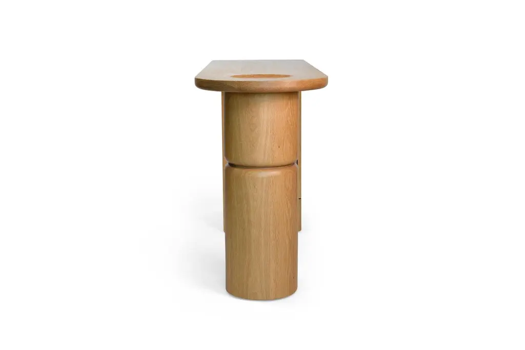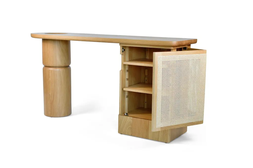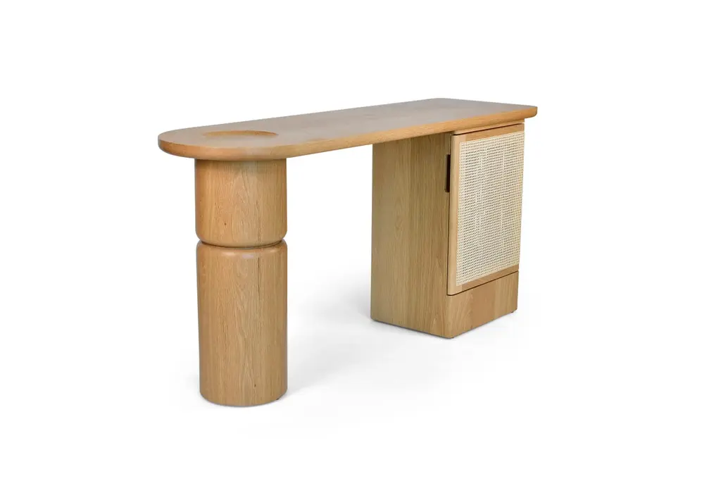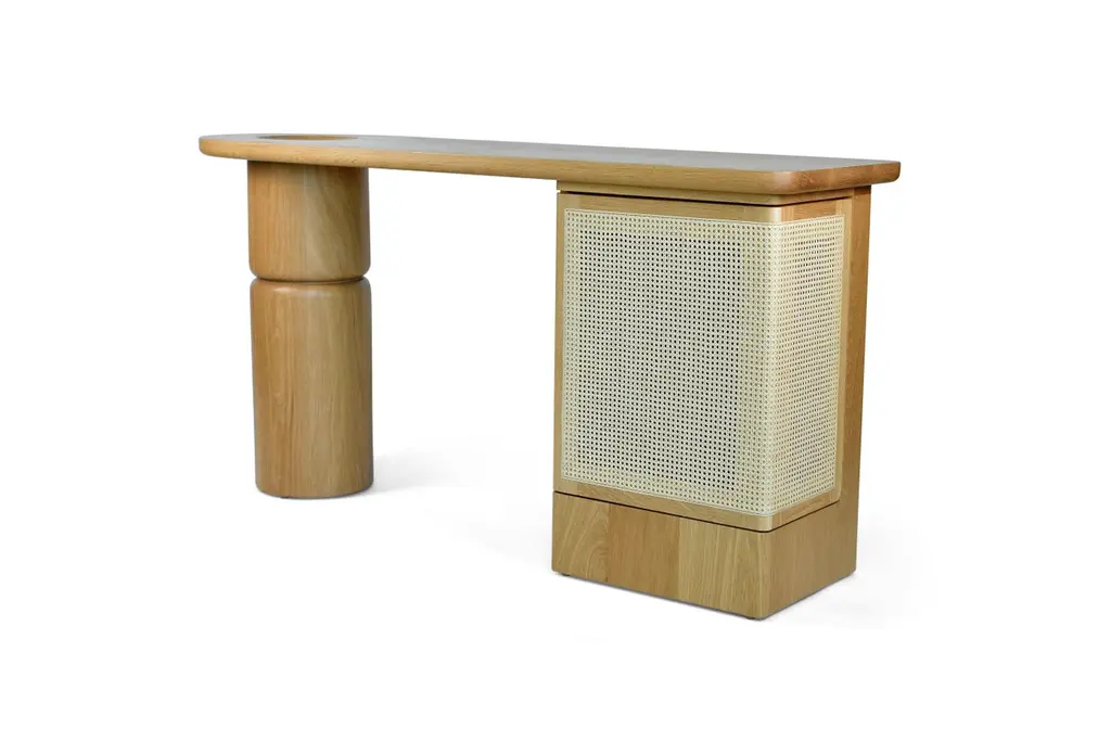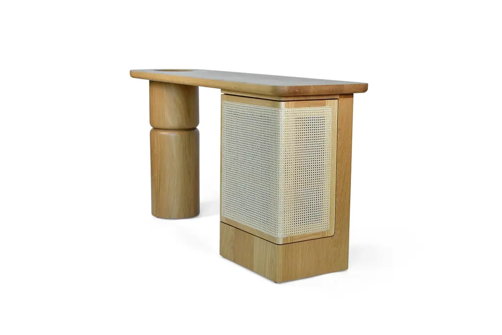 The Silas Console Table is a modern exploration of clean lines and minimalist shapes inspired by the De Stijl design movement. The console finds its inspiration through the simplified approach to the basic shapes and their applications..Highlighting the organic warmth of the solid wood and the integration of the natural woven caning, the console finds its more contemporary approach. As the human eye is drawn to geometry this console prefers to make its statement with smooth curves, striking lines and rich wood grain.Available in Left or Right configurations.FSC certified solid wood construction. Made to Order. Available in three wood types and seven standard finishes. Customization available per approval.Handcrafted in Los Angeles
