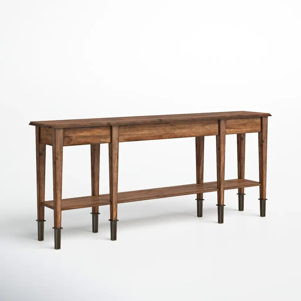 Welcome this solid wood console table into your home and bring a versatile, inviting addition to your space. It features a rectangular top, tapered legs, two side drawers, and a lower shelf for extra storage. We love its warm finish along with the wood scoring and natural grain variation that give it lots of rustic charm.