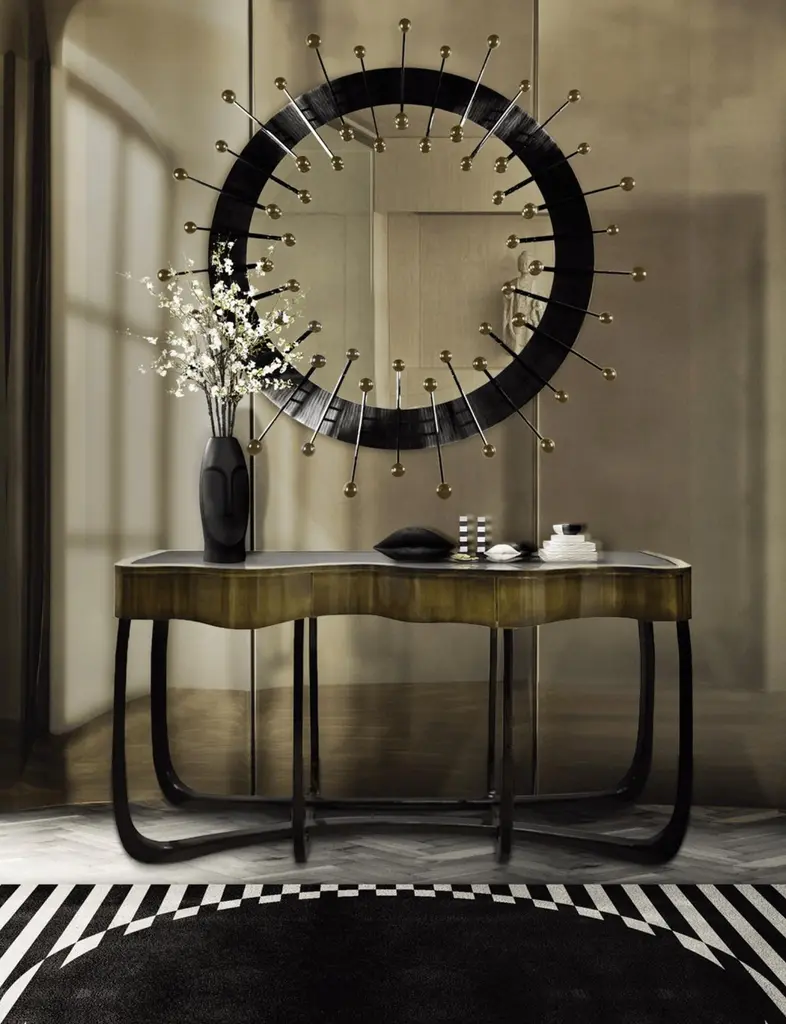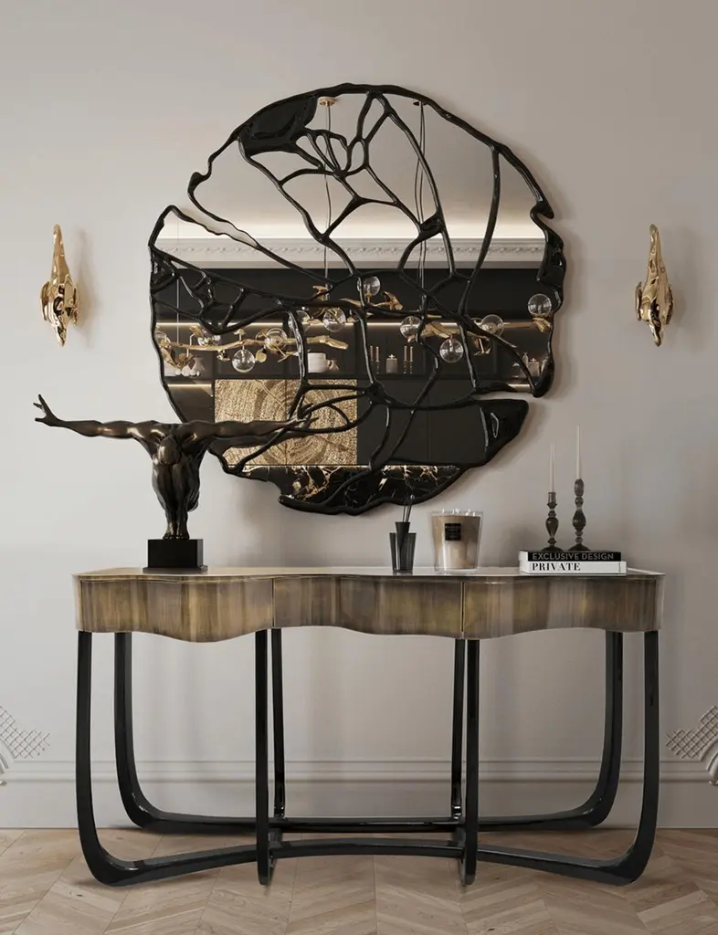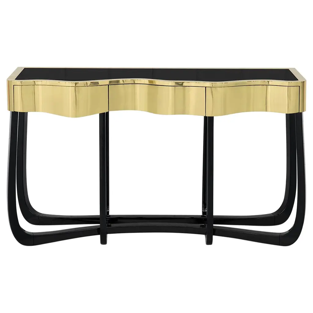 With Sinuous Patina Console you will successfully create a luxurious environment. Sinuous is made for those who love harmonious lines mixed with exquisite detail. Its design is seductive and lures you into a magical and golden world. To achieve extravagance, Boca do Lobo’s artisans handcrafted the structure in mahogany with a high gloss black lacquer finish and top coated in polished brass plated, bringing up the vivid and bright side of Boca do Lobo. This luxury furniture design contains three drawers, adding function to the unique piece.