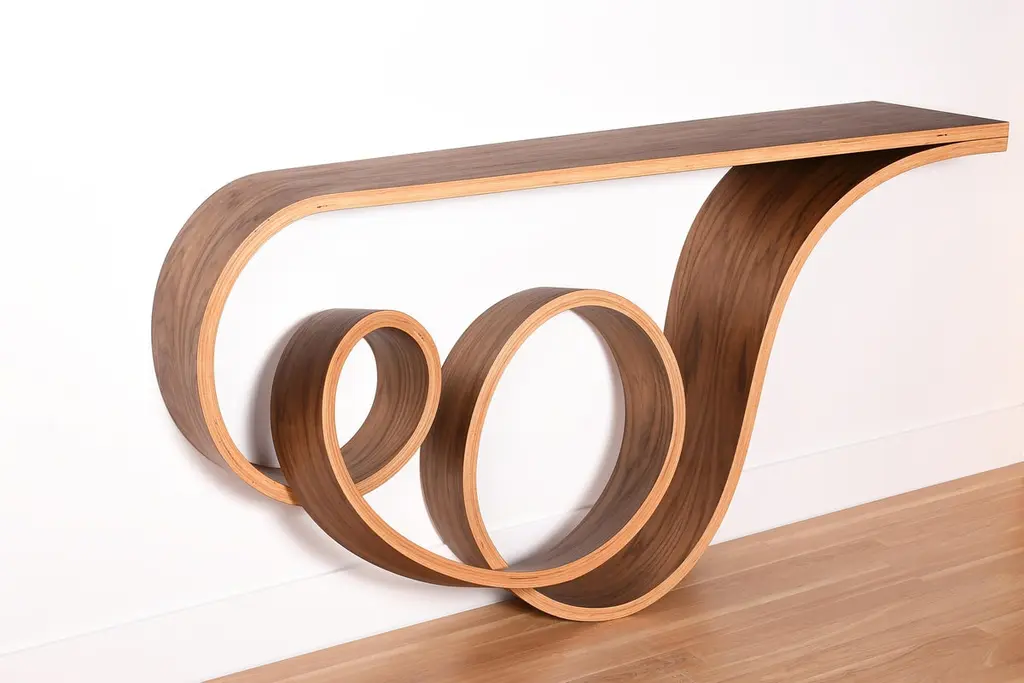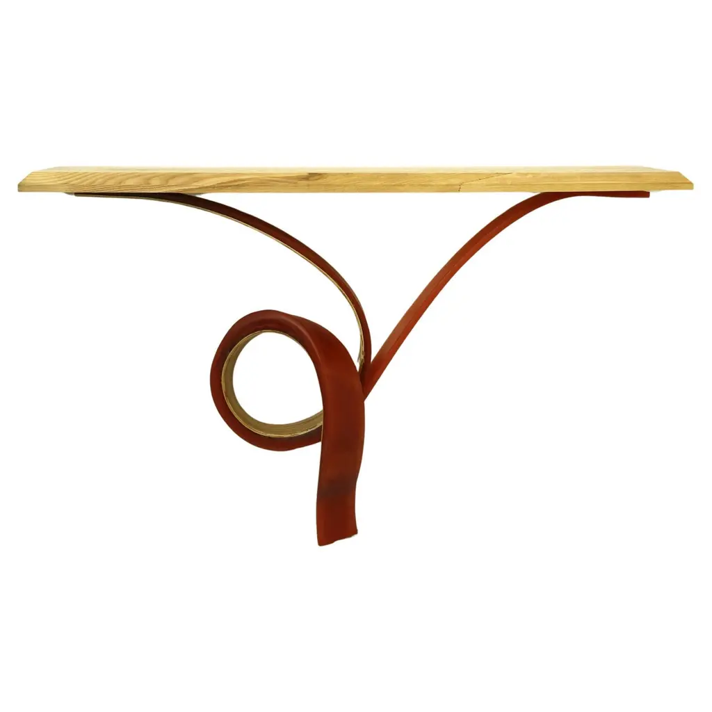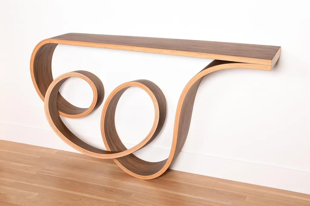 This console table is made with laminated bent plywood with walnut oiled veneer.Overall size: 33 1/2" H x 58" W x 14" DIn the knot 14'' DTable top 14'' D It is wall mounted. Mounting hardware and instructions are included.
