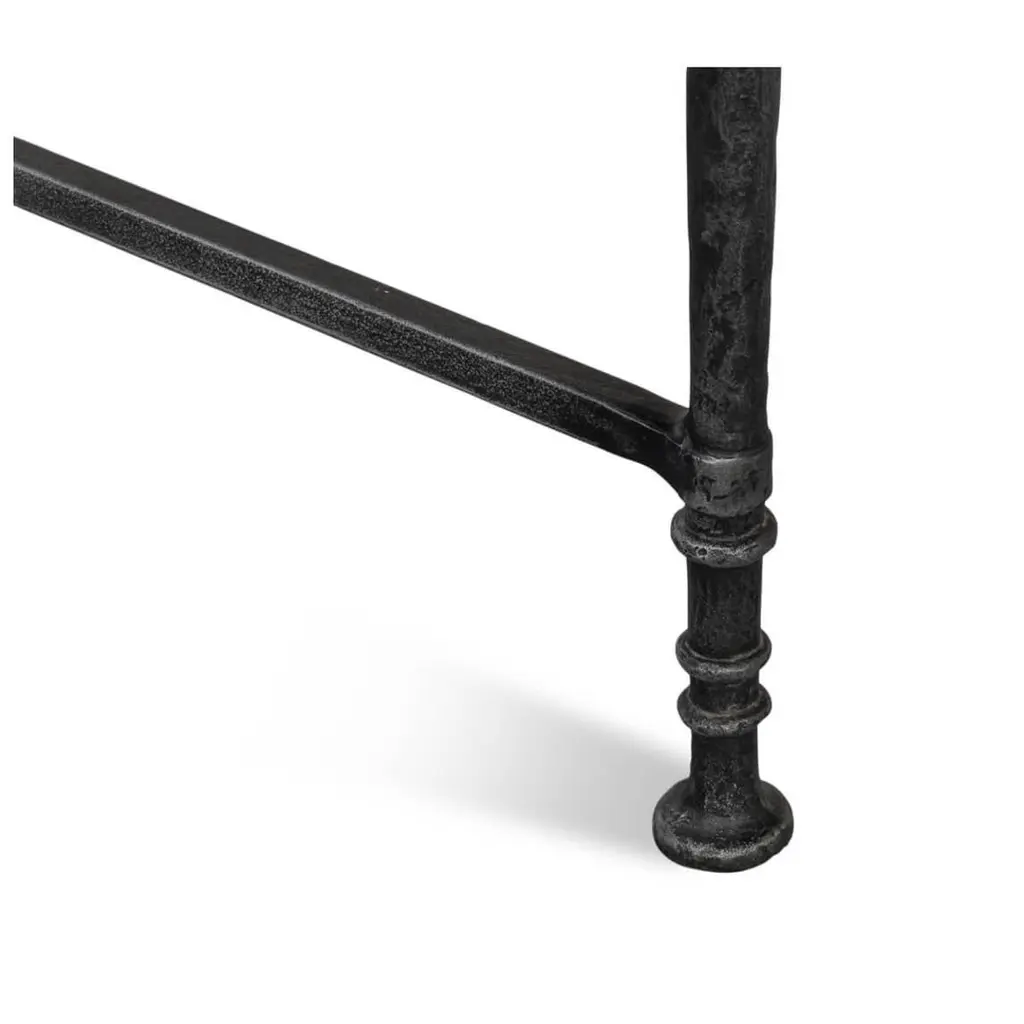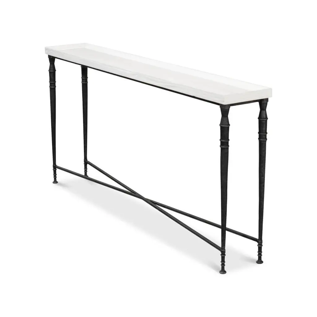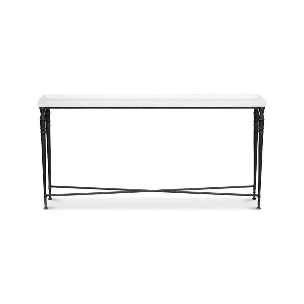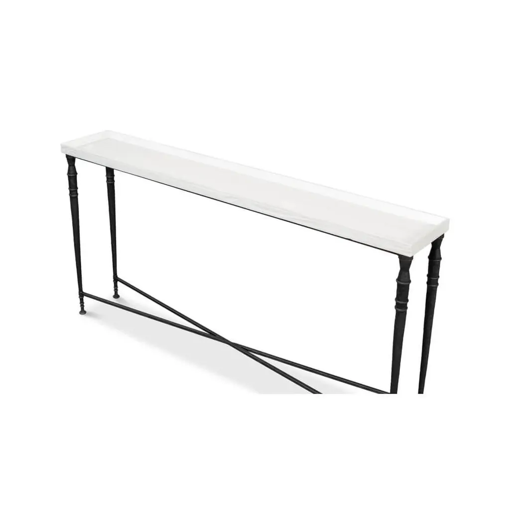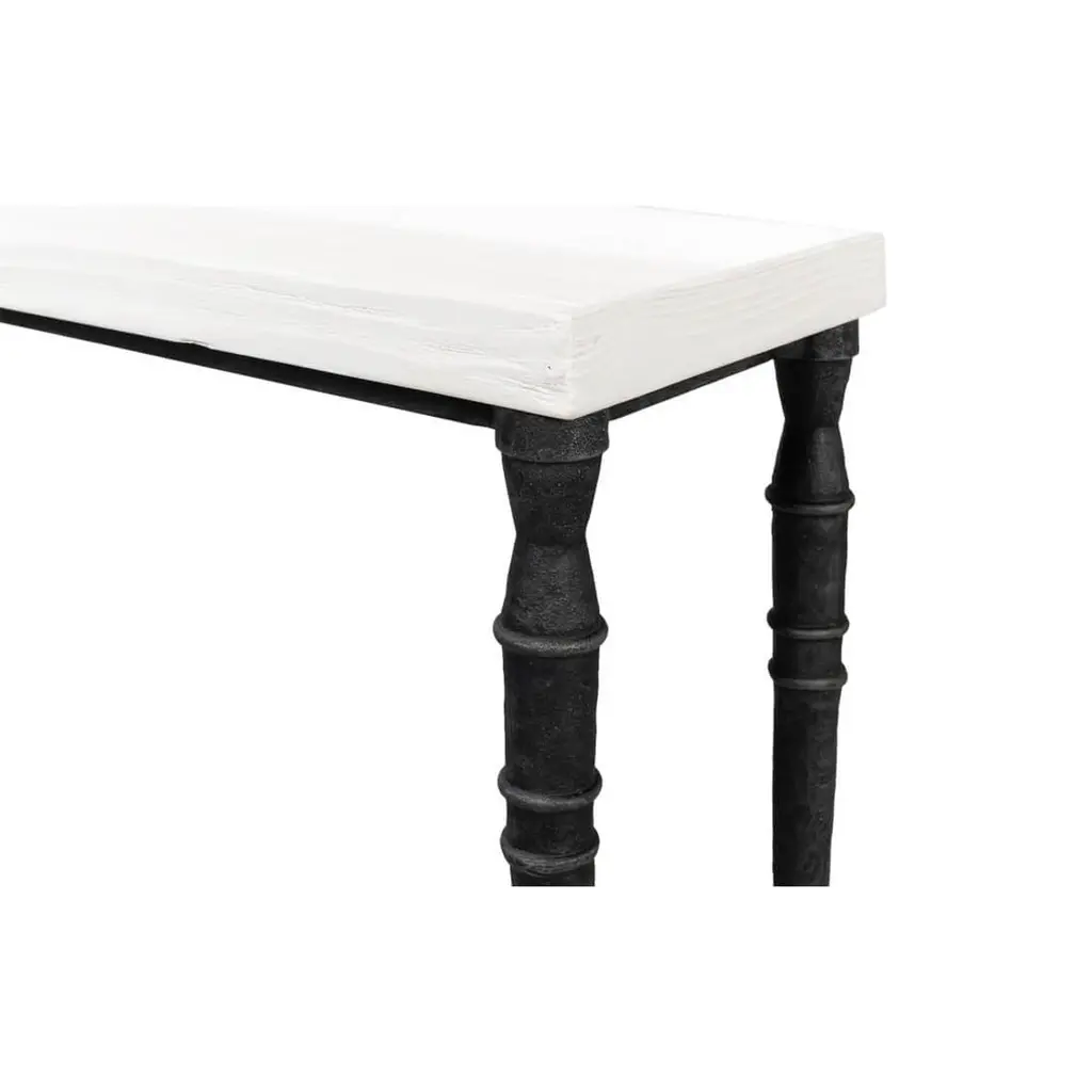 This table features a smooth, off-white wooden tabletop that sits atop a slender black iron frame. The iron legs boast subtle ornamental accents that hark back to traditional craftsmanship, while the overall simplicity of the design anchors it firmly in the contemporary.This piece is a versatile addition to any home, serving as a refined stage in your entryway, behind a sofa, or in a hallway. It provides a perfect balance of function and style, adding a touch of sophistication without overwhelming the space.Dimensions: 60" W x 10" D x 30" H