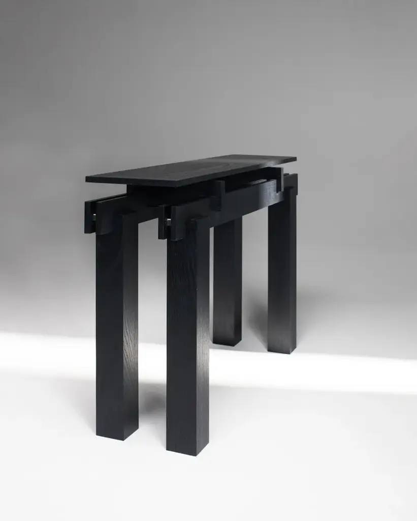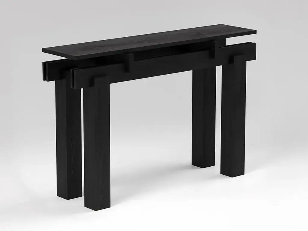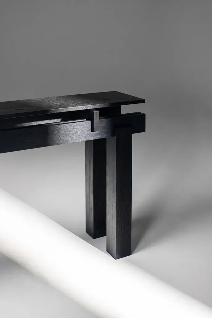 Slit is a solid oak made console.Slit Console, a harmonious extension of the Slit coffee table counterpart. Embodying the essence of the 'Off-Grid' concept, the Slit Console mesmerizes with its disruptive design.The unique twist with the Slit Console lies in its pure wooden composition, offering a tactile and authentic connection with nature. Its heightened stature as a console table adds a touch of grandeur to any space, making it an ideal addition to hallways, entrances, living areas.In this collection, we take the omnipresent gridal system, a network of lines and coordinates, and transform it into an open playground for us. The grid, once considered a rigid guide, is now turning into a dynamic base for our creative expression, a scaffolding for our imagination to thrive... We revel in its presence, allowing it to shape and mold our initial ideas. But we don't let it confine us; instead, we choose to dance on its edges, joyously swinging between structure and release.