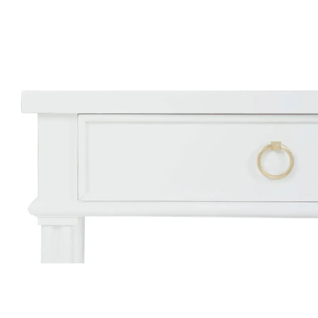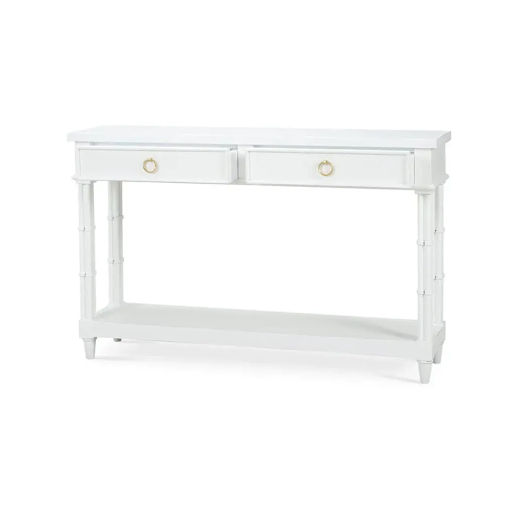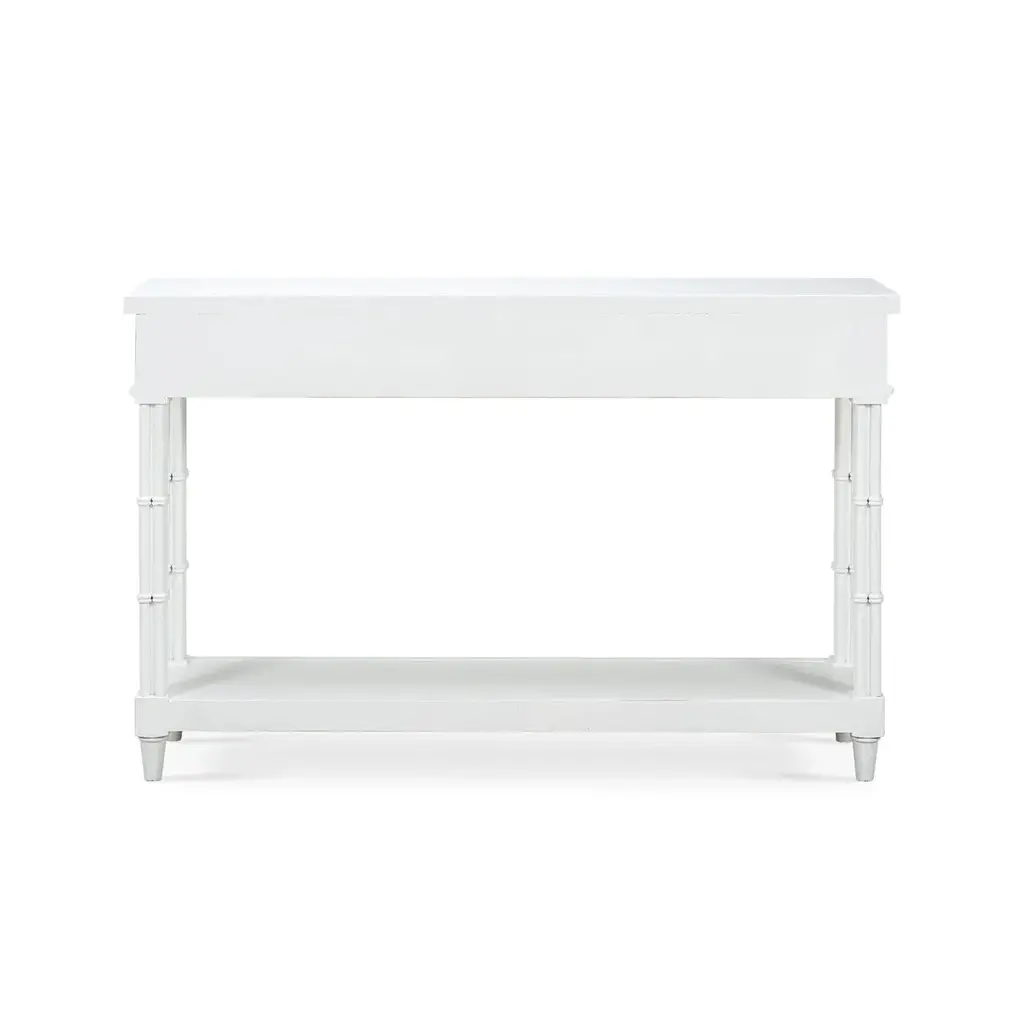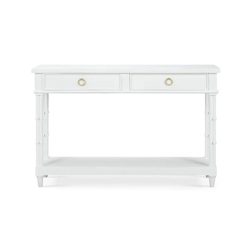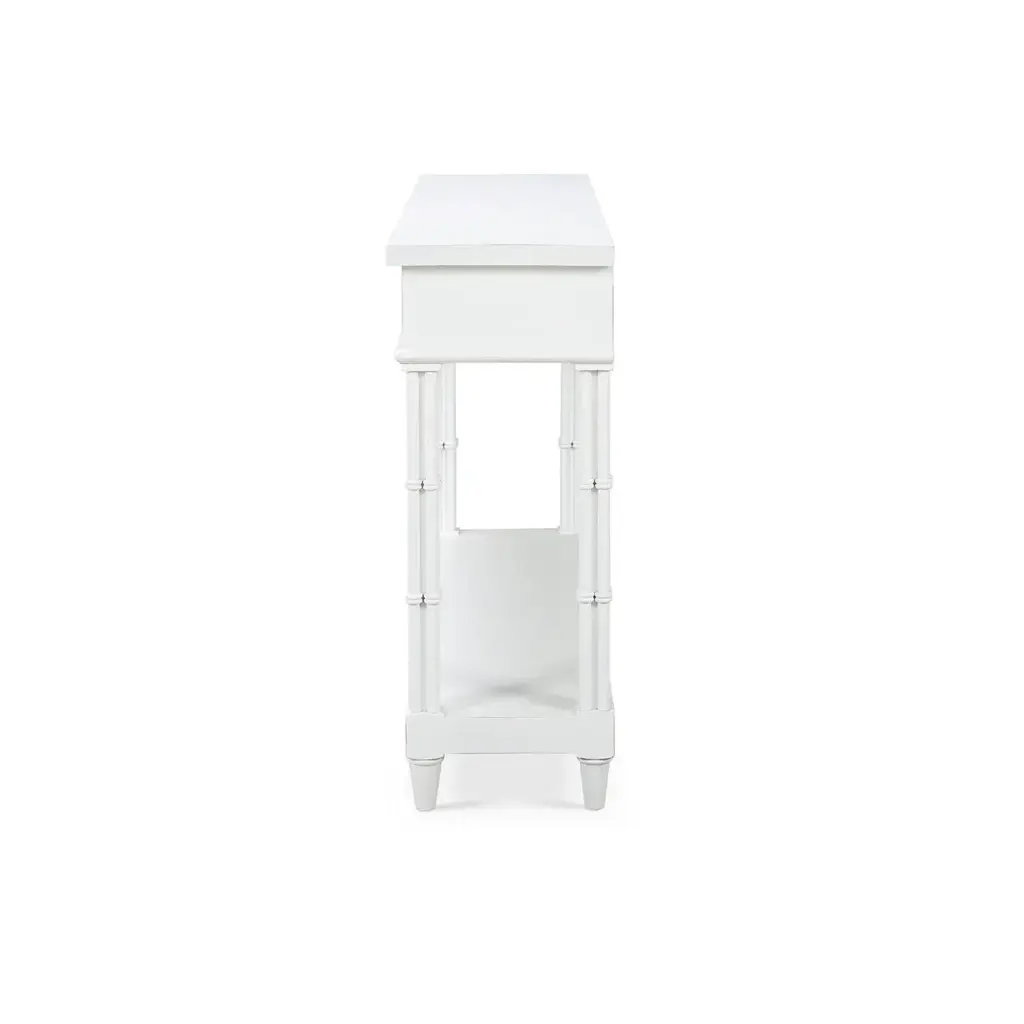 A masterpiece made from high-quality mahogany and finished in a lightly distressed architectural white finish. This table embodies timeless elegance with its cluster column form legs, adding a touch of classic Regency style to any room. Designed for both style and functionality, this console table features four spacious drawers adorned with chic ring pulls, providing ample storage for your essentials. Perfect for your living room, hallway, or entryway, this Regency style table seamlessly blends practicality with exquisite design, making it a standout addition to your home decor. Dimensions: 46" W x 11" D x 30" H