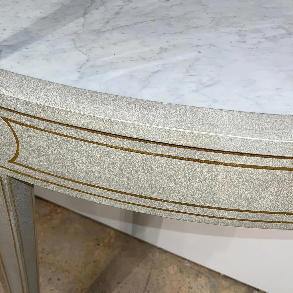 Combining elegant simplicity with fine craftsmanship and luxurious materials. The inset Carrara marble top creates a striking contrast against the hand-applied gray finish, while delicate gold leaf trim adorns the frieze and square tapered legs, reflecting traditional Swedish design elements. This versatile piece suits both traditional and contemporary settings, its 40-inch width providing ample display space while maintaining graceful proportions. The durable marble top offers both beauty and functionality, making this console equally suited for practical use in entryways or as an elegant accent piece in living spaces. Dimensions: 40" W x 18" D x 32" H