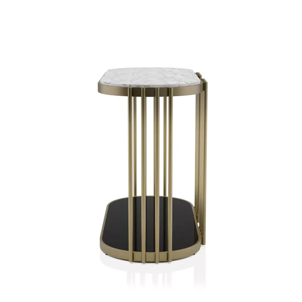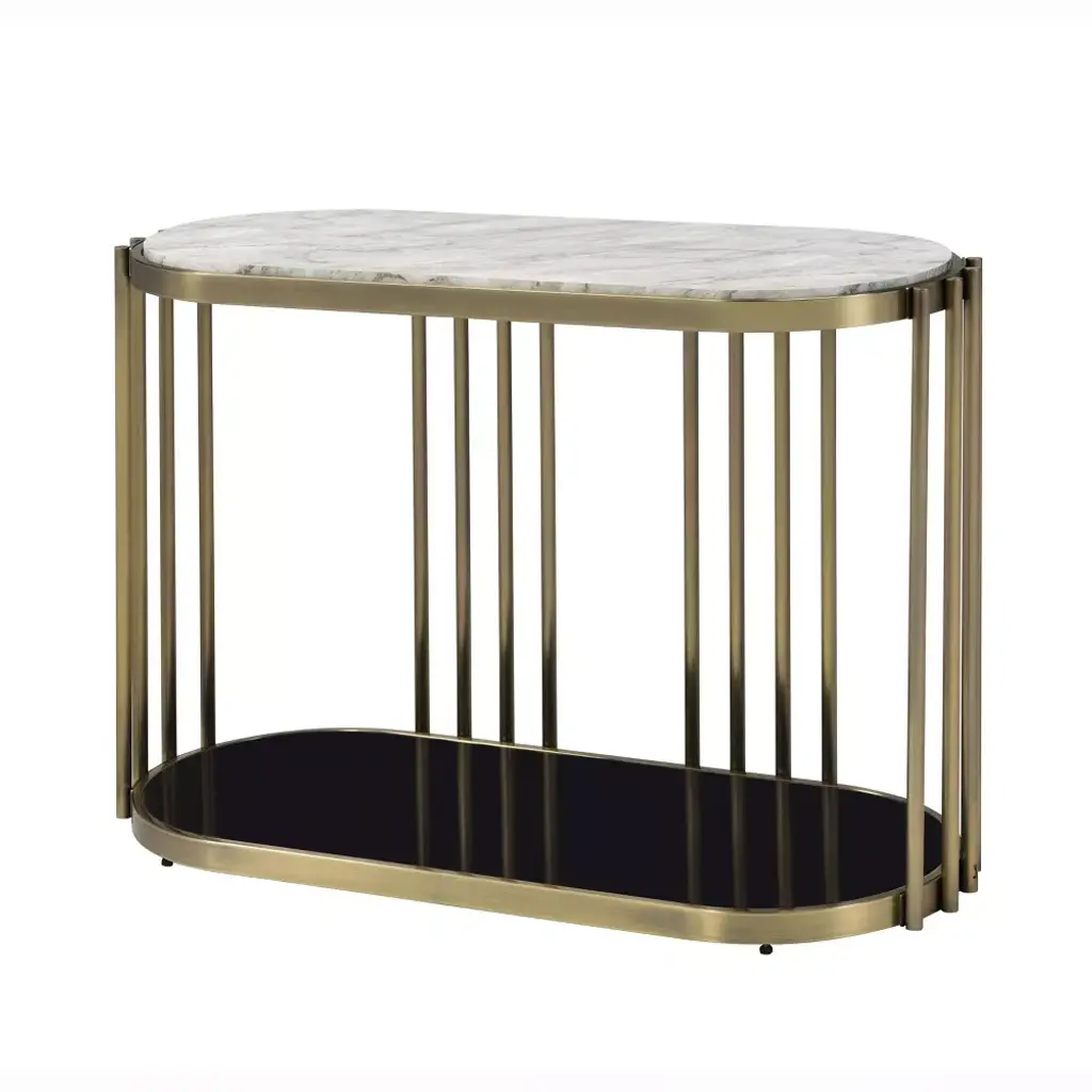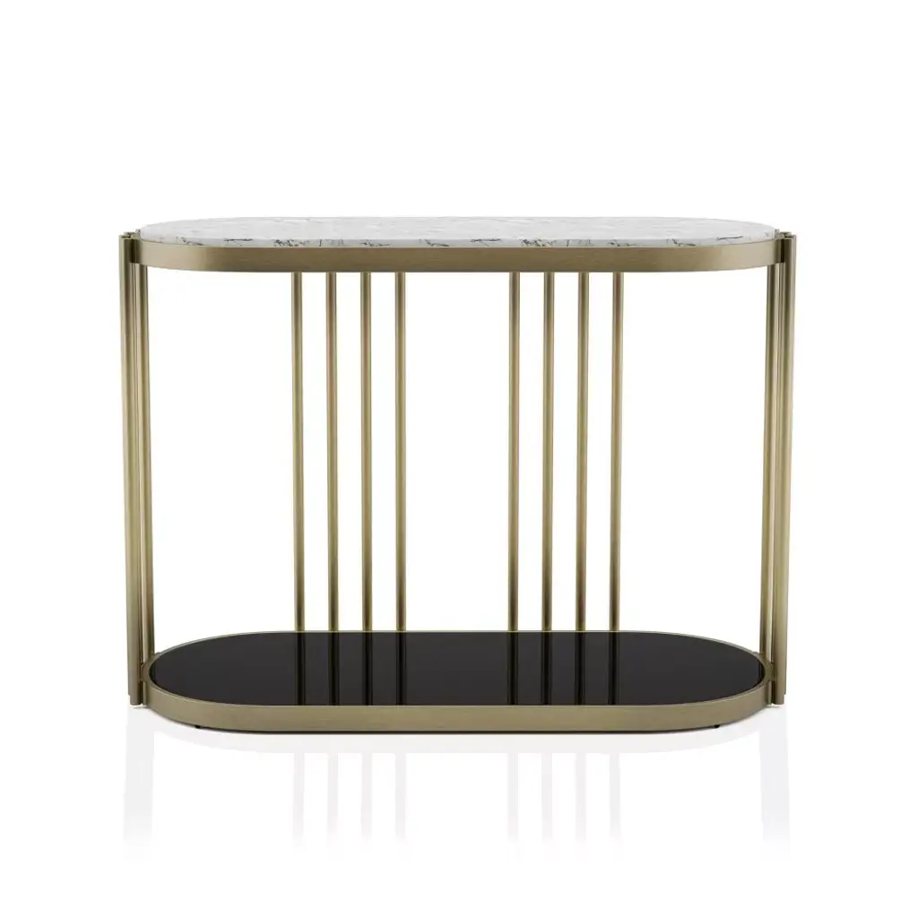 An antique brass plated steel frame holds a beautiful faux white marble tabletop and a sleek black tempered glass base on this sofa table. The mixed material inspired look is an elegant style with functional quality. Use the base as extra shelf space for decor in your entryway or any living space.