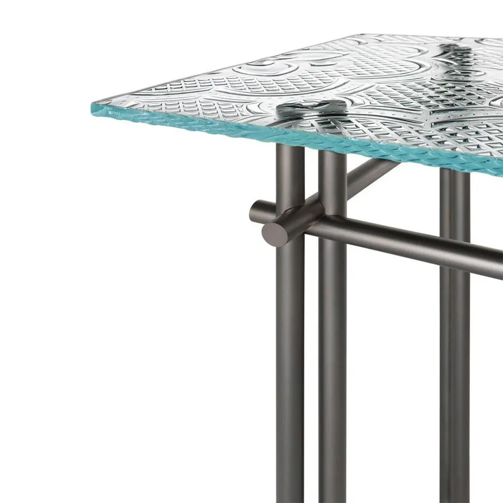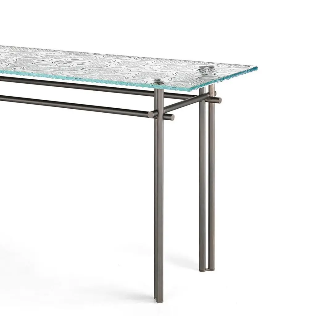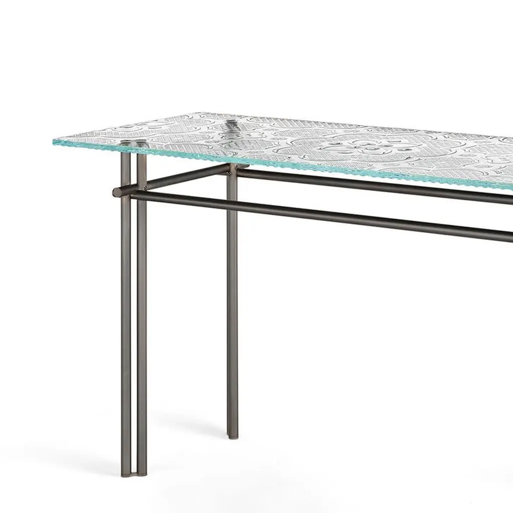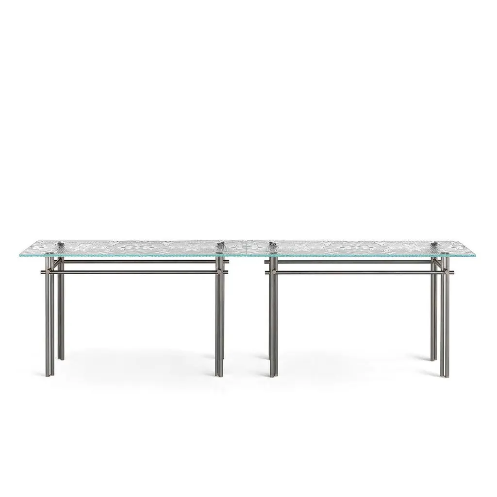 Console Table Source Glass with fused engraved glass top,15 mm thickness. With steel base in titane opaque dark matte finish.Also available on request in L147xD48xH75cm, price: 4690,00€Also available on request with white calacatta marble top, L130xD48xH75cm, price: 5290,00€L147xD48xH75cm, price: 5590,00€