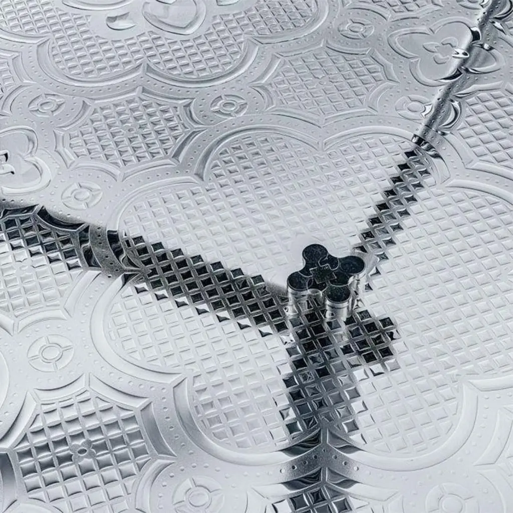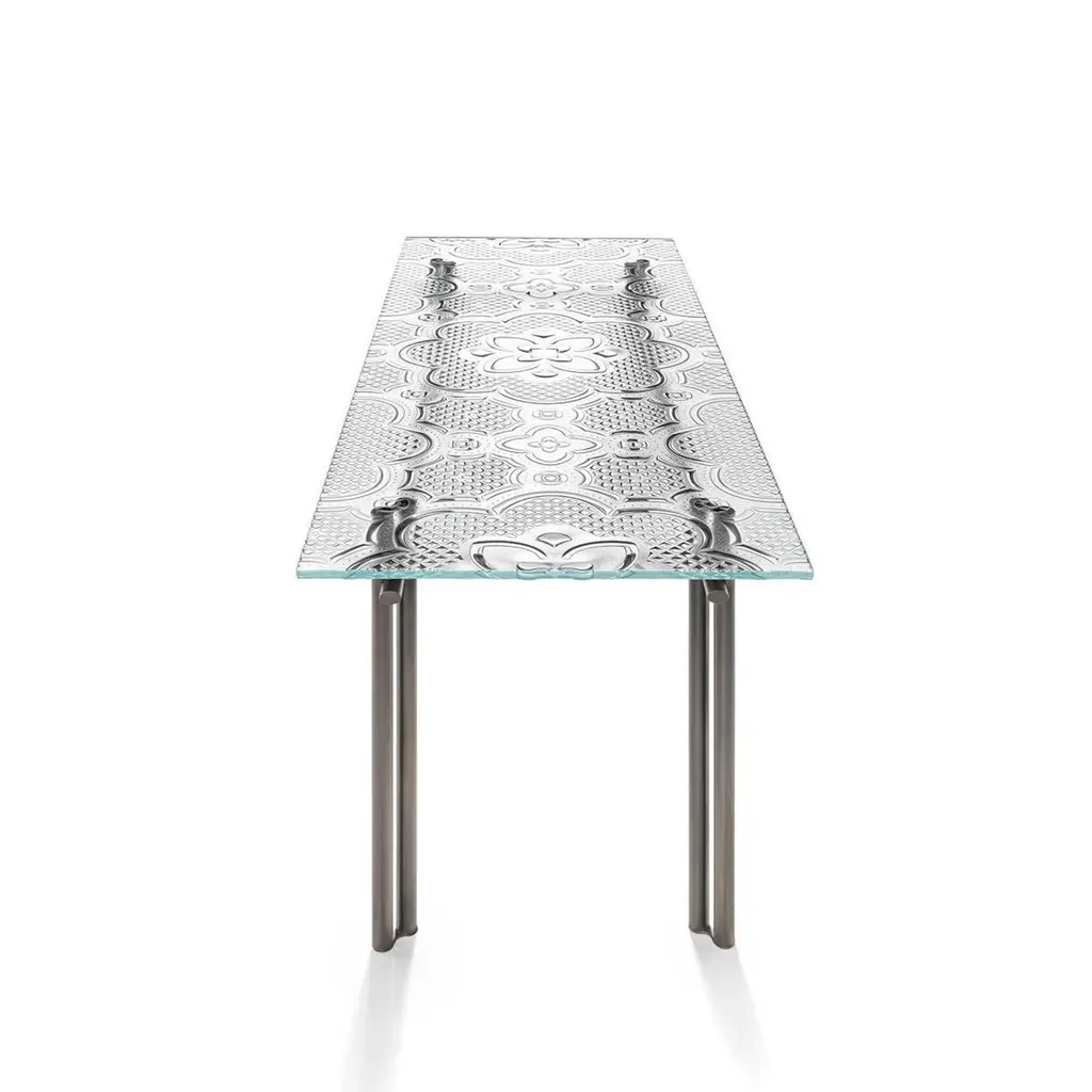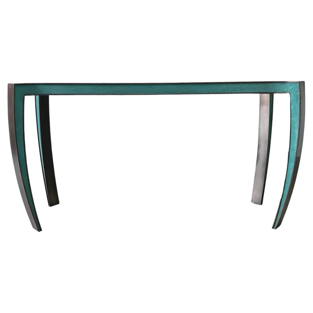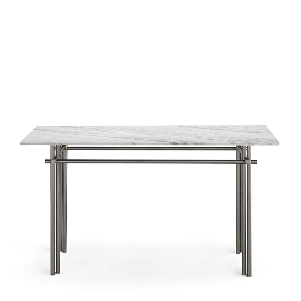 Console Table Source Glass with fused engraved glass top,15 mm thickness. With steel base in titane opaque dark matte finish.Also available on request in L147xD48xH75cm, price: 4690,00€Also available on request with white calacatta marble top, L130xD48xH75cm, price: 5290,00€L147xD48xH75cm, price: 5590,00€