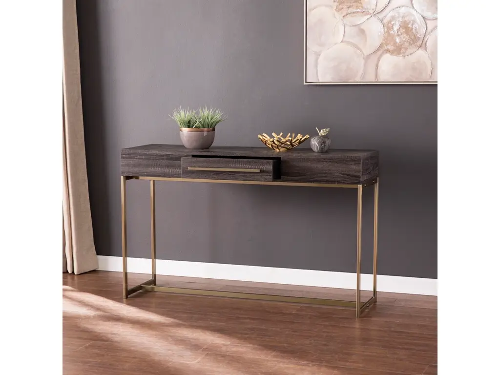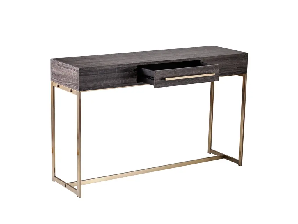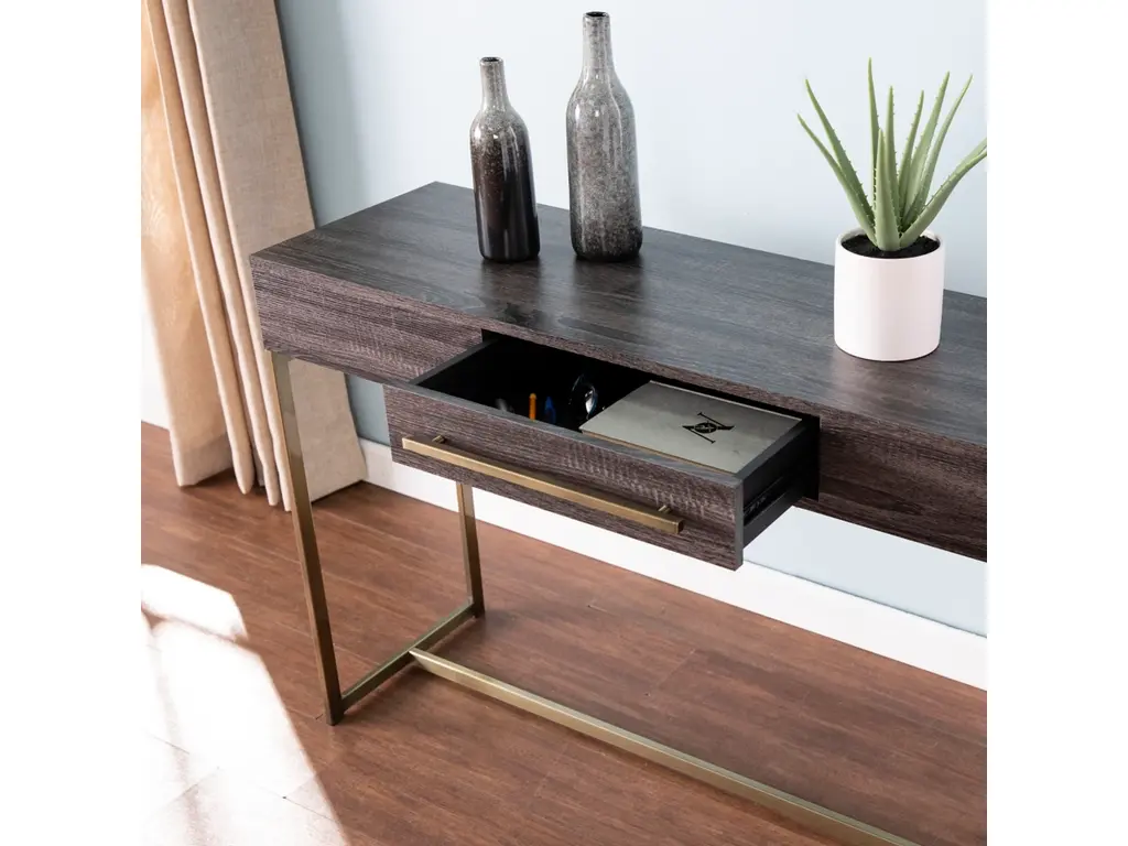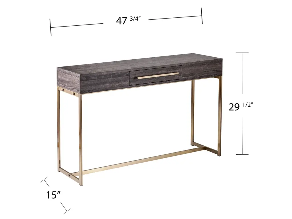 Stow everyday essentials with this narrow sofa table. A long tabletop provides a spacious landscape for potted succulents, modern decor or book collections, while a sleek storage drawer tucks away keys and mail. A shiny metal frame highlights the mixed-material construction and crafts a chic two-tone look in your hallway or living room. Slide this skinny console table behind your sofa to corral TV accessories and tonight’s movie marathon list, or station in your entry to make a stylish first impression.