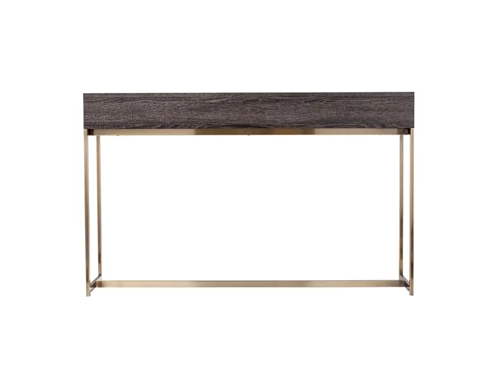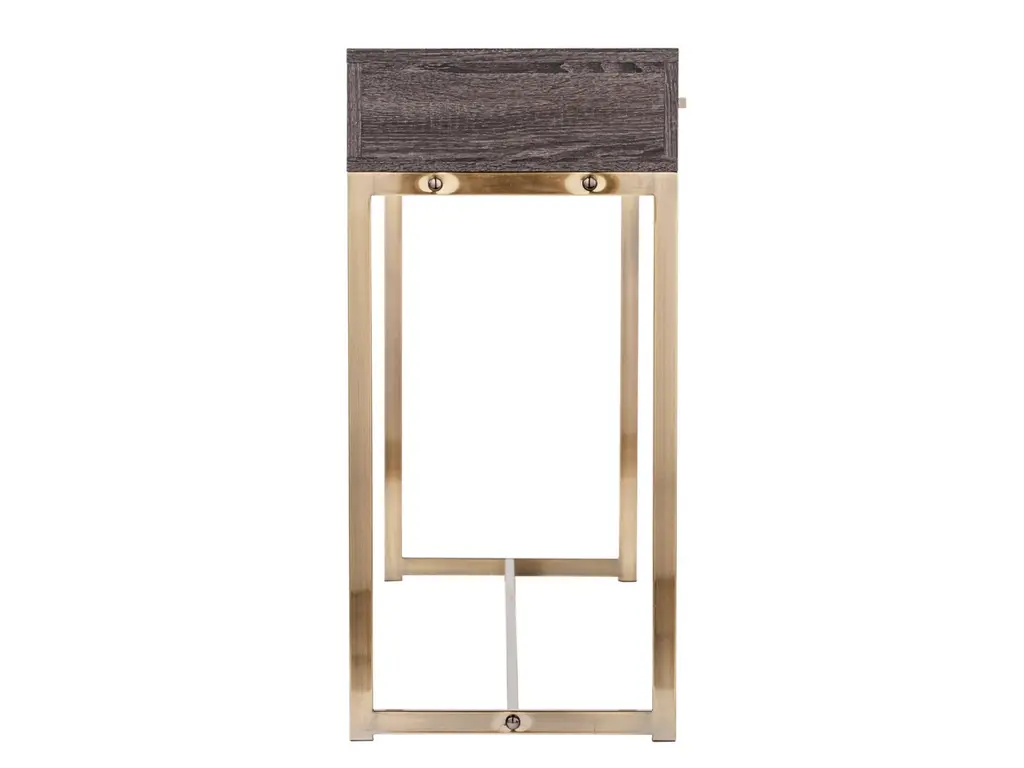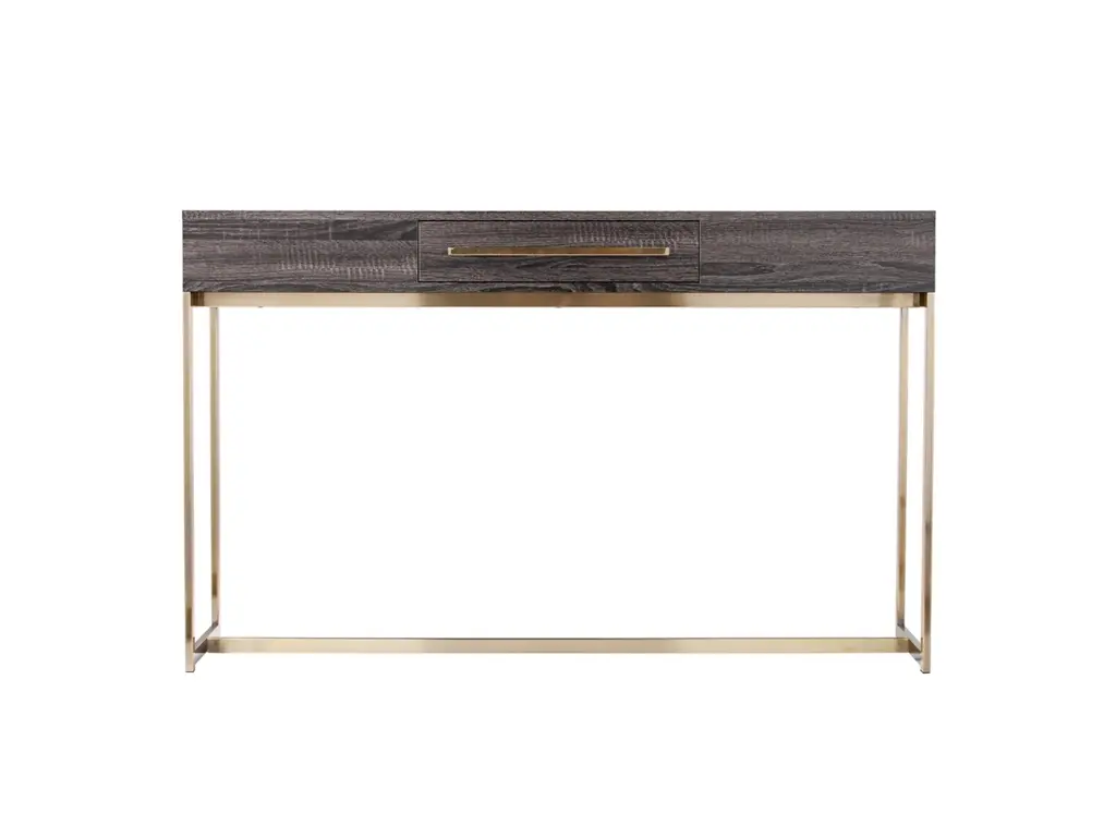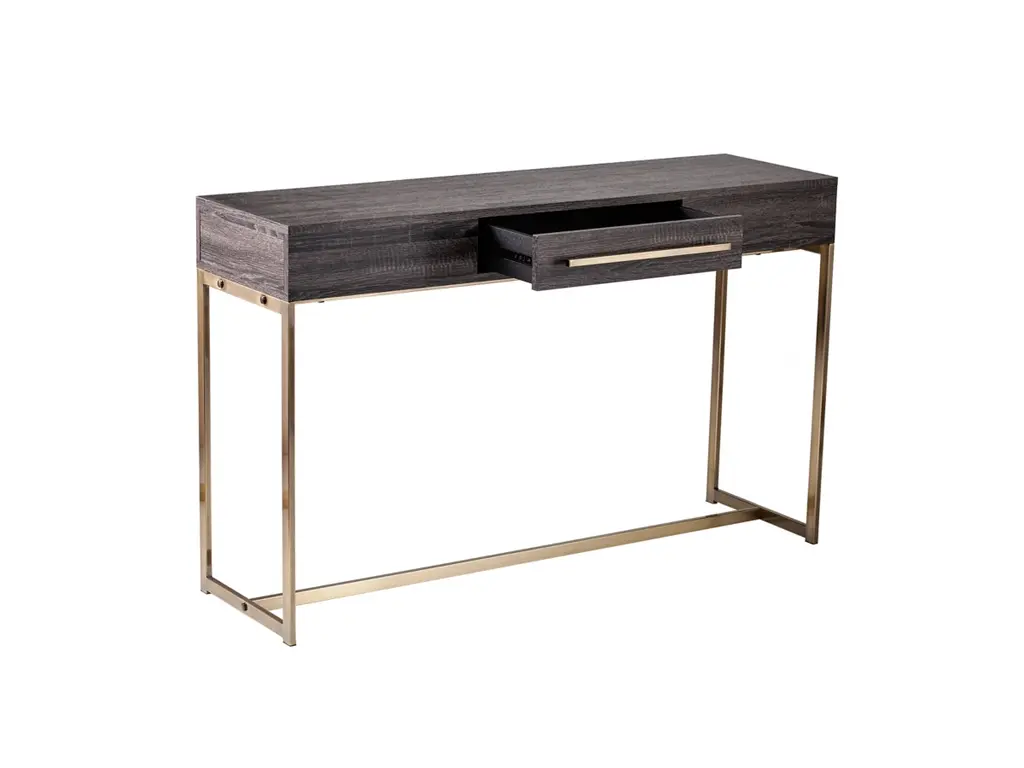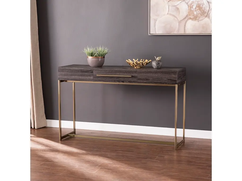 Stow everyday essentials with this narrow sofa table. A long tabletop provides a spacious landscape for potted succulents, modern decor or book collections, while a sleek storage drawer tucks away keys and mail. A shiny metal frame highlights the mixed-material construction and crafts a chic two-tone look in your hallway or living room. Slide this skinny console table behind your sofa to corral TV accessories and tonight’s movie marathon list, or station in your entry to make a stylish first impression.
