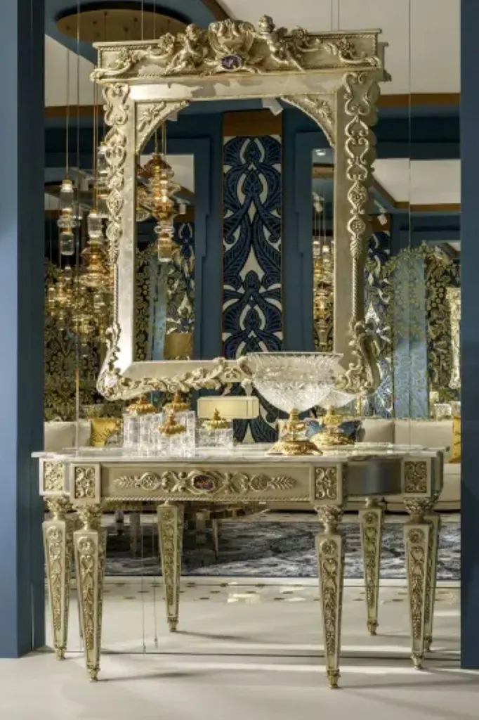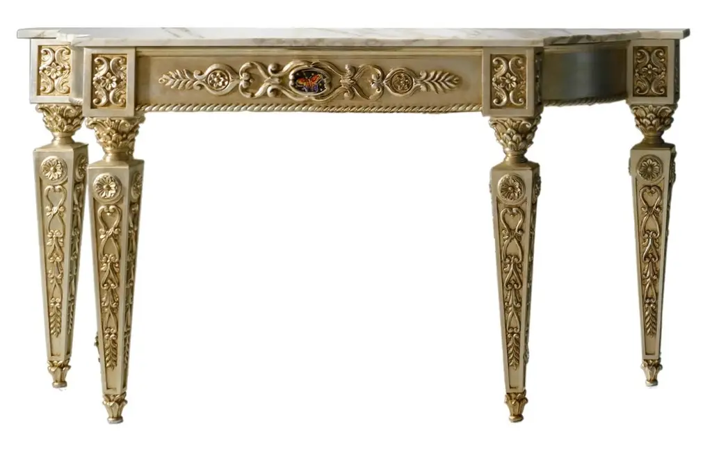 Console inspired by the Empire style characterised by square column legs with Doric-Corinthian capitals, carved decorations of garlands of leaves and rosettes.MaterialsIn patinated silver champagne finish. Frame in Strobo Pine and Lime wood, top in Calacatta gold marble. Optional: insert in minute artistic mosaic.
