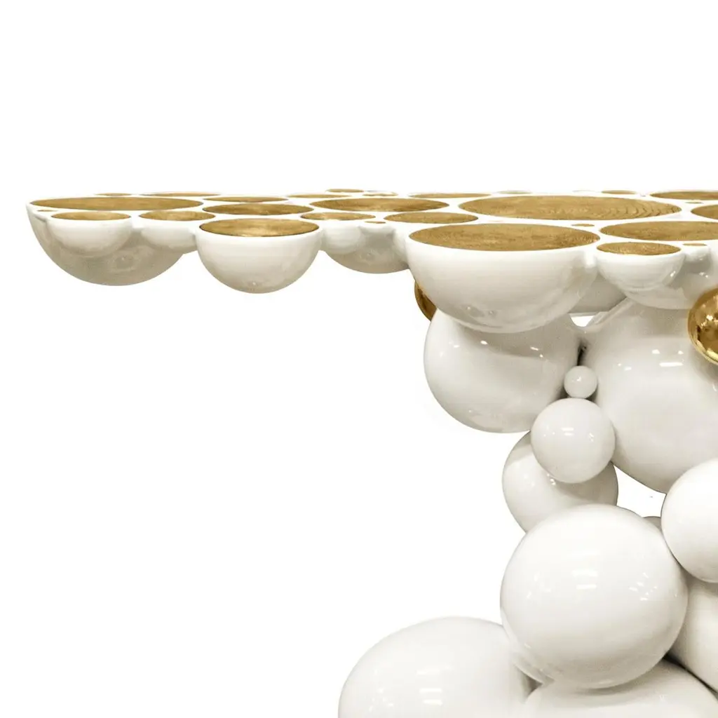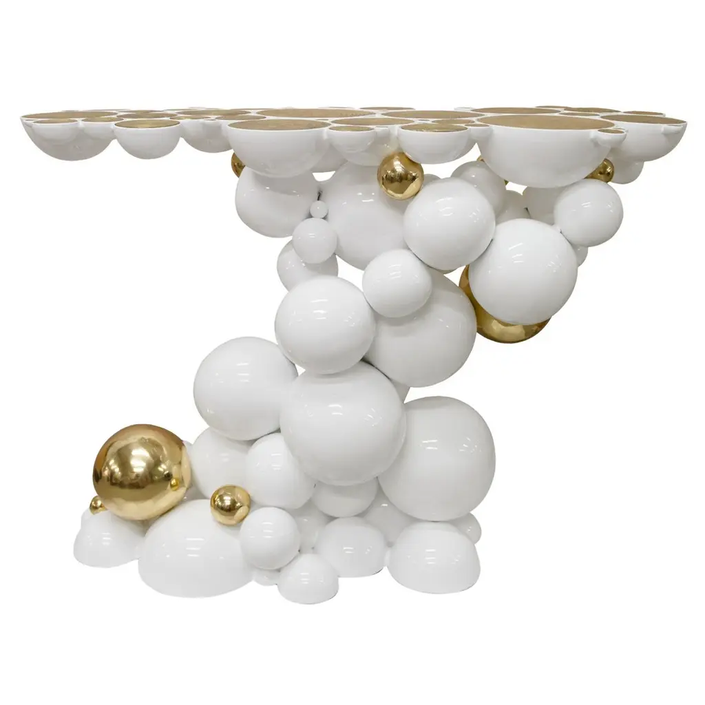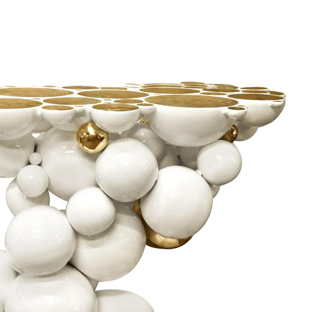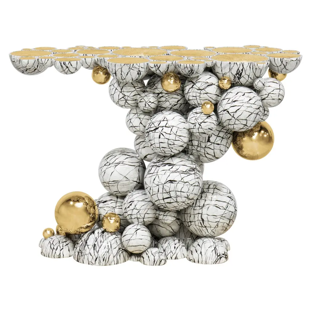 Console table spheres composed by metallic spheresand semi spheres joined together. Aluminium white varnishand gold finish.Also available in Black finish.