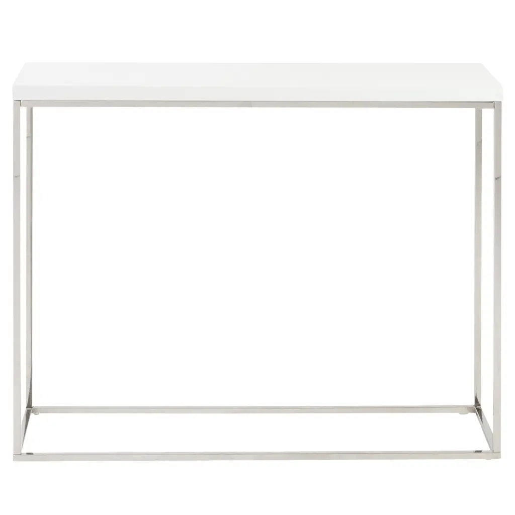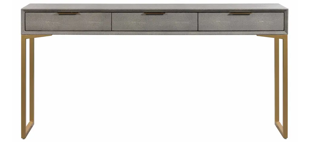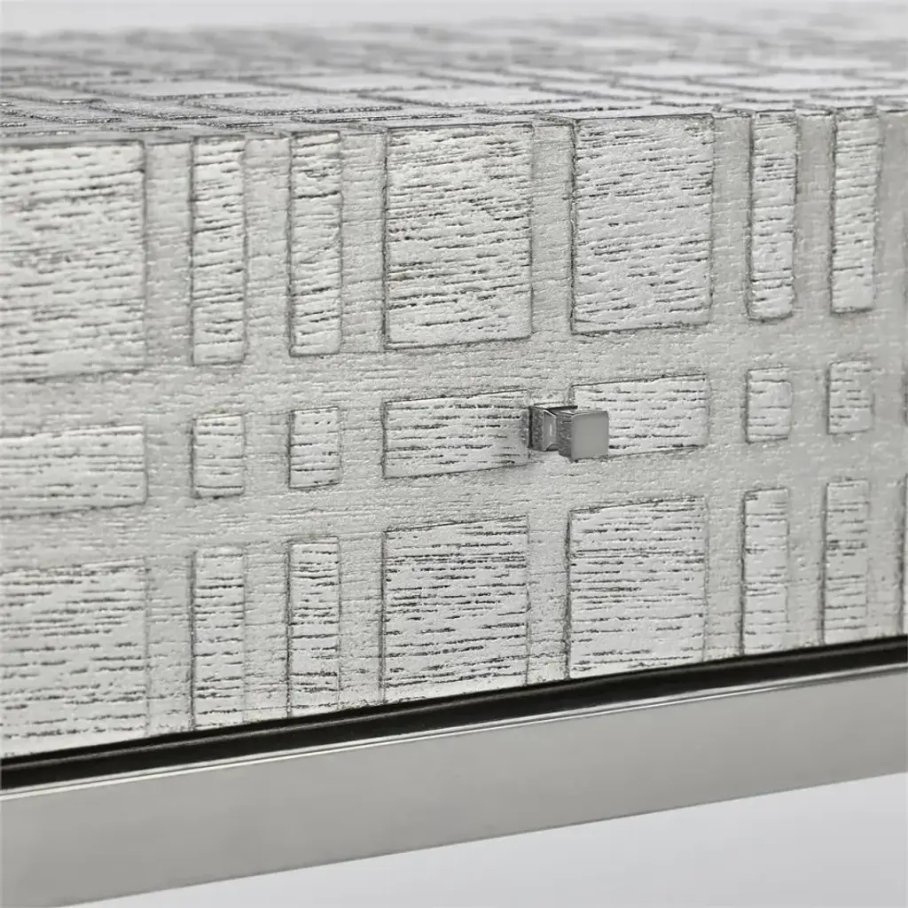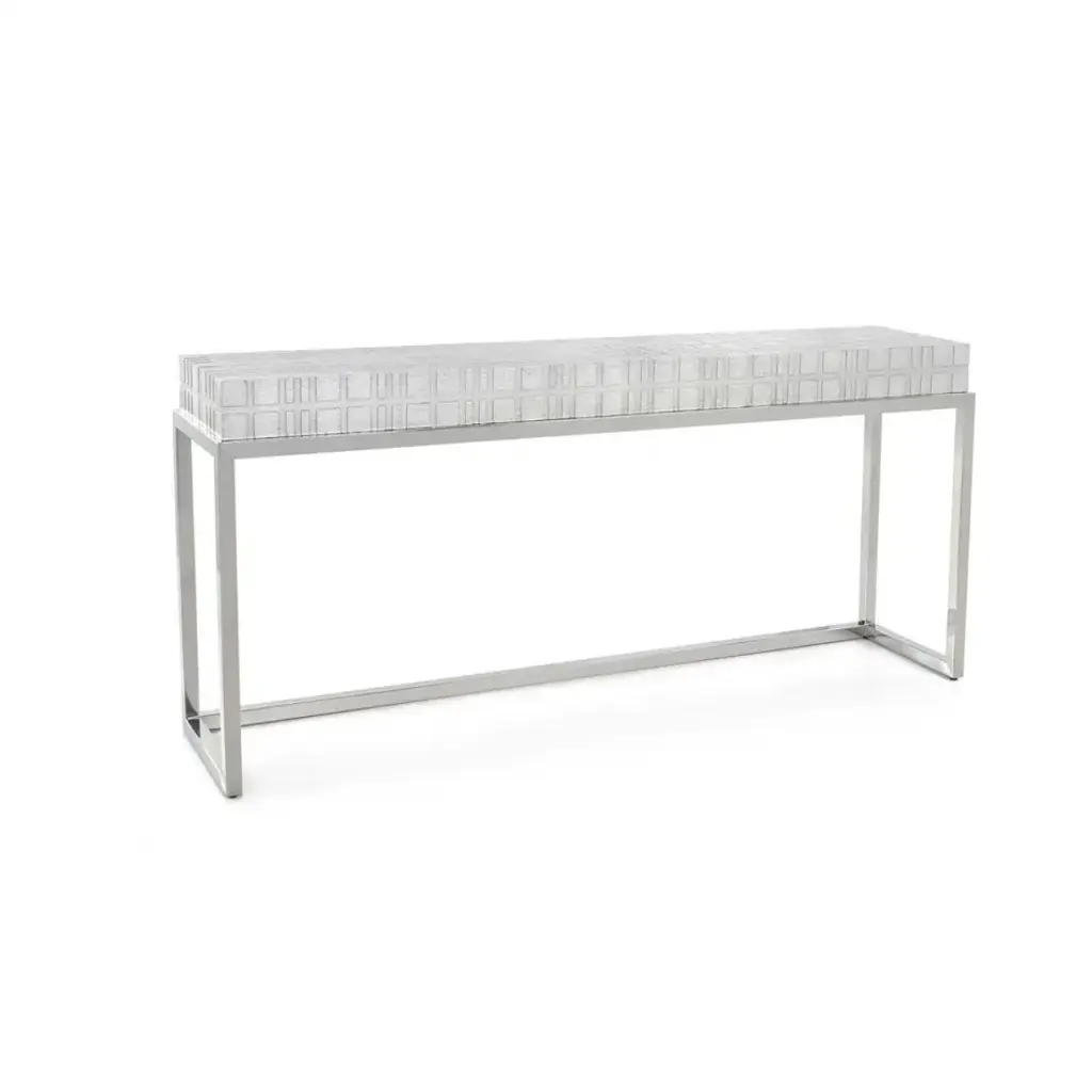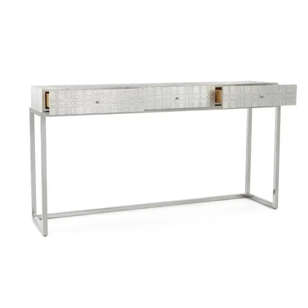 The Staccato Console Table is a sleek, contemporary design statement with stylish textural depth. An open, geometric base of Polished Stainless Steel supports an oak wood surface in Silver Steel. The tabletop features a stylish pattern of intersecting grooves, as well as three drawers with Polished Stainless Steel handles.