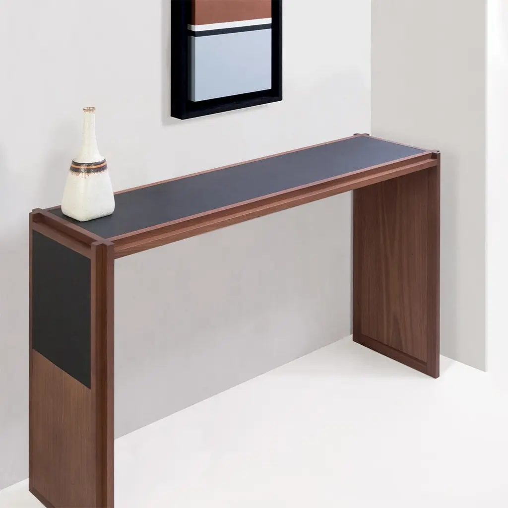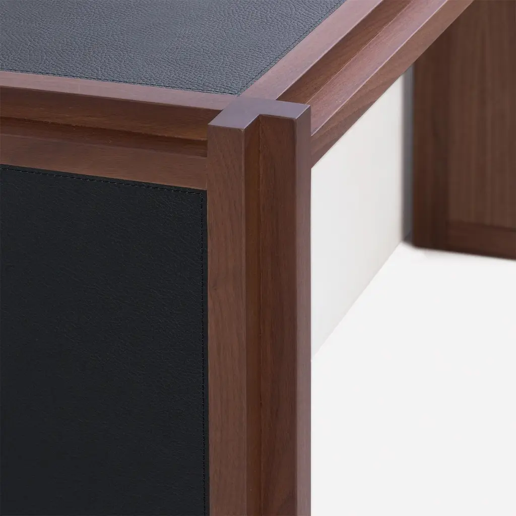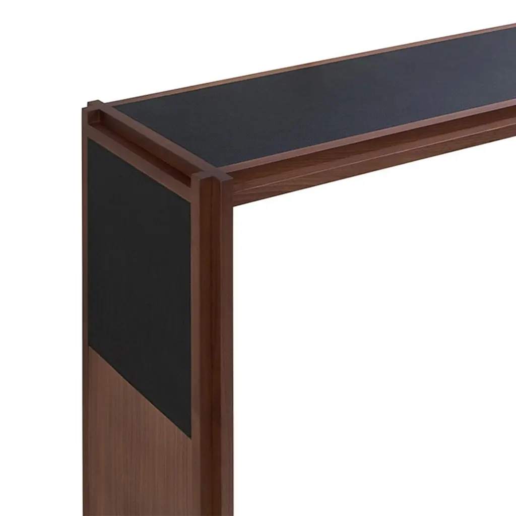 Console Table Straps Walnut with structure in solid walnut in natural walnut finish.Top and feet's up parts made with genuine black leather. Also available with structurein wenge stained finish.