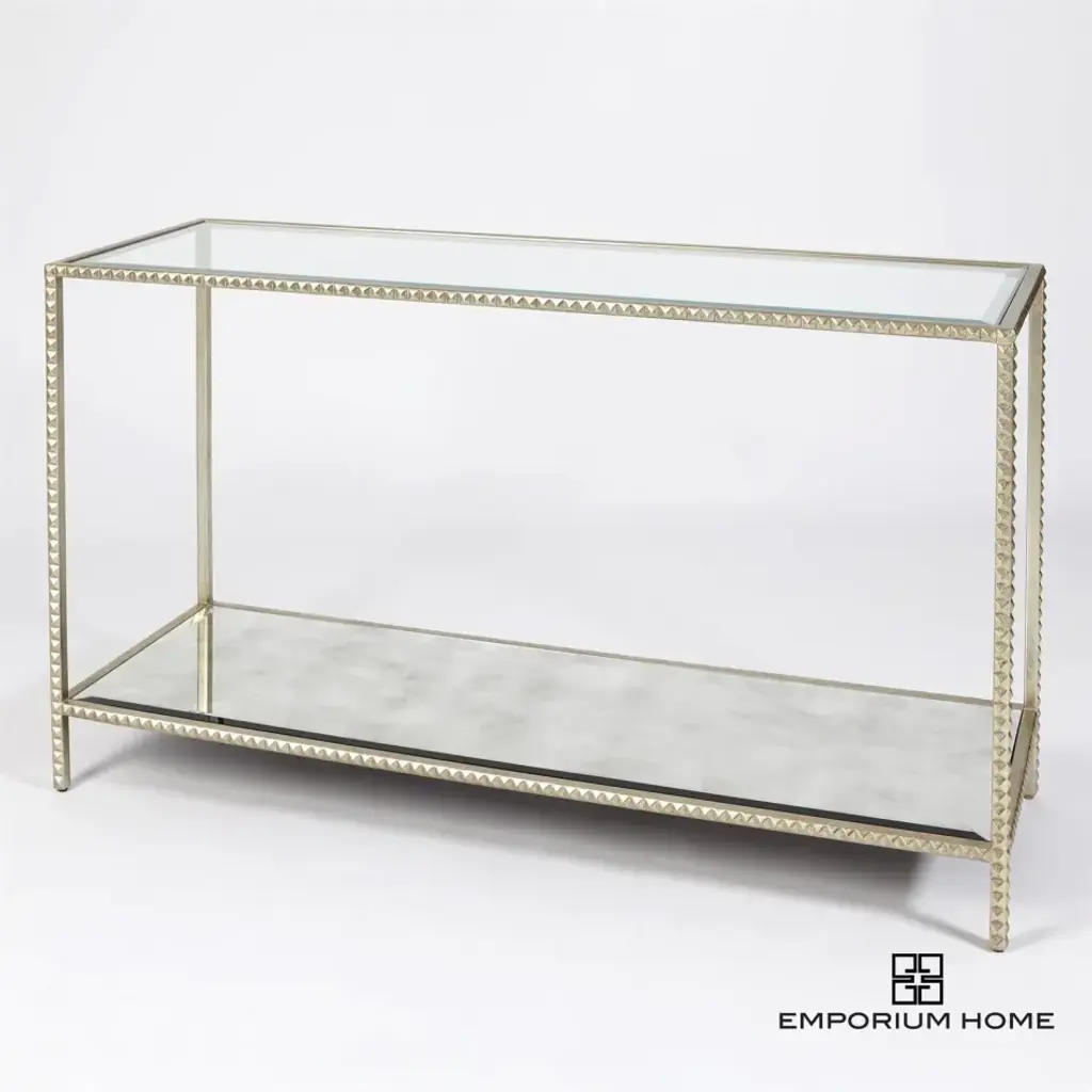 Our Stud Console Table brings the artistry of hand cast iron to a new level with a unique and on trend design element. Tiny pyramid studs line the entire frame of this design, all gleaming with a hand gilded silver leaf finish. Topped off with a clear glass top and an antique beveled mirror shelf, this table will add the perfect pop of rock and roll chic to any space. From a fashion forward perspective, Global Views offers accessories, furniture, statement lighting, and an assortment of rugs and mirrors to add beauty and joy to your home.