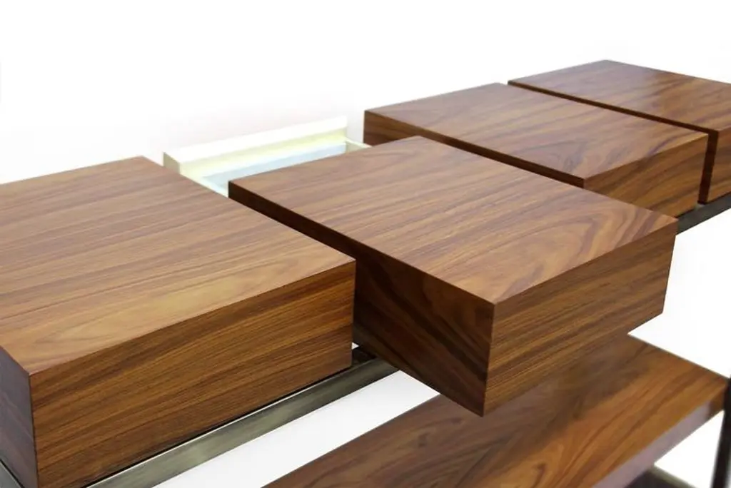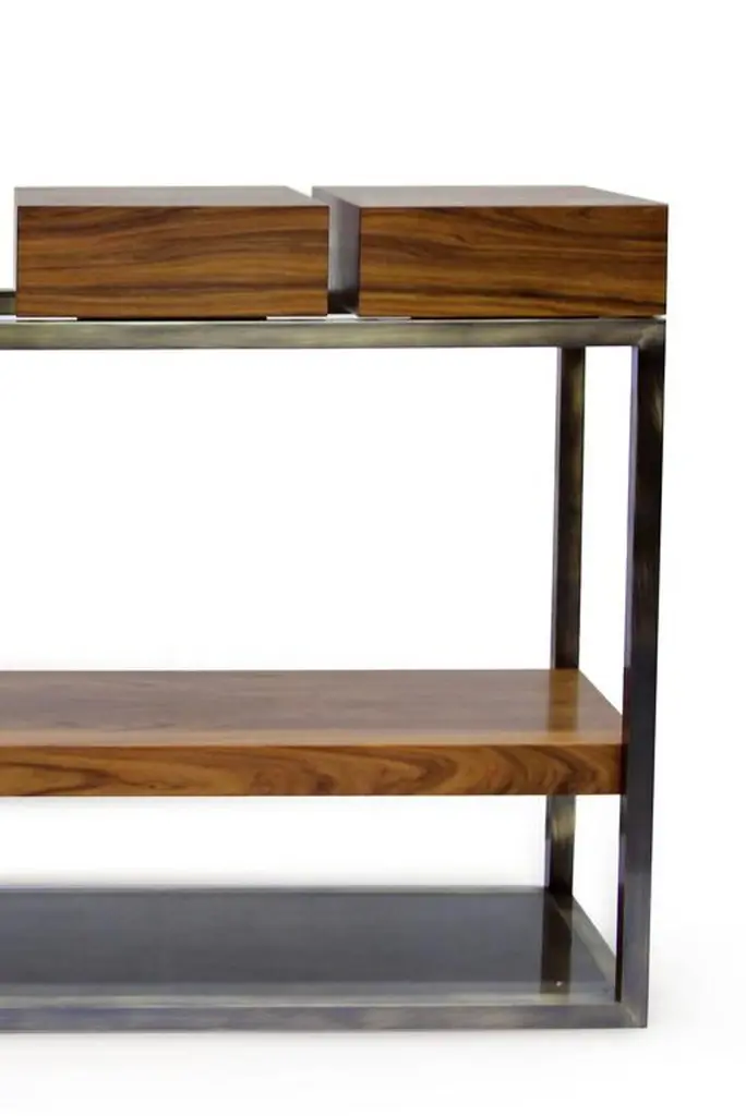 Subtle console table is a modern piece made withan antique brushed brass structure. 4 drawers and 1 shelf in poplar wood veneer with palissander wood.