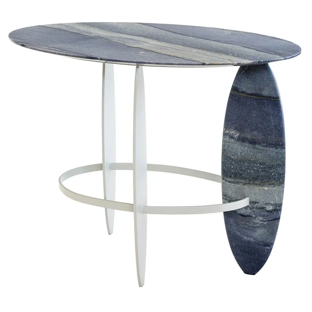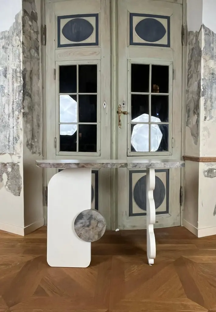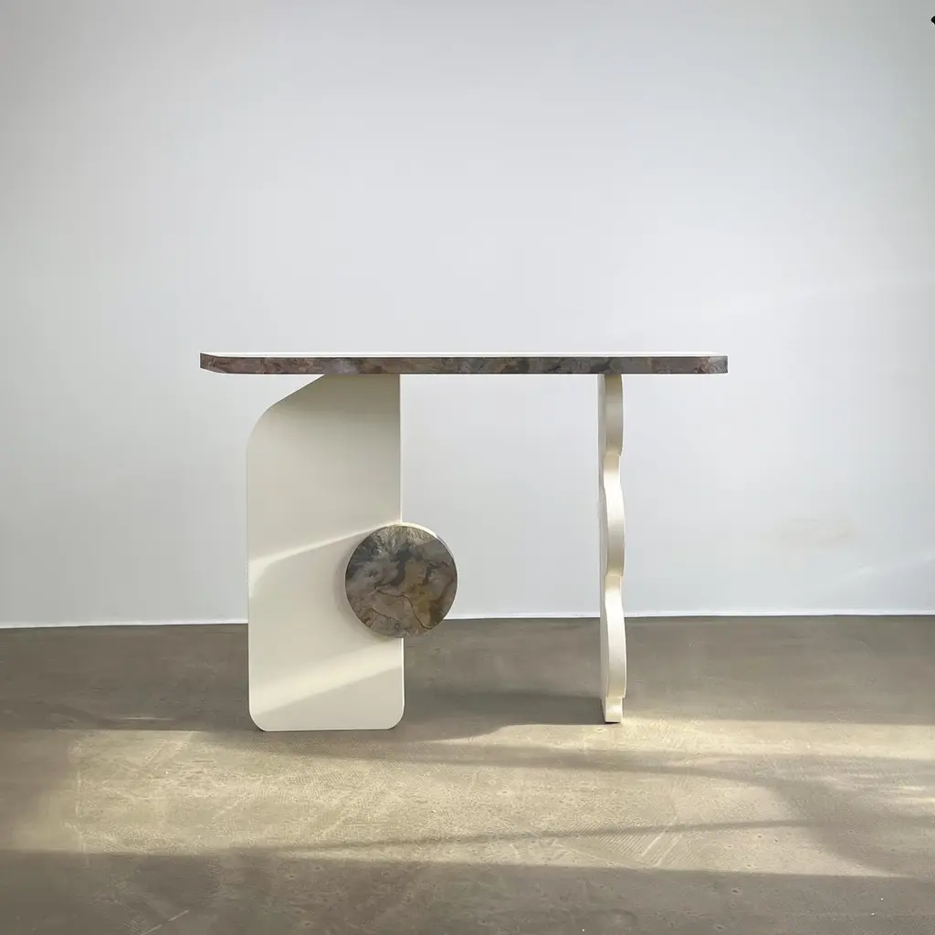 Subtle Ecru Puzzle Console Table by MajbeleDimensions: D 36 x W 122 x H 90 cm.Materials: Stone veneer, oak veneer, MDF.The Puzzle collection is intriguing entertainment with unconventional forms that are born from the transformation of basic geometric shapes. The furniture from this collection fascinates with its shapes, which, interwoven with each other, create a coherent, multidimensional structure. Each piece of furniture becomes a kind of puzzle, the solution of which involves discovering new, fascinating shapes that change depending on the observer's perspective. Looking at these pieces of furniture is like exploring the mysterious world of forms and their subtle connections. The console from the Puzzle collection is a multi-layered and fascinating form that exudes both complexity and subtlety. In a combination of classic, natural materials such as wood and stone, the console becomes a symbol of extraordinary elegance and durability, transcending the boundaries of time. Together with its unique structure, which hides unexpected shapes and details, this console becomes not only an intriguing piece of furniture, but also a timeless work that delights with its mysteriousness at every glance.Majbele is a brand that was born out of a passion for unusual forms and unique design. We create items that are unique, memorable, carrying a history of uniqueness, both for creators and customers. We want our furniture to be an extraordinary element of many interiors, to which, regardless of their style, they will introduce a sense of humor combined with elegance and beauty of objects created by hand, with passion.The brand's founders are a married couple who share a love for unique forms. We are a combination of technical knowledge and experience, with creative energy, which we express through the production of furniture. We believe that furniture is a unique field of art that introduces the same emotions into everyday life as paintings or sculptures - it can entertain, encourage reflection or simply be beautiful. Their strength, however, lies in the closeness of relationships with people - it is art that combines with functionality and inspires every day, during everyday activities, which can become an amazing story thanks to them.