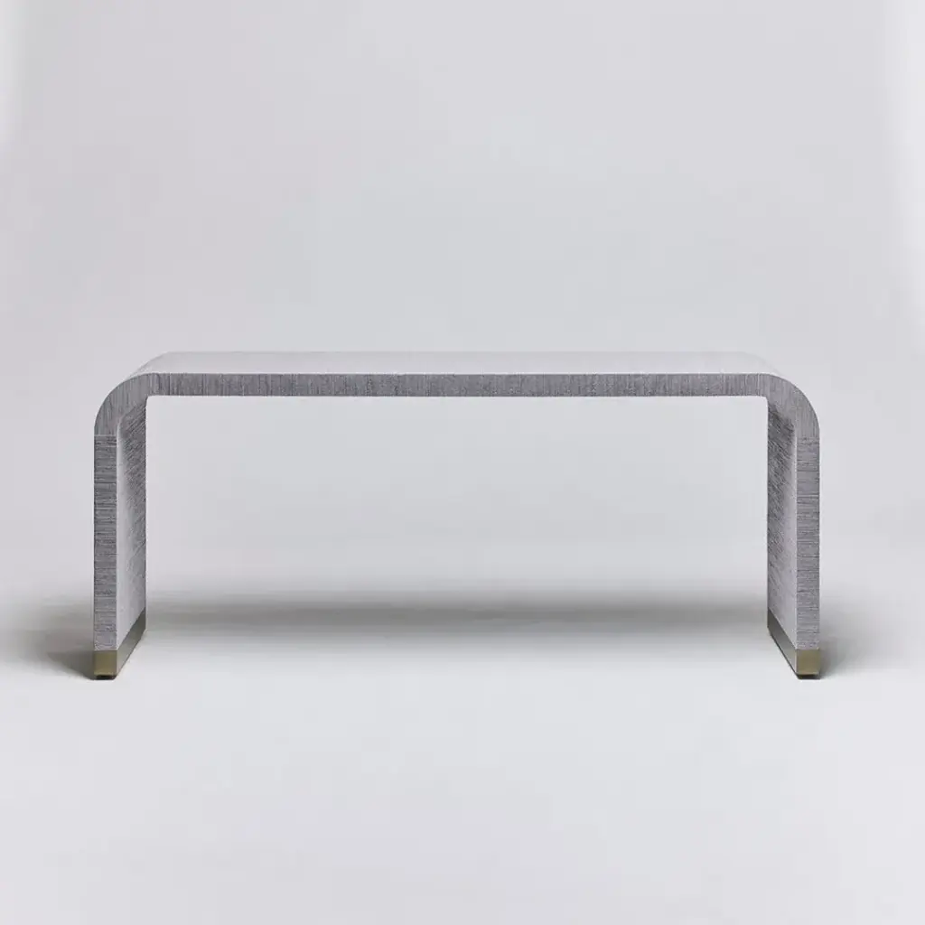 Undeniably high style, the Sutherland Console Table features the organic texture of mist sisal highlighted by iron fittings in champagne silver. Sisal is made from hand-woven strands of natural fibers on a rice paper backing. The texture and coloration of all natural fibers will vary and will patina with time and use. Each piece will have its own charm, character and coloration and should be celebrated for its uniqueness.