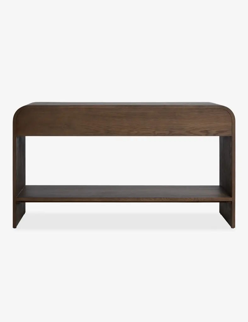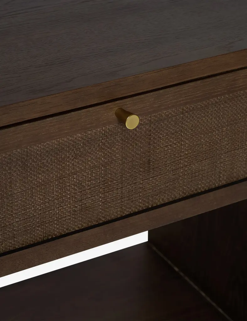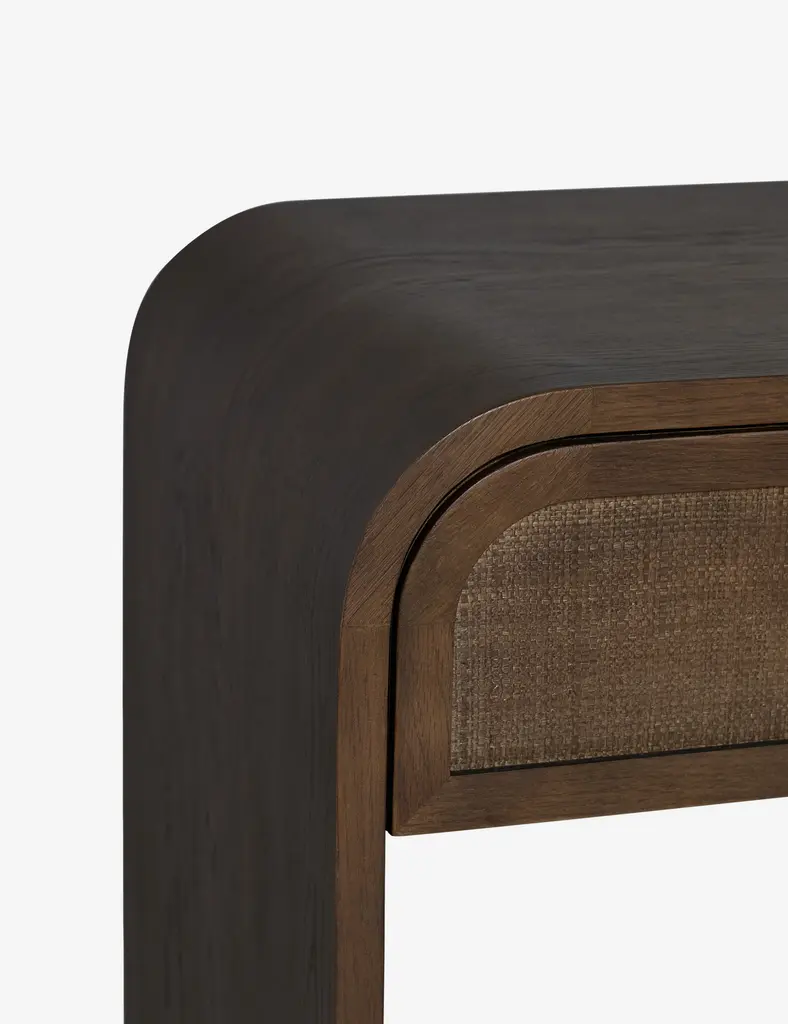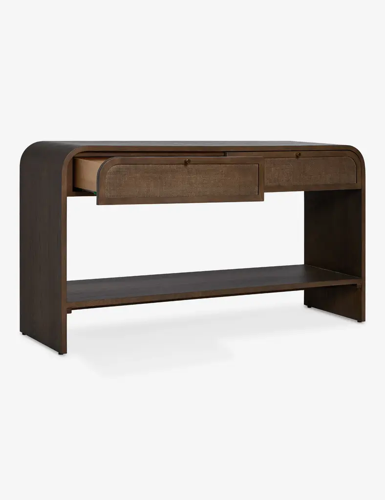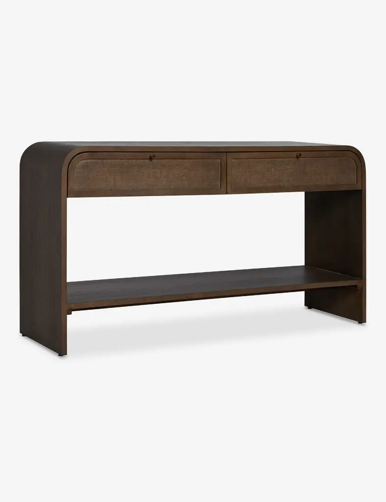 Keep it timeless for a look that's always fresh with Suzette. The collection's rounded oak frames feature grasscloth paneling for a soft, airy feel full of natural texture appeal. With two soft-close drawers and an open lower shelf, this modern console table offers storage and surface space with a stylish edge.