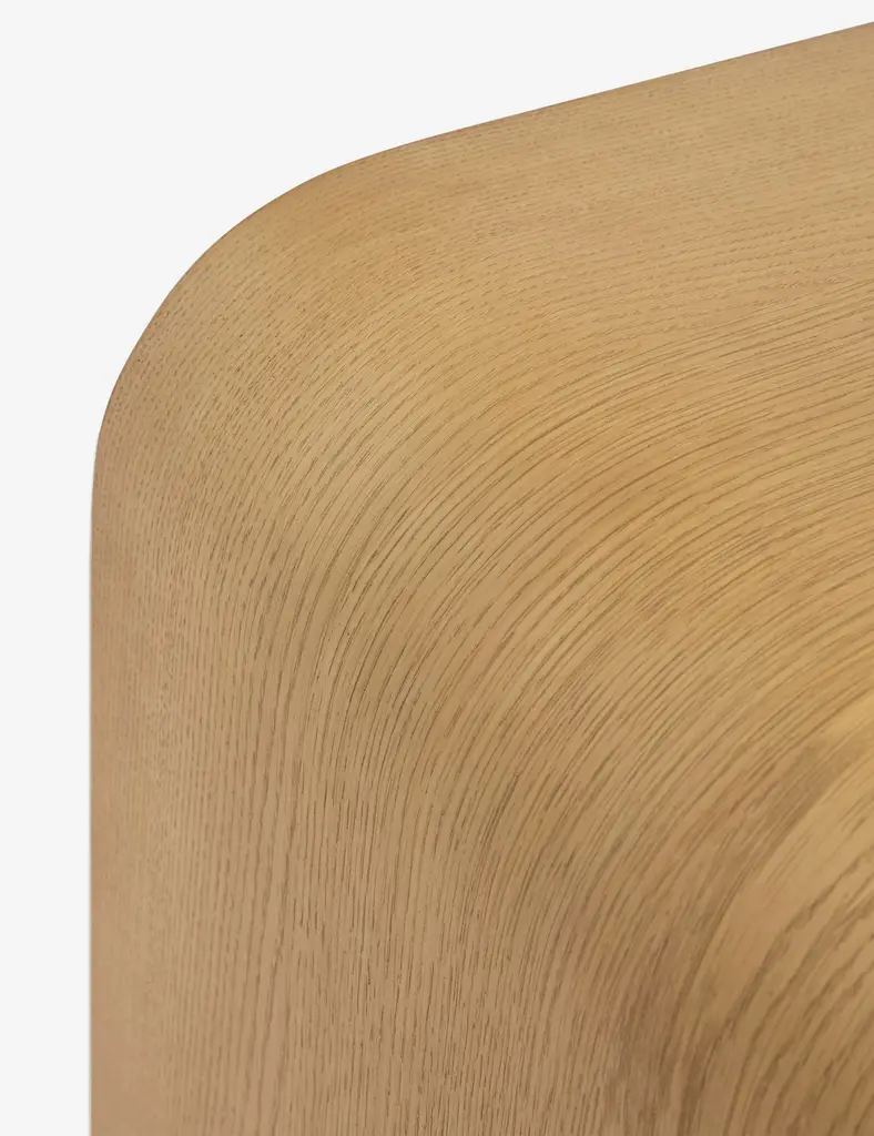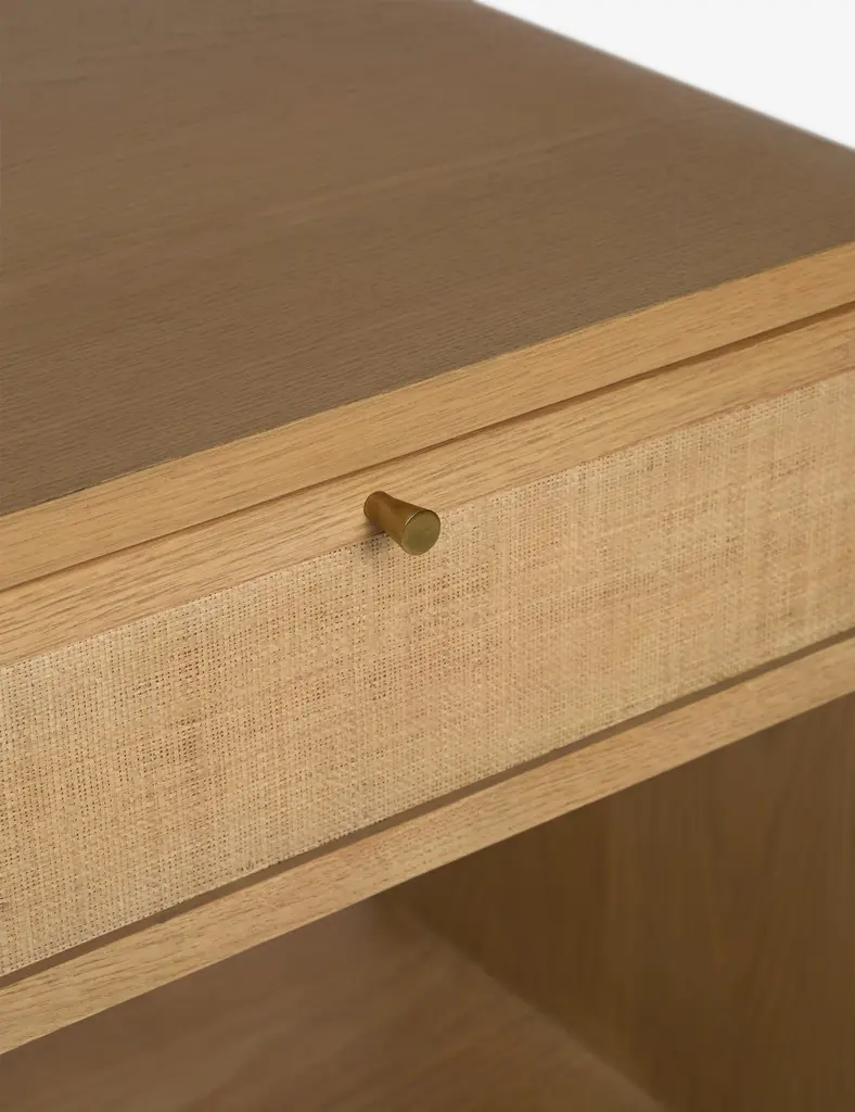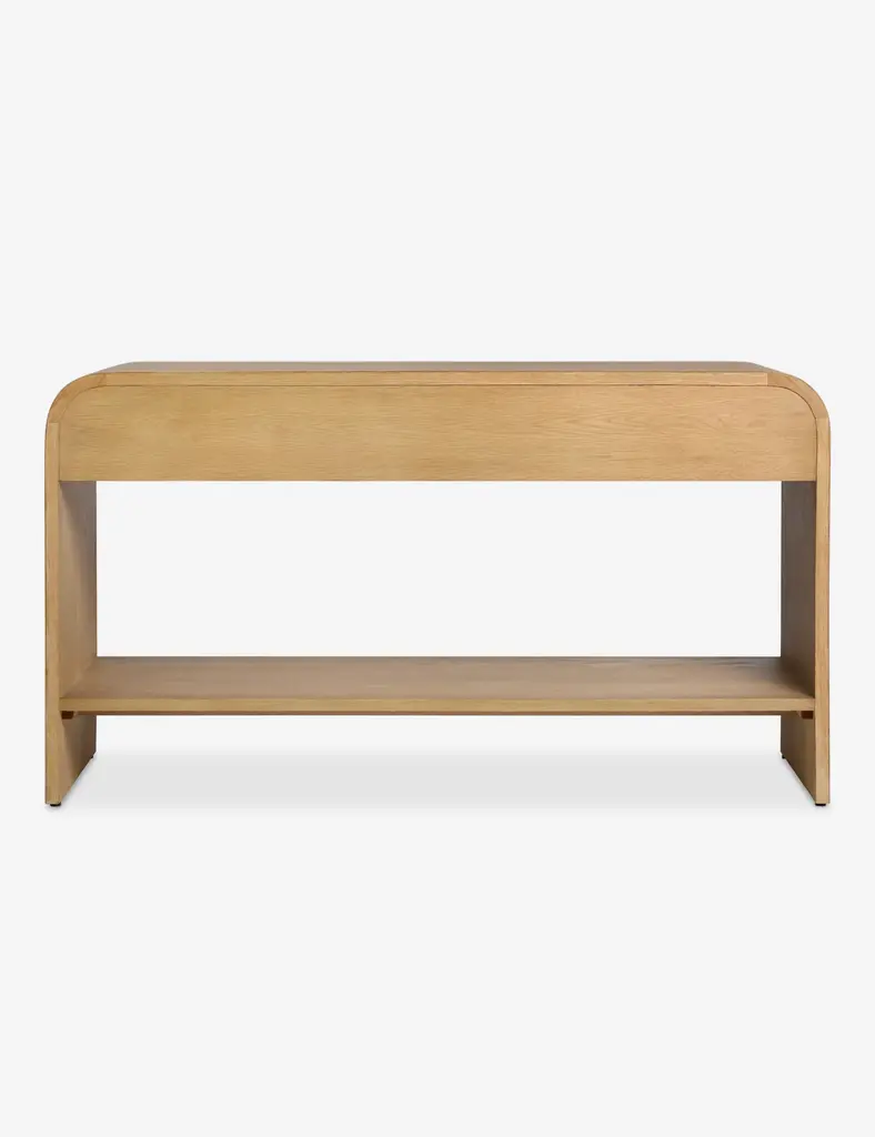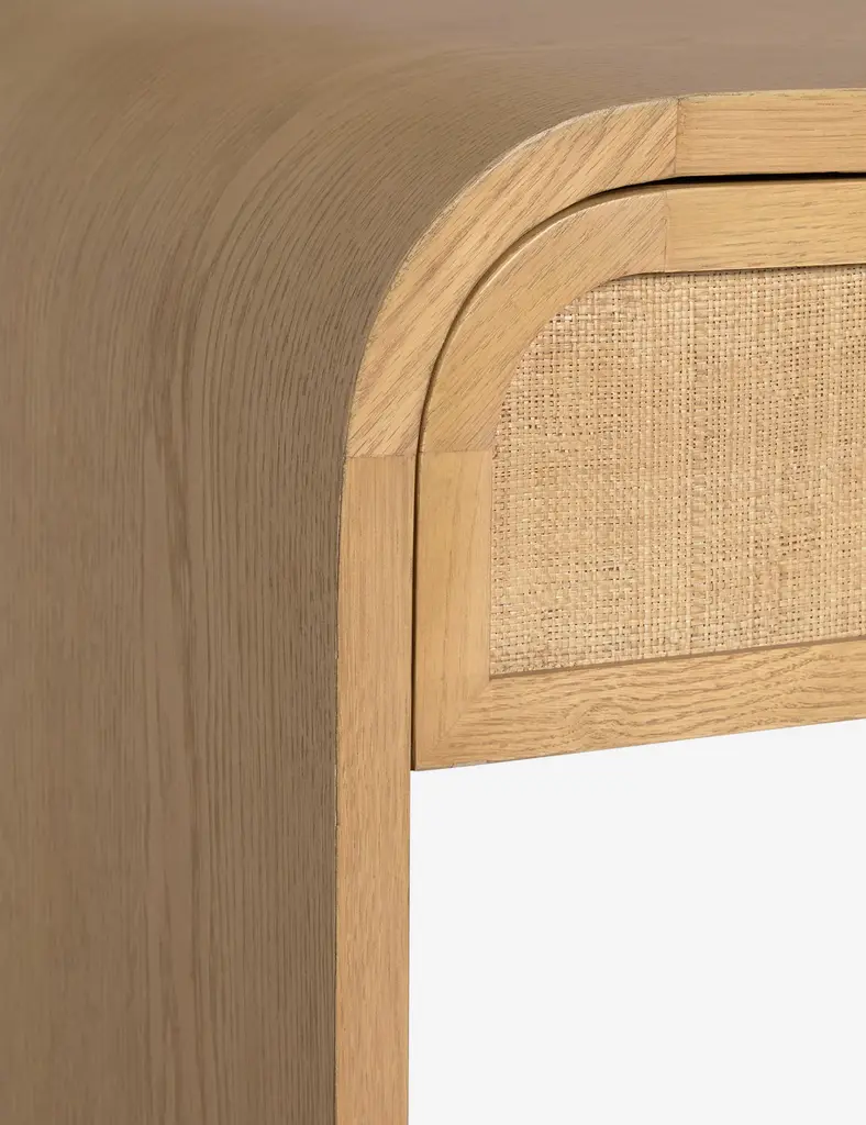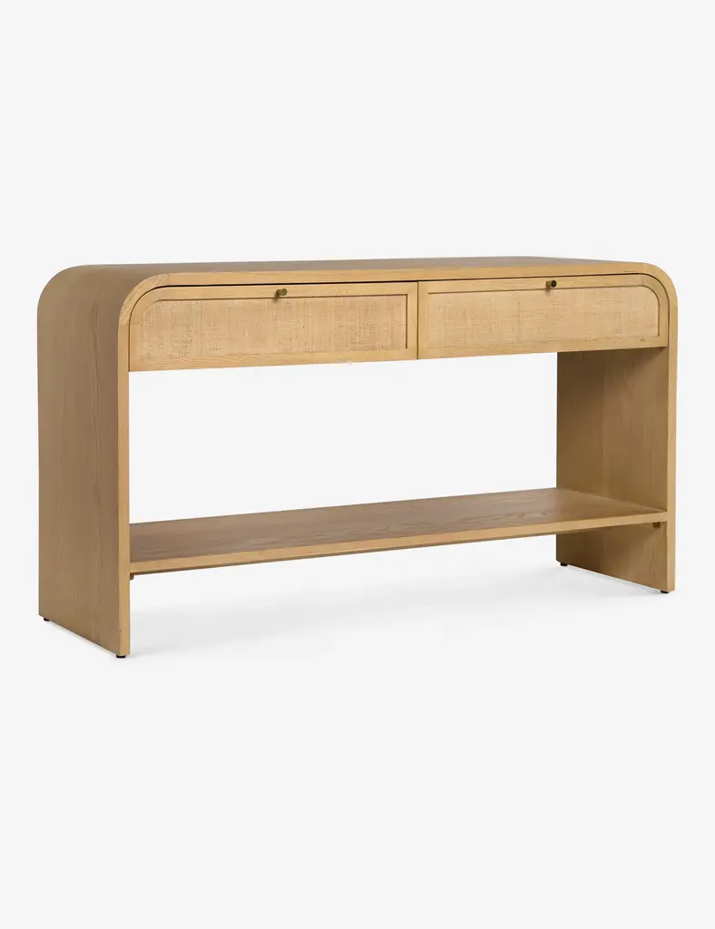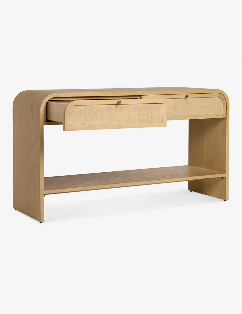 Keep it timeless for a look that's always fresh with Suzette. The collection's rounded oak frames feature grasscloth paneling for a soft, airy feel full of natural texture appeal. With two soft-close drawers and an open lower shelf, this modern console table offers storage and surface space with a stylish edge.