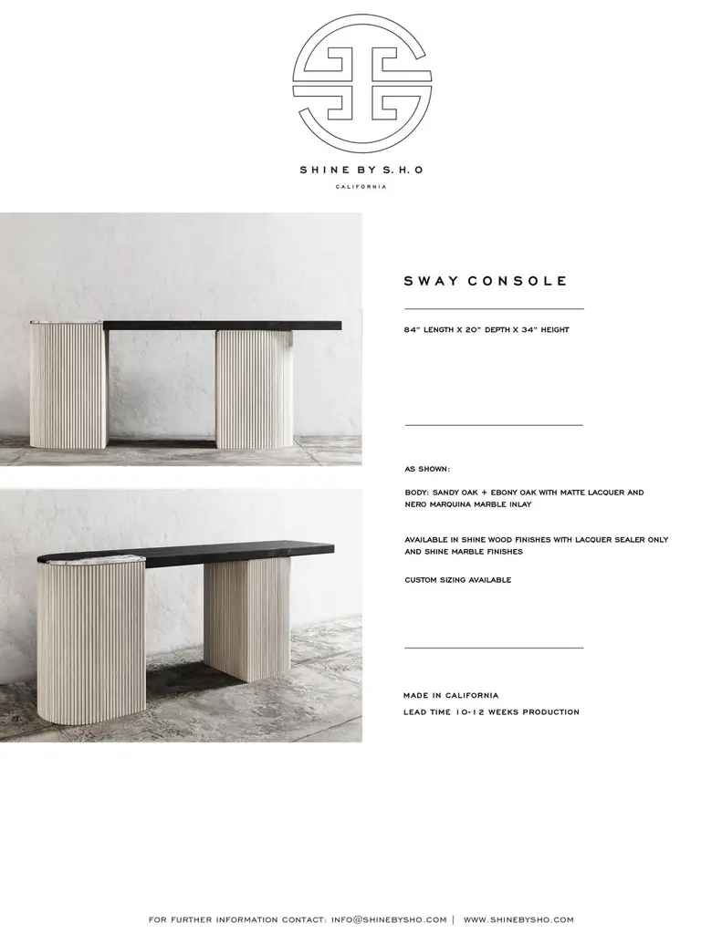 SWAY CONSOLE - Modern Design with Sandy & Ebony Oak, Nero Marquina MarbleThe Sway Console is a stunning and modern piece of furniture that is perfect for any contemporary living space. Crafted from high-quality Sandy Oak and Ebony Oak wood, this console features a Nero Marquina marble inset that adds a touch of elegance and sophistication to the design.The console is designed with clean lines and a minimalist aesthetic, making it a perfect fit for any modern decor.The Sandy Oak and Ebony Oak wood frame of the Sway Console is finished with a clear matte lacquer that enhances the natural wood grain and provides durability and protection. The console's sleek and contemporary design has a simple and elegant silhouette that will complement any interior style.The Nero Marquina marble top adds a touch of luxury and sophistication to the piece while providing a practical surface for displaying your favorite decor items or using them as a workspace.Overall, the Sway Console is a beautiful and functional piece of furniture that is perfect for any modern living space. Its high-quality materials and sleek design make it a wise investment for any homeowner looking to elevate their home decor.The Sway Console can be customized as to size and wood as well as with and without a marble inset.