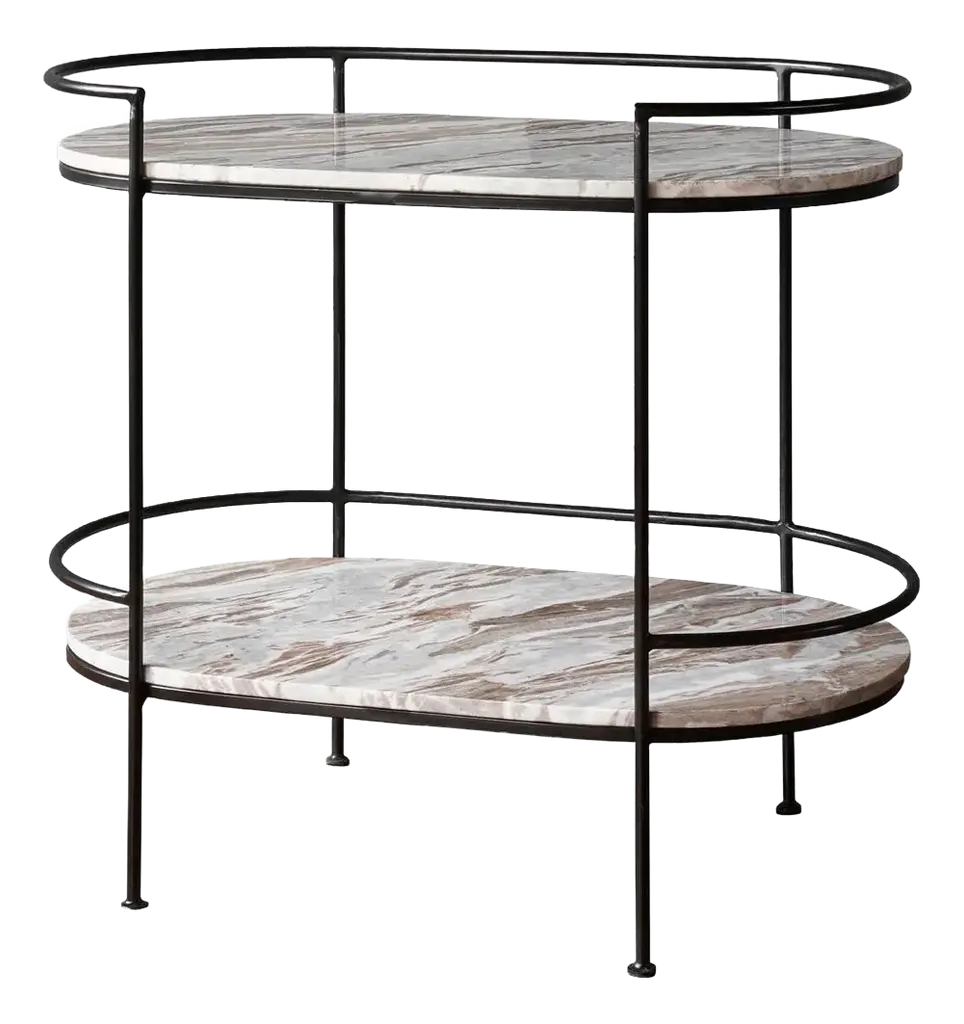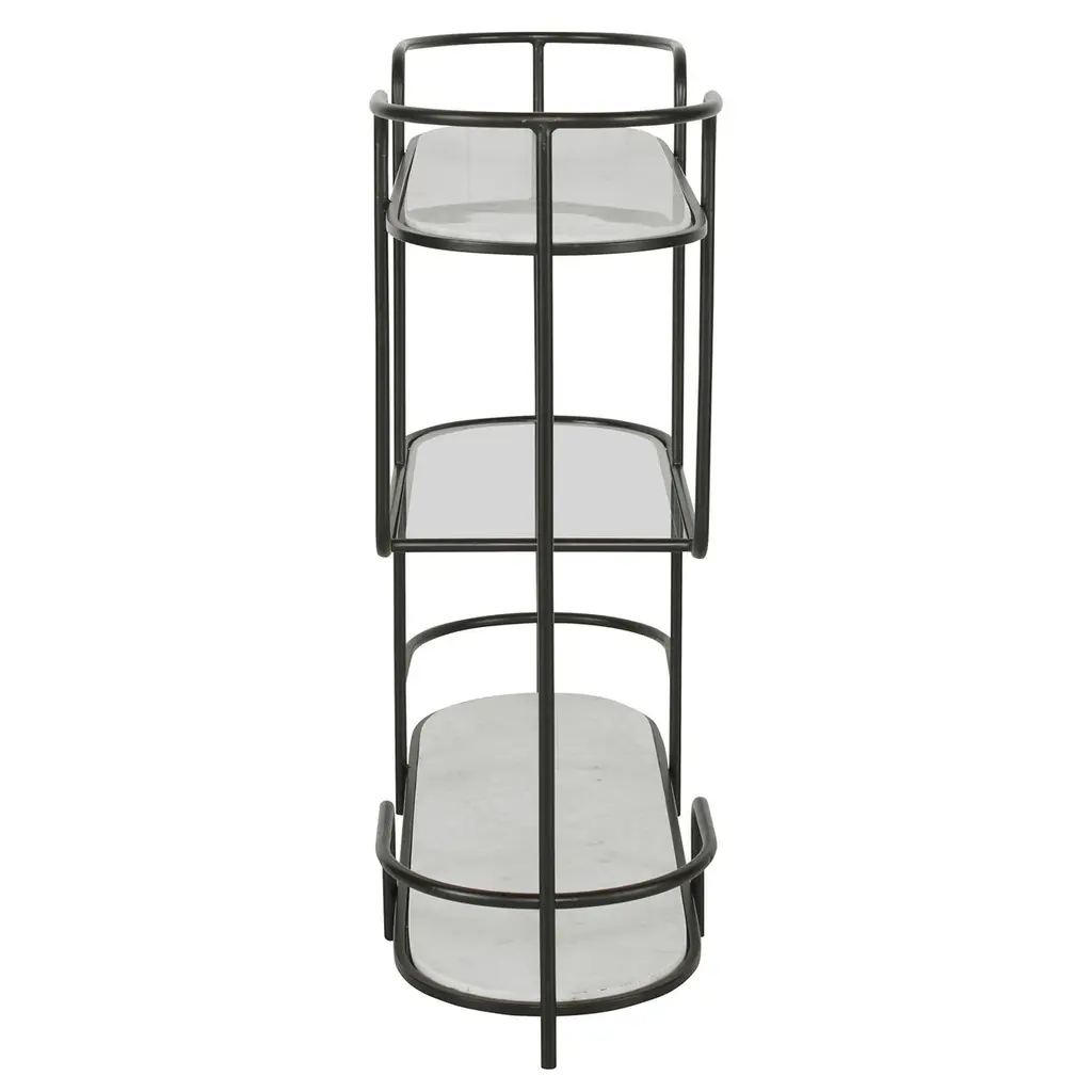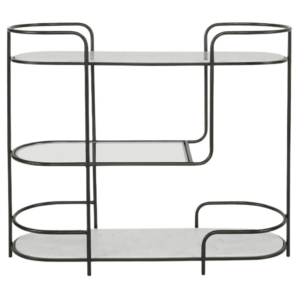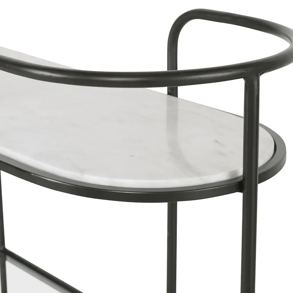 Inspired by a harmonious blend of classic mod design and contemporary styling, this exquisite piece is a testament to versatility and elegance. It gracefully transitions between a bar, server, or console table, making it a perfect addition to any sophisticated space. The gracefully curved iron frame exudes a timeless charm, while the luxurious marble and tempered glass shelving add a touch of opulence. Each piece is a unique masterpiece, with the natural veining of the marble ensuring that no two are alike. This multifunctional marvel is not just furniture; it's a statement of style and refinement, inviting admiration and conversation in any setting.