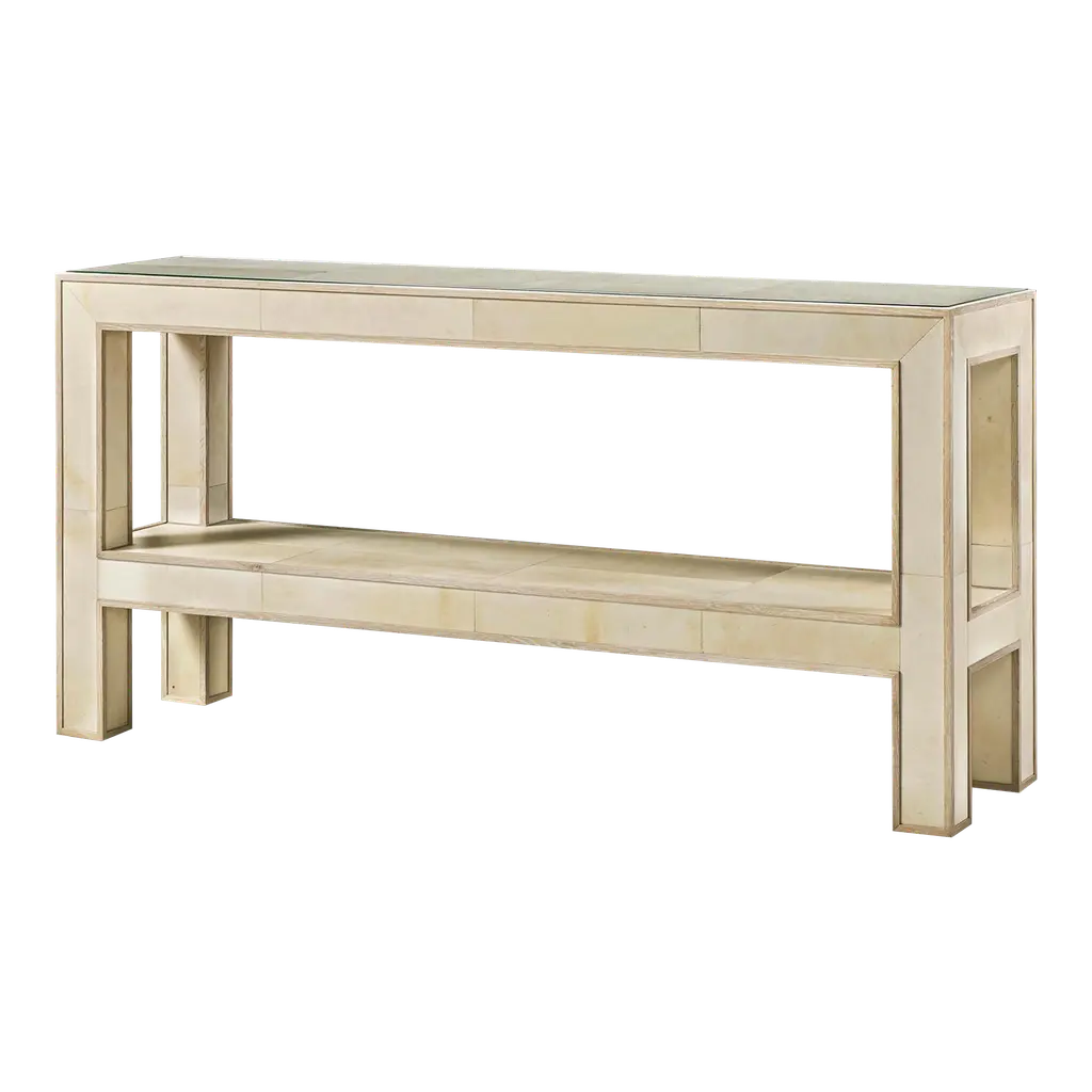 Open and alluring, this distinctive console table makes a bold statement. Its airy design is elegant in its simplicity and features an exquisite metal fret-patterned shelf that can be seen through its glass top. Tall metal legs reach skyward and support its clear glass top with 1 ¼” bevel. Finished in Taupe Paint and Taupe Silver Lear, it’s perfect for behind a sofa or anywhere you need a touch of elegance.