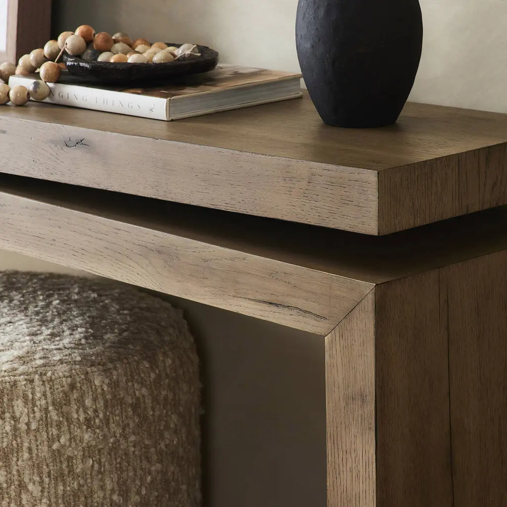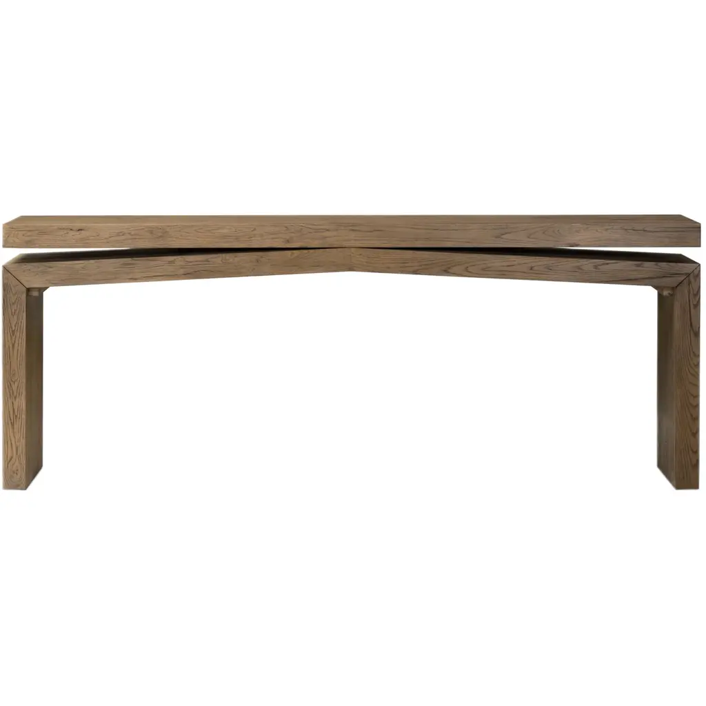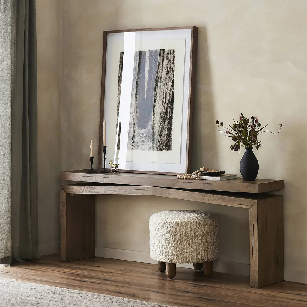 The Tenera Console Table - 79" is a masterpiece of simplicity and elegance, designed to highlight the natural beauty of its veneer top. Its streamlined form creates a sense of delicate balance, gracefully poised over a subtly angled base. This console table is a perfect blend of form and function, offering a sophisticated touch to any space while maintaining a minimalist aesthetic.