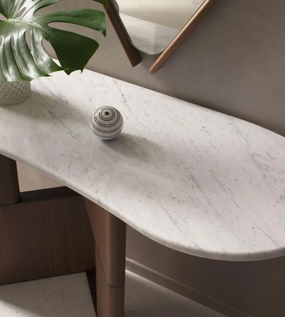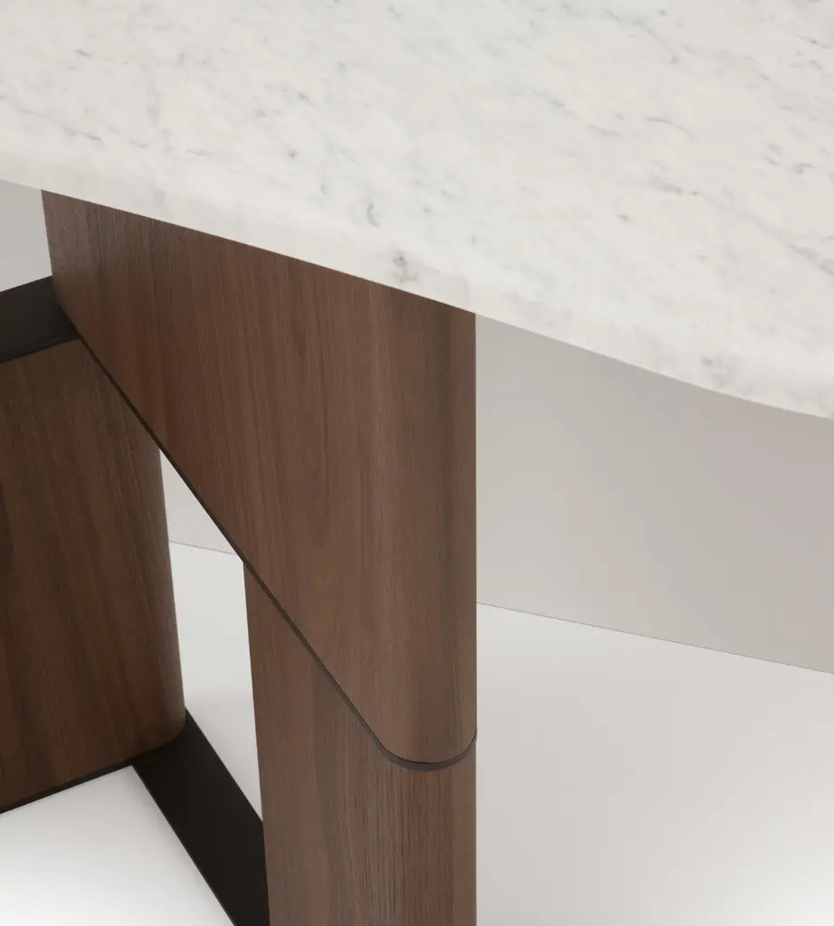 Tetris Walnut and Marble Console by Morica DesignDimensions: D 49 x W 150 x H 75 cm.Materials: Canaletto walnut, White Carrara marble, metal.Available in Canaletto Walnut, Laguna Oak, or Oak wood. Please contact us.Available in White Carrara or Black Marquina marble.Console table with legs in curved MDF veneered in real wood or oxidized bronze lacquered, with dark-bronzed painted metal inserts. Bean-shaped top with a half bullnose edge in genuine gloss-finished white Carrara marble or satin black Marquinia marble. To ensure the stability of the console, it is important that it is placed on a vertical surface, and we recommend fixing it to the wall with the two metal plates and screws provided.The spark of an idea began with three brothers, Moreno, Riccardo, and Carlo, and the desire to provide genuine Made in Italy design furniture, delivered to customer homes directly from the factory.We guarantee our customers a controlled, certified supply chain and an excellent service that makes it easy for their items to be delivered directly to their homes.We are a fresh organization, full of ideas with the desire to make the world a better place, to change the way we consume by providing beauty, sustainability, and reliable service!