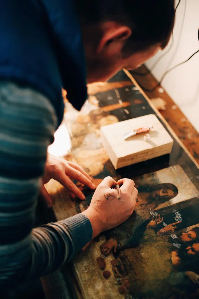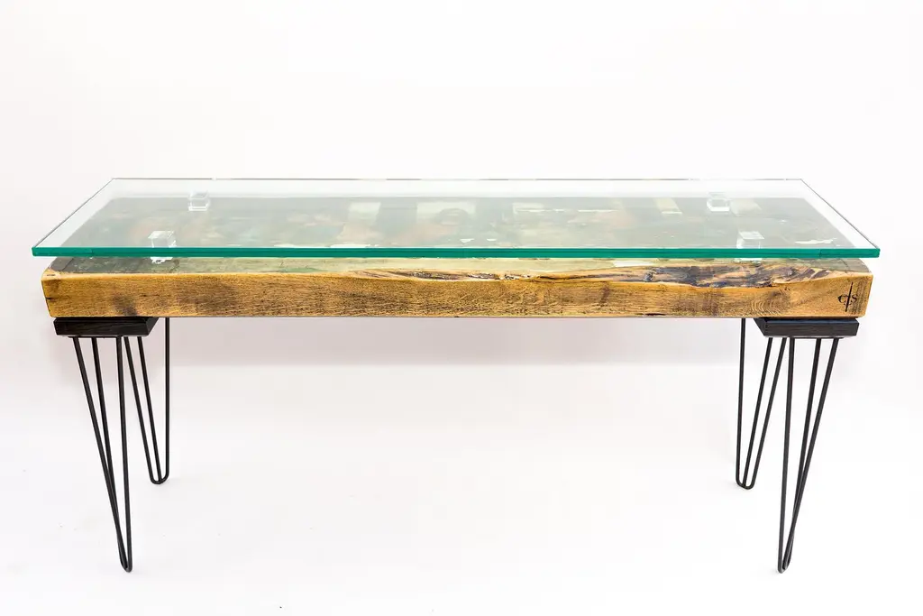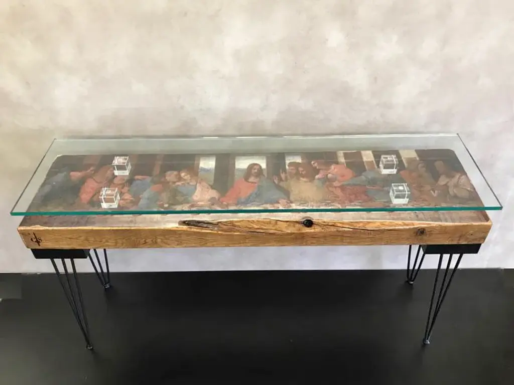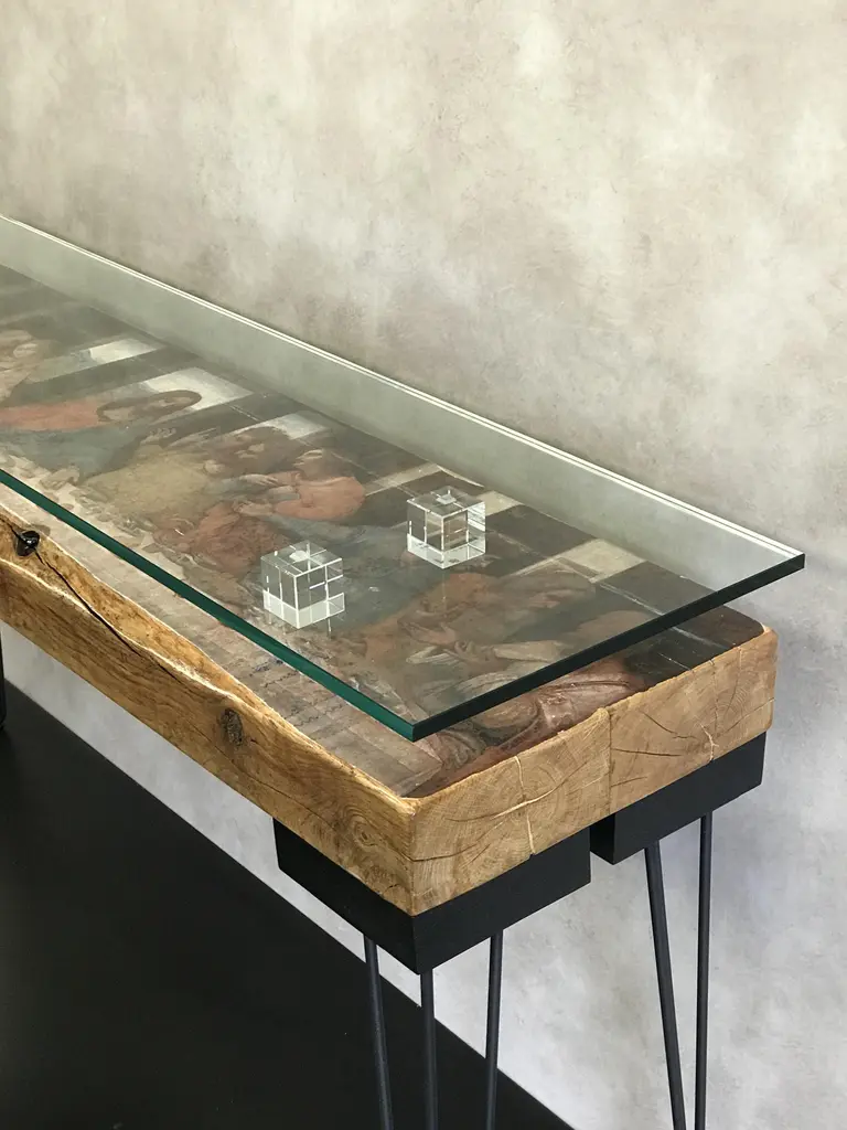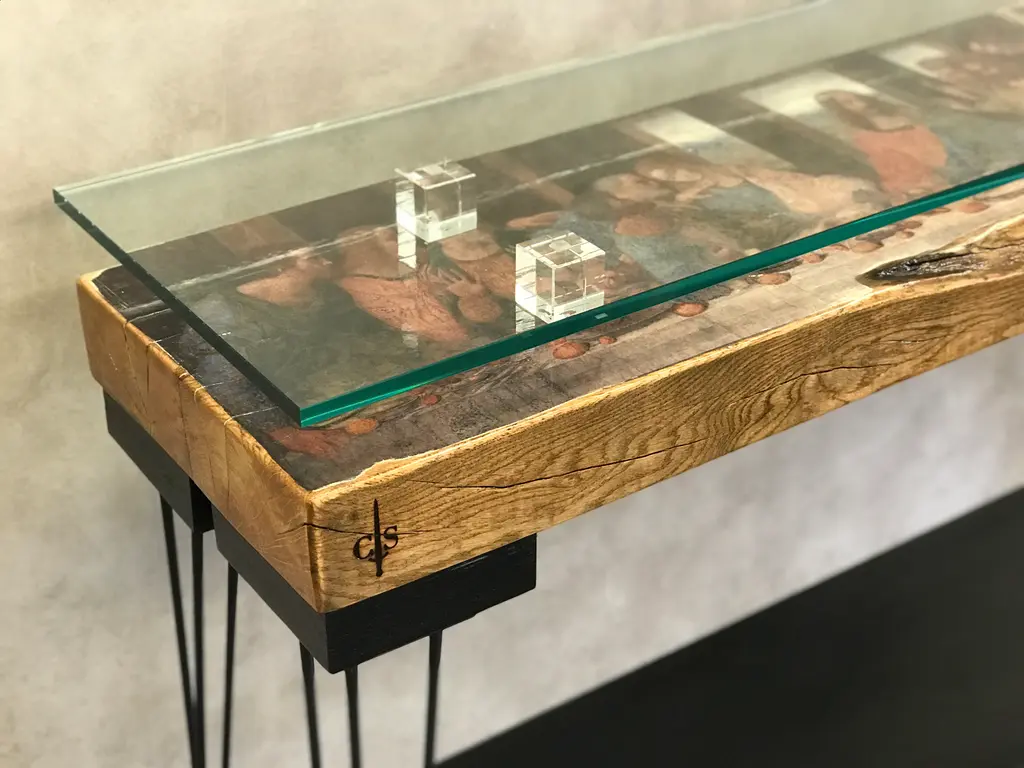 This Da Vinci table is made of oak, glass and metal. The British award-winning table is handmade. Stamped by Maker,Stamped by Maker