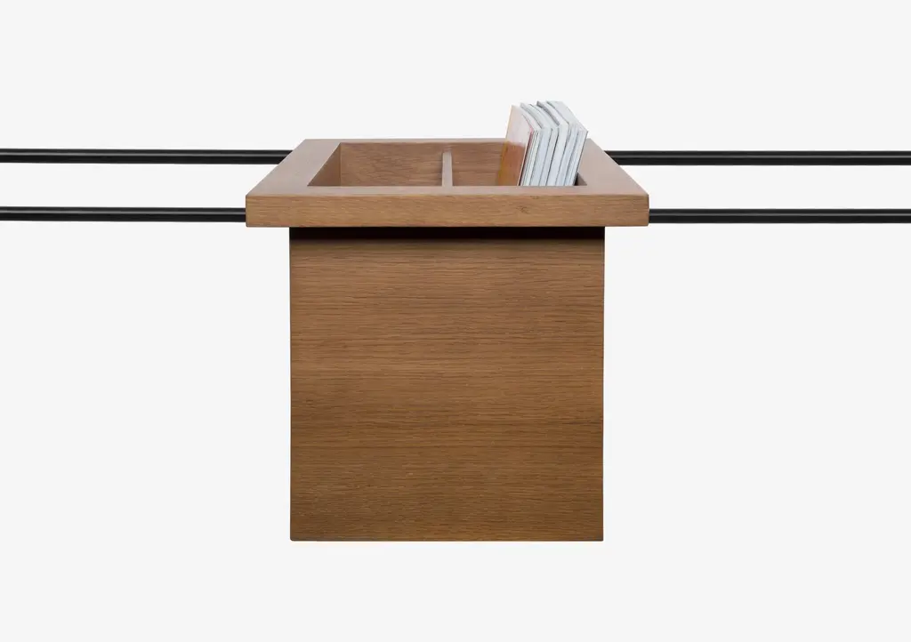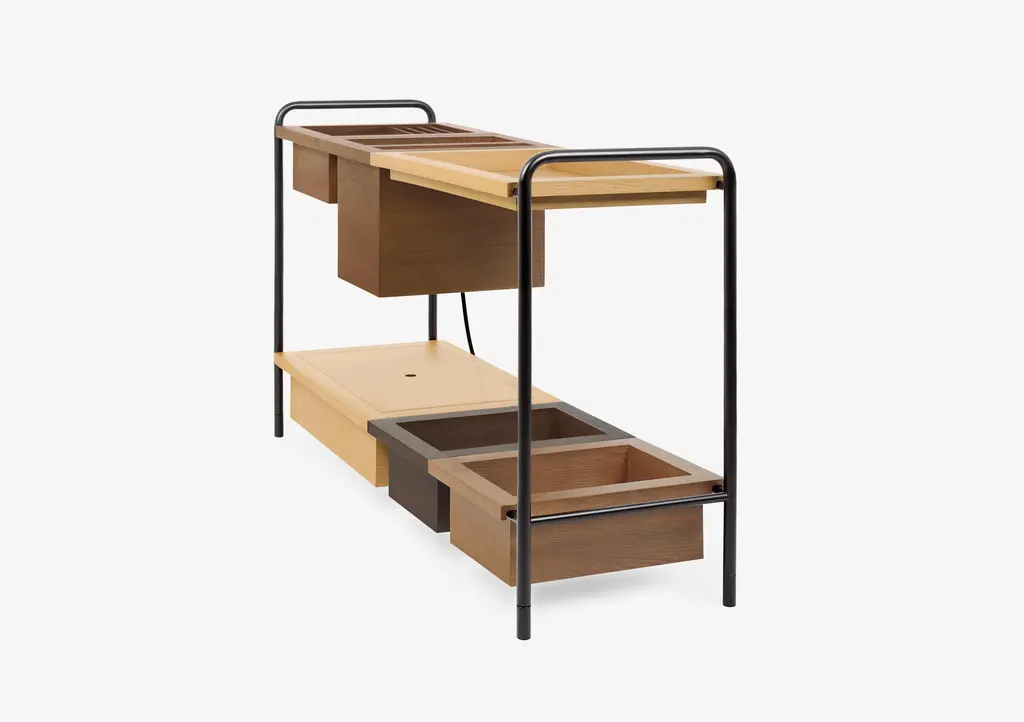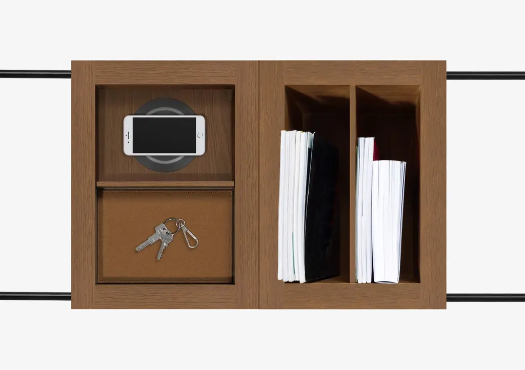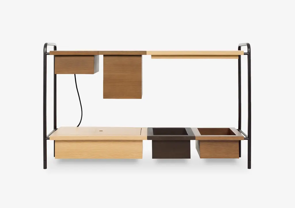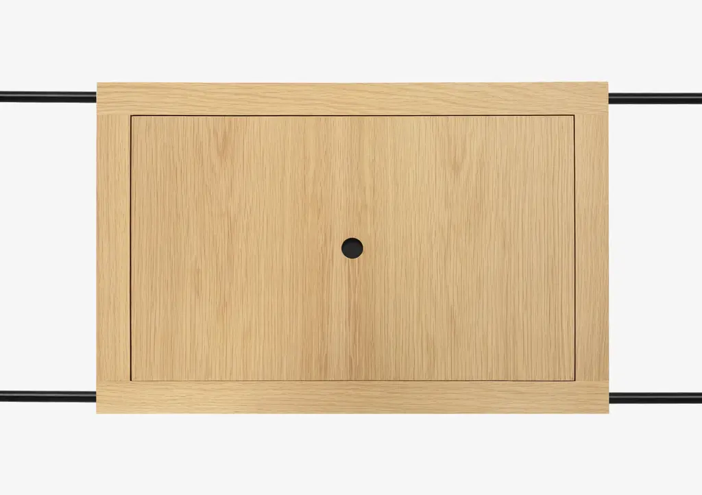Console table composed of 1 lacquered steel structure with fixed feet and 6 tops in solid oak wood and MDF veneered with natural oak leaf. The Living tops have a recess that allows a simple fit into the structure and you can easily change the order of placement. This set includes: 1 Console structure with fixed feet - Lacquered steel - Black 1 Charging box - Oak - Brown - Wireless Charger (15 watts) with Schuko, UK or US socket/plug 1 Magazine box - Oak - Brown 1 Large tray - Oak - Natural 1 Large box with lid - Oak - Natural 1 Box - Oak - Chocolate 1 Box - Oak - Brown 1 Top pad - Burel - Brown