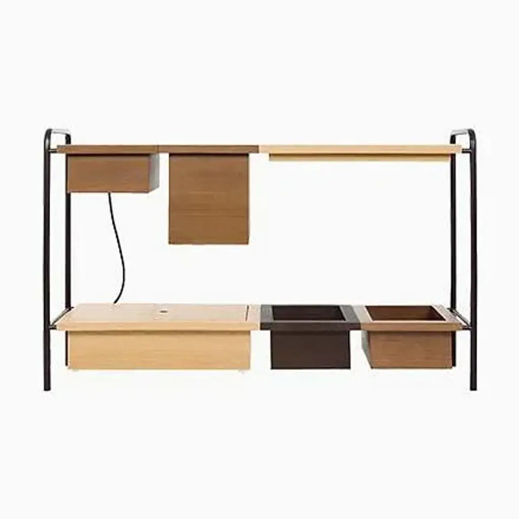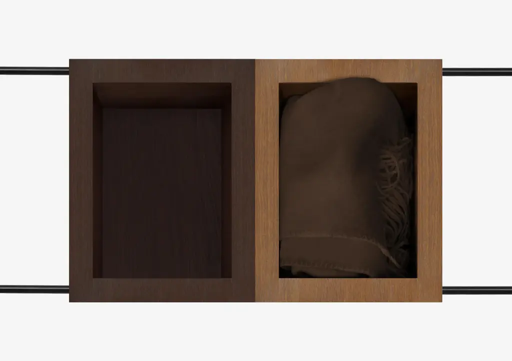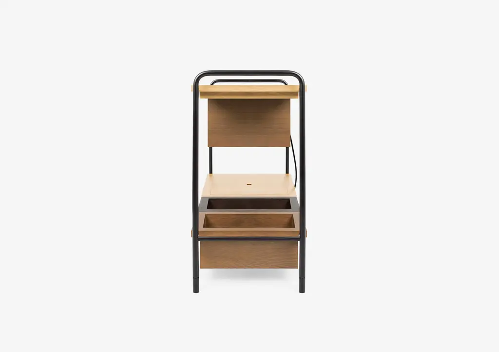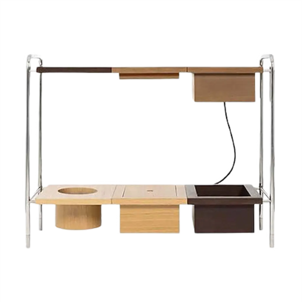 Console table composed of 1 lacquered steel structure with fixed feet and 6 tops in solid oak wood and MDF veneered with natural oak leaf. The Living tops have a recess that allows a simple fit into the structure and you can easily change the order of placement. This set includes: 1 Console structure with fixed feet - Lacquered steel - Black 1 Charging box - Oak - Brown - Wireless Charger (15 watts) with Schuko, UK or US socket/plug 1 Magazine box - Oak - Brown 1 Large tray - Oak - Natural 1 Large box with lid - Oak - Natural 1 Box - Oak - Chocolate 1 Box - Oak - Brown 1 Top pad - Burel - Brown