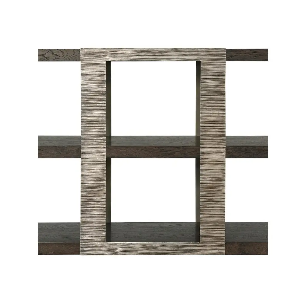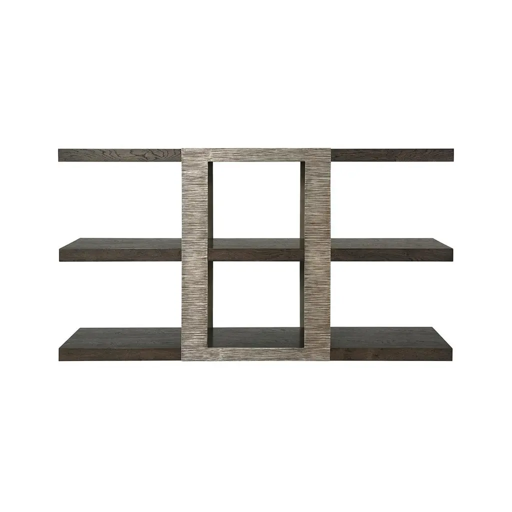 A bold statement piece that seamlessly blends organic warmth with industrial refinement. Featuring three reclaimed oak veneered tiers in a rich Smokehouse finish, this console table offers both style and functionality with its open, airy design. The striking ridged textured black nickel metal supports add a sculptural element, enhancing the table’s architectural appeal.Designed for versatility, this console table is perfect for displaying decor, books, or collectibles while maintaining a contemporary aesthetic. The contrast of natural wood grain and industrial metal detailing makes it a perfect addition to modern, loft, or transitional interiors.Dimensions: 60" W x 18" D x 34" H