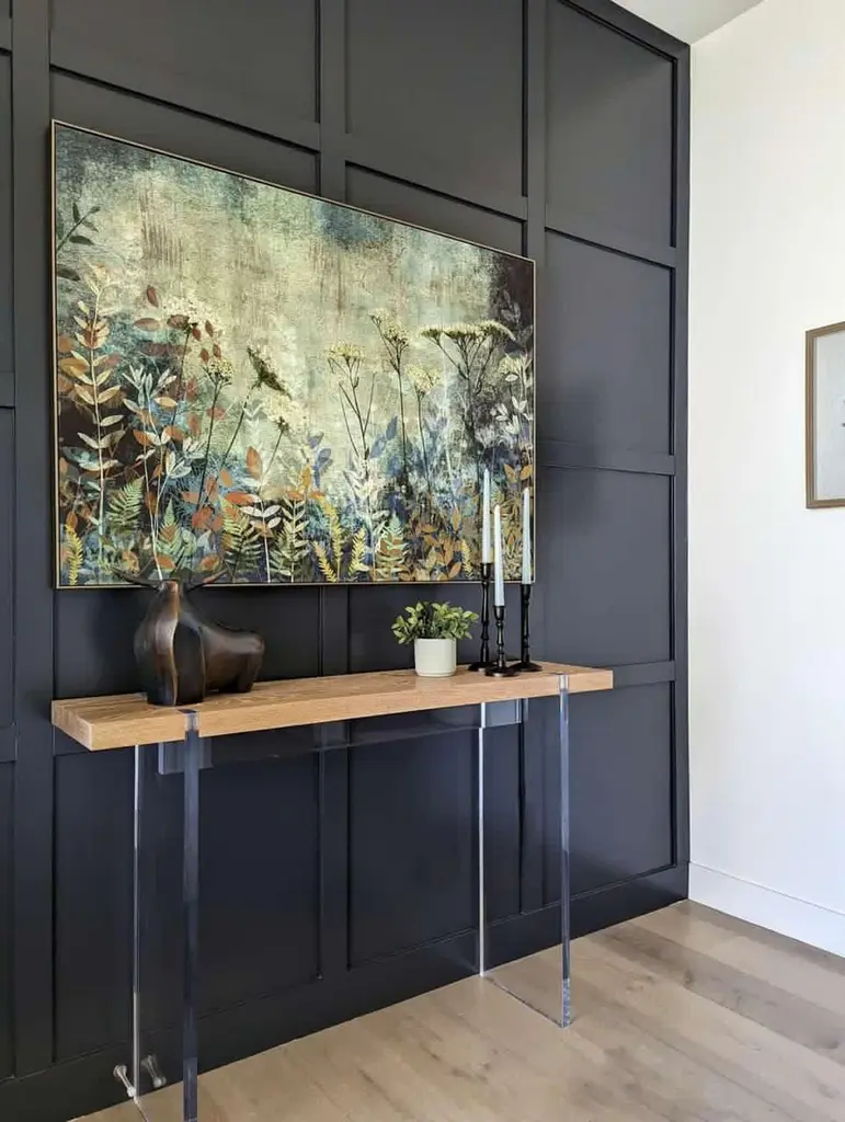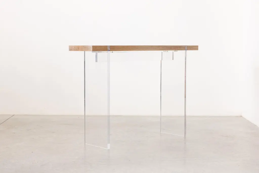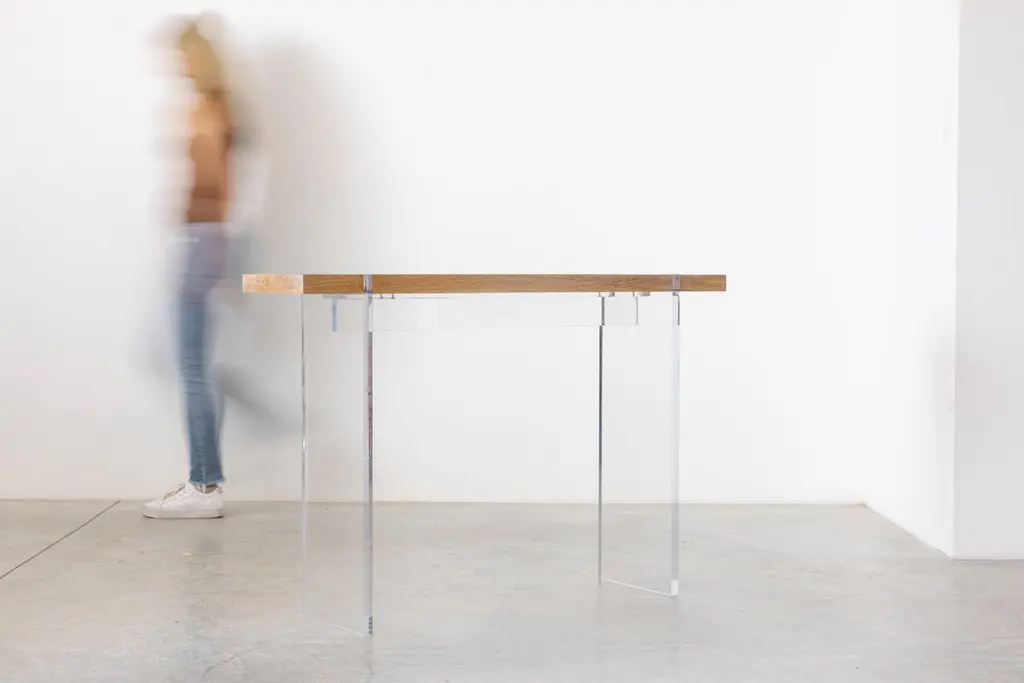 The Tillikum Torched Console by Autonomous Furniture is a striking union of natural allure and modern innovation. Crafted with meticulous care by designer Kirk Van Ludwig, this console marries the warmth of torched solid wood with the sleek transparency of museum-grade clear acrylic legs.The Tillikum Console stands as a testament to minimalist elegance, with its torched Oak top seemingly suspended atop the crystal-clear acrylic legs, creating an illusion of weightlessness and sophistication. This unique juxtaposition of materials not only enhances the console's visual appeal but also brings a touch of contemporary flair to any space.Sourced locally and finished with a natural oil and wax coating, the Oak top undergoes a fuming process to achieve a rich, dark lustre that exudes timeless charm. Each console is crafted to perfection, reflecting our commitment to quality craftsmanship and sustainability.Designed by Kirk Van Ludwig, nine-year award winning Designer of the Year finalist, this console epitomizes his mastery in blending modern aesthetics with functional design. The customizable length options allow you to tailor the console to suit your specific space requirements, ensuring a perfect fit for your home.Elevate your interior decor with the Tillikum Torched Console – where artistry meets functionality, and clear acrylic legs elevate your space to new heights of contemporary sophistication.Specifications:48" L x 12" D x 32" H. Tailored length available.Domestic Oak, torched and fumed to produce a rich dark lustre, finished in a natural oil and wax. Acrylic console with clear acrylic frame and legs.