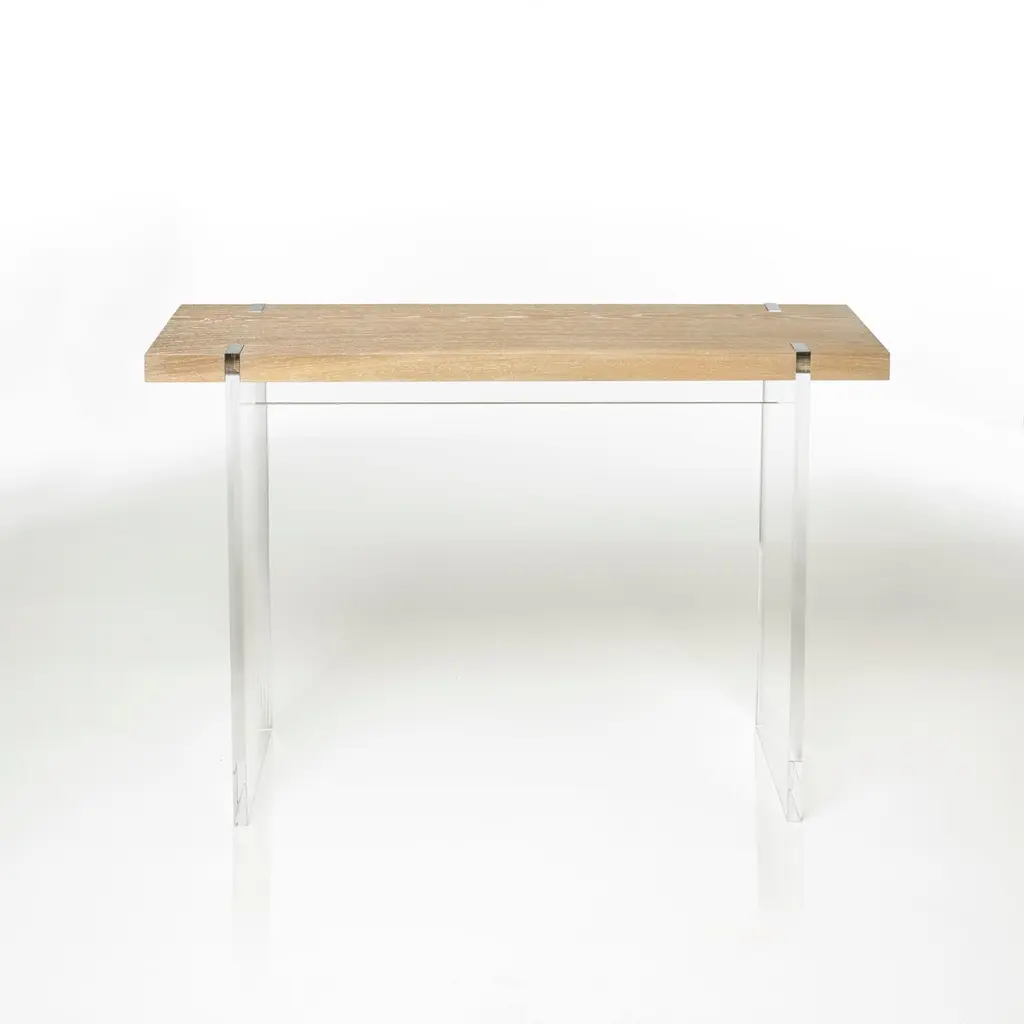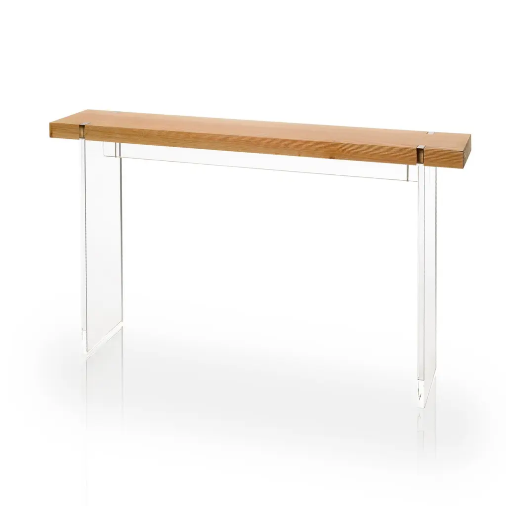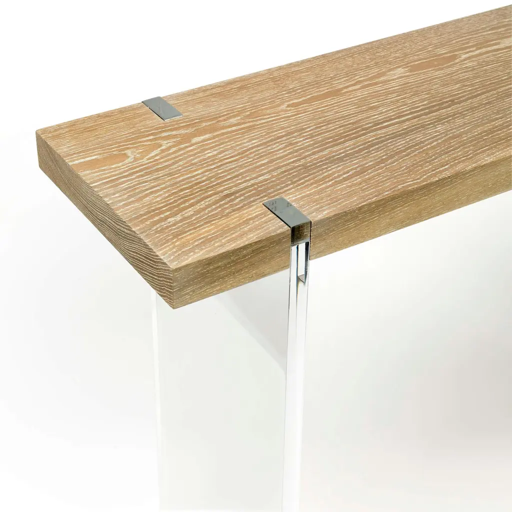 Elevate your home with the timeless elegance and contemporary sophistication of the Tillikum Console Table by Autonomous Furniture. Crafted with precision and attention to detail, this stunning piece features a floating tabletop supported by sleek acrylic legs, creating a modern statement in any space.Made from sustainably sourced White Oak, the Tillikum Console Table is finished with a natural whitewash oil and wax, showcasing the beauty of the wood grain. Whether placed in an entryway, hallway, or behind a sofa, this versatile piece adds a touch of luxury and functionality to your home decor.Designed by the acclaimed Kirk Van Ludwig, this console table embodies the perfect balance of minimalist design and mixed materials, making it a standout in any room. Available in a range of finishes including Black Walnut and Torched Oak, the Tillikum Console Table is a true masterpiece that will be cherished for years to come.Transform your living space with the Tillikum Console Table from Autonomous Furniture - where craftsmanship meets contemporary style.Contemporary design of an acrylic console table contrasting the polished acrylic legs with natural solid wood top.Designed by Kirk Van Ludwig, eight-time Designer of the Year finalist for Western Living magazine. A modern furniture aficionado.48" L x 12" D x 32" H. Tailored sizes available.White Oak (shown), also available in Natural Fir, Torched Fir, and Black Walnut.Acrylic bench with clear acrylic frame and legs.