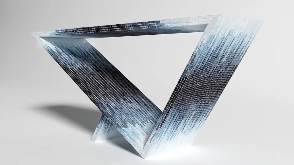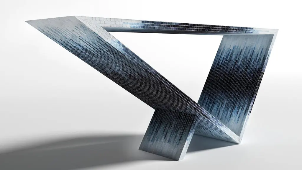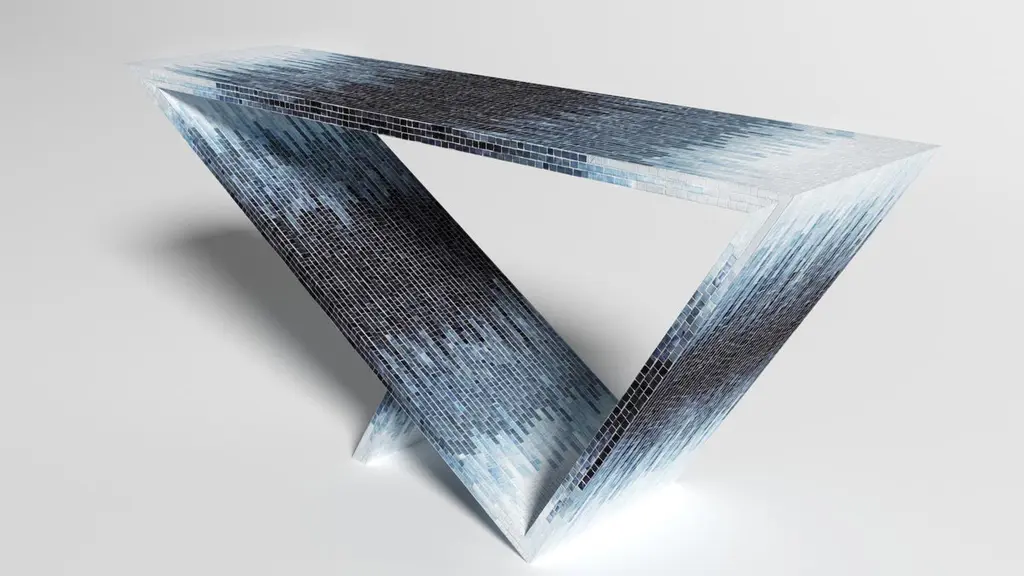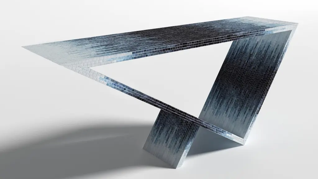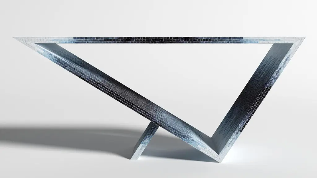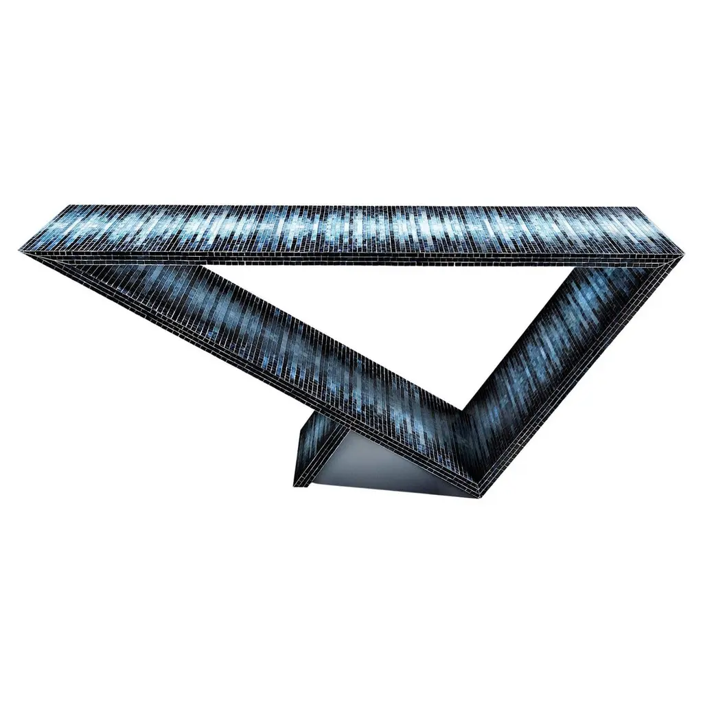 Time/space portal blue ombre console #2 by Neal Aronowitz DesignDimensions: D 172.7 x W 43.2 x H 76.2 cmMaterials: Glass tile mosaic.This table can be fabricated in any custom mosaic color and pattern. Also available in different sizes. The inspiration for the Time/Space Portal collection comes from the power, simplicity, and elegance of the triangle.This is an ongoing series exploring the dynamics of balance, weight, gravity, mass, and how this dynamic is expressed utilizing various materials. A powerful Minimalist gem with a dynamic presence. This glass tile mosaic console table has a subtle blue ombre gradient pattern. This Ombre series is also available in three other patterns.Neal Aronowitz art/design was founded in 2014 and with just a few powerful and iconic pieces of furniture and lighting, has quickly won acclaim in the international design world.The vision of the studio is the design and fabrication of highly sculptural, hand crafted bespoke furniture and lighting.Aronowitz’s debut piece was the Whorl Coffee Table, which won international notice including a feature in Elle Décor and was the recipient of a People’s Choice Award at the AZ Design Awards, sponsored by Azure Magazine.