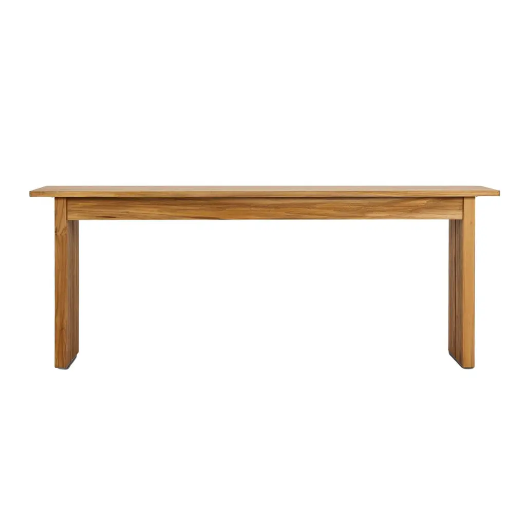 Framed by FSC-certified teak with a light, natural finish, this console table features a base cutout that enhances its linear design, making it perfect for outdoor entertaining. Its clean lines and elegant simplicity make it a versatile addition to any outdoor space. Remember to cover or store it indoors during inclement weather and when not in use to maintain its beauty.