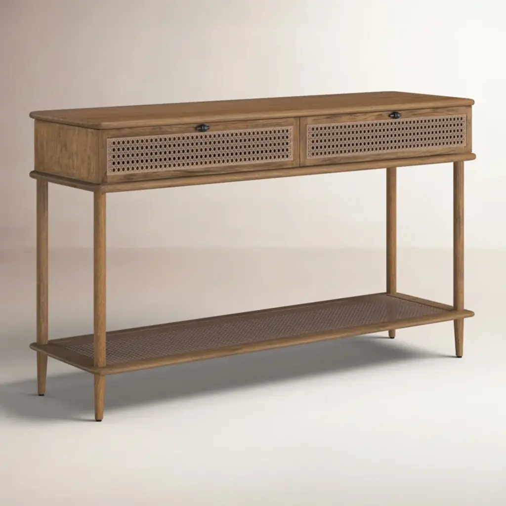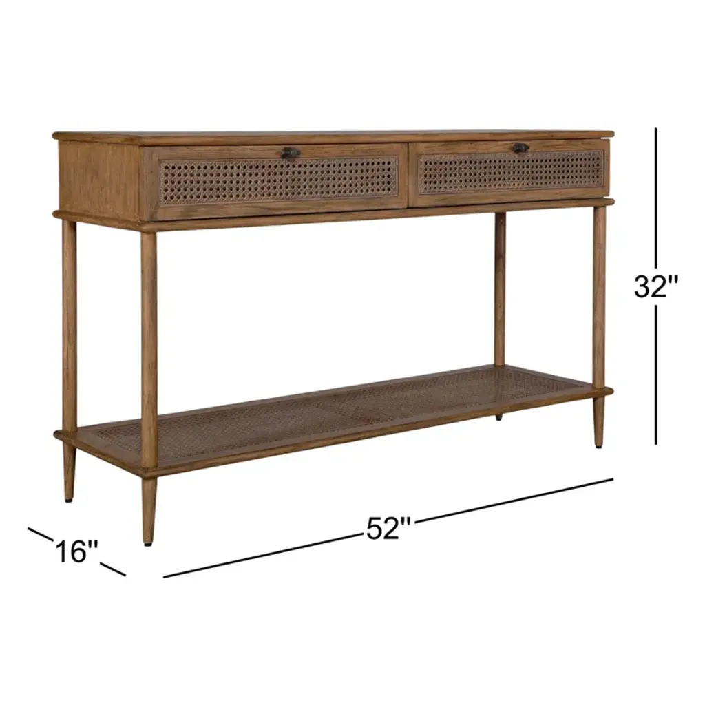 Mid-century inspired with accents of natural rattan cane, this console table features mindi solids and veneers finished in a soft oak stain. It has one storage shelf and two drawers with metal hardware in dark gunmetal.