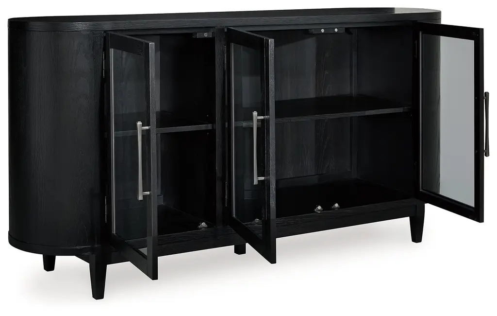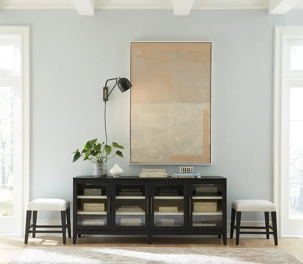 Craft a modern space by adding this transitional 72" console table to your space. Its black exterior paired with the white interior visible through the glass doors crafts appealing visual interest. With a classic simple silhouette and elegant bronze bar hardware, this console plays charm to its advantage. Whether using this piece as your main TV stand or utilizing it for additional storage and display purposes, your living room will love the on-trend aesthetic.