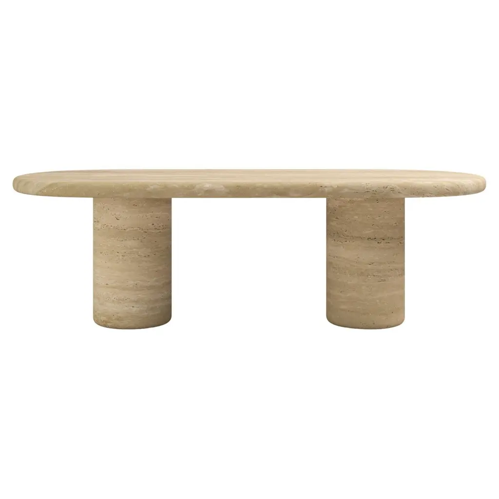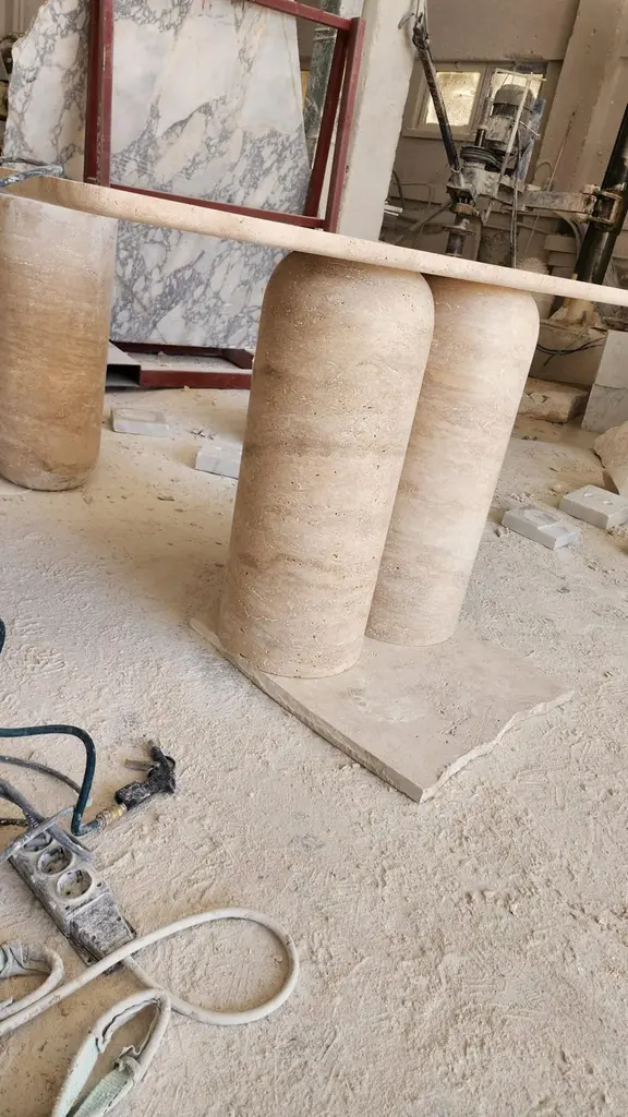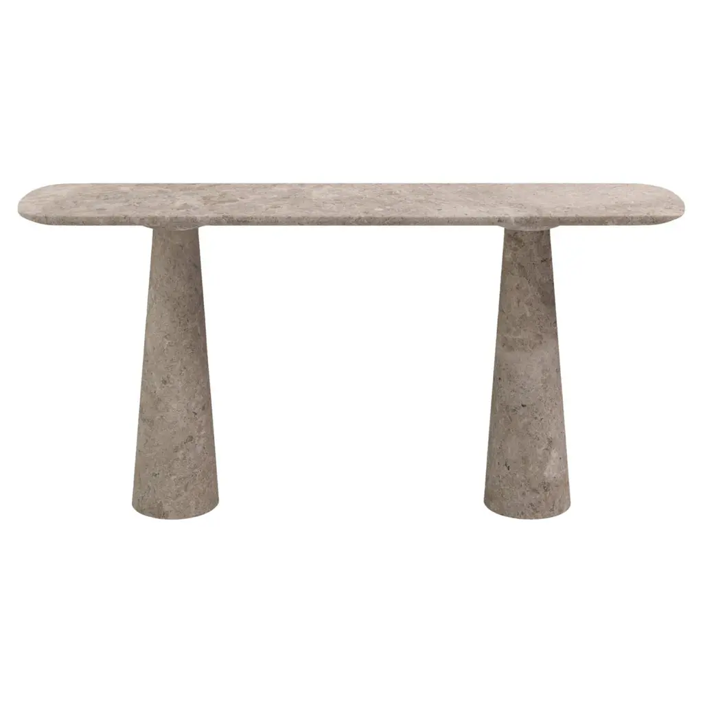 Made from high-quality travertine. This console can be customised in your requested dimensions. 2 x dome-topped pedestals are an sculpture in themselves. Rounded-edge tops appear to push the limits of gravity in a sculptural balancing act. MY HABITAT DESIGN is an interior design studio based in Amsterdam. This table collection came to life after designer/founder found that sourcing the perfect size/finish/style vintage pieces for her clients and projects was becoming increasingly tricky.. and often over budget. Getting it ‘just right’ often felt like a miracle, so she set out to create a collection of tables that still upheld the solid forms and sculptural shapes she was always hunting for.MY HABITAT DESIGN works closely with local stone artisans to create a collection of stone tables combining traditional techniques and a rare way of working with solid stone. Console shown here in a half filled / half unfilled travertine. Size: 148x38xH78cm