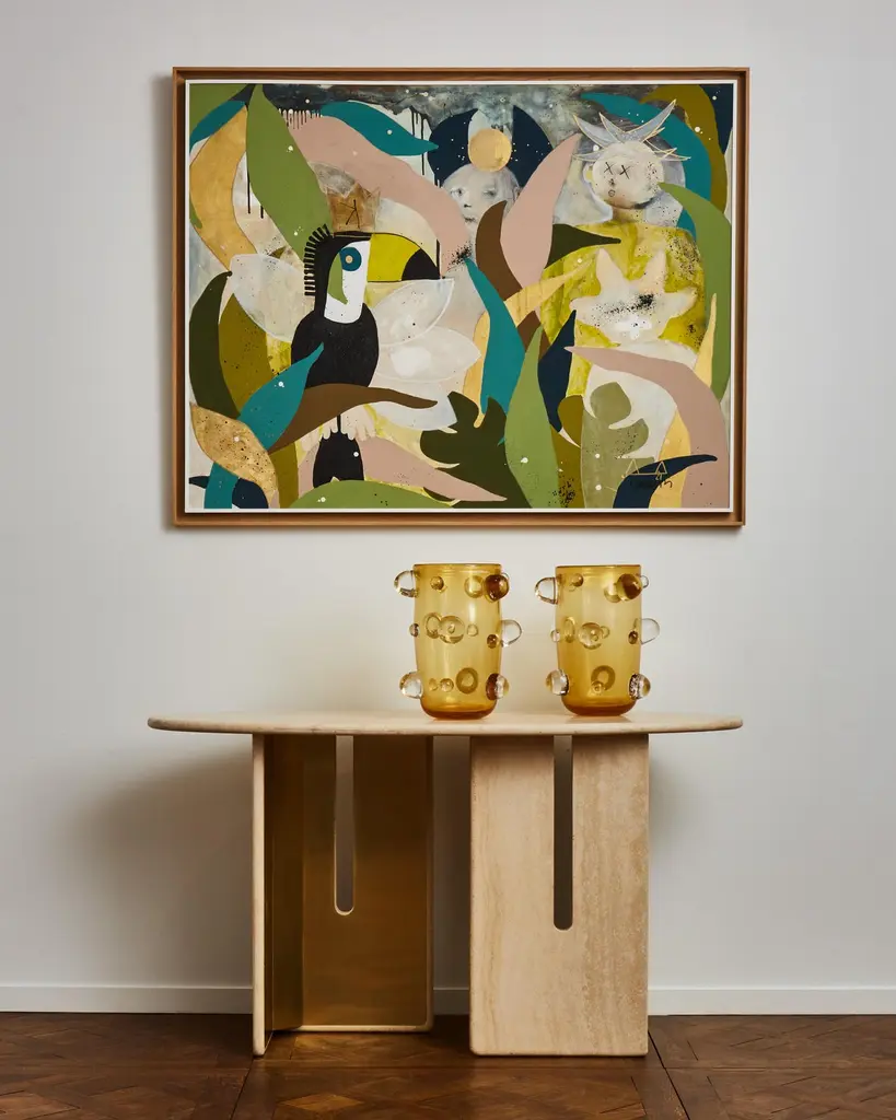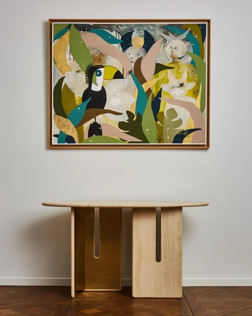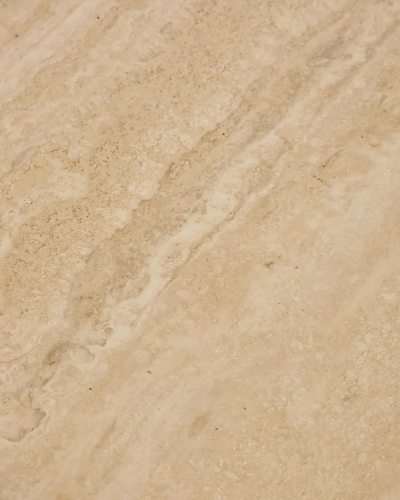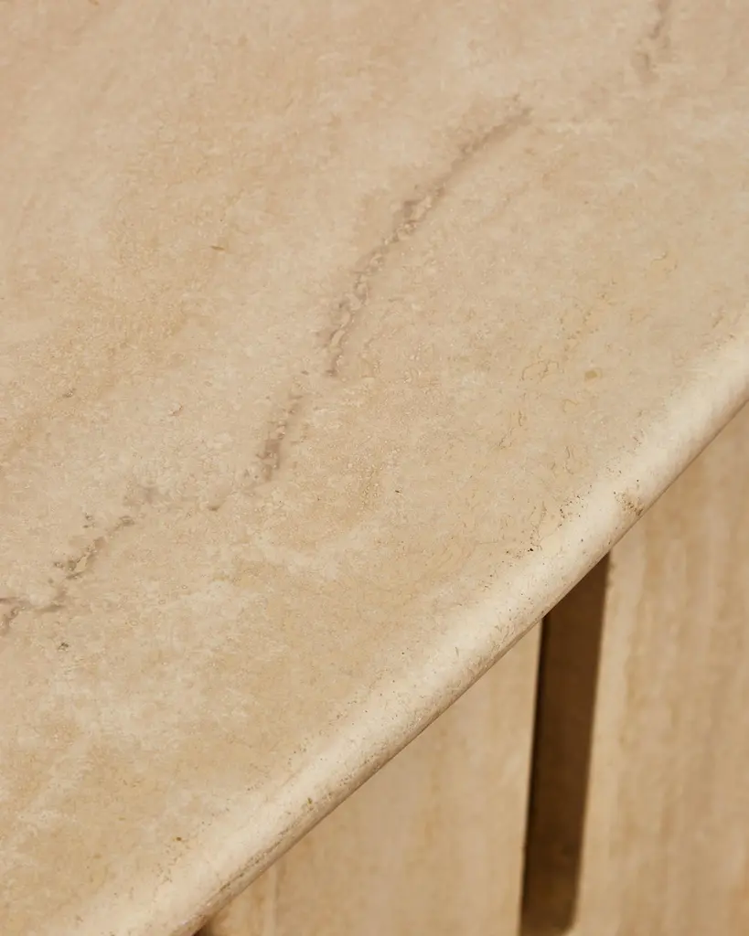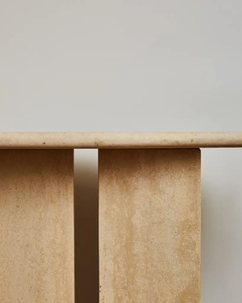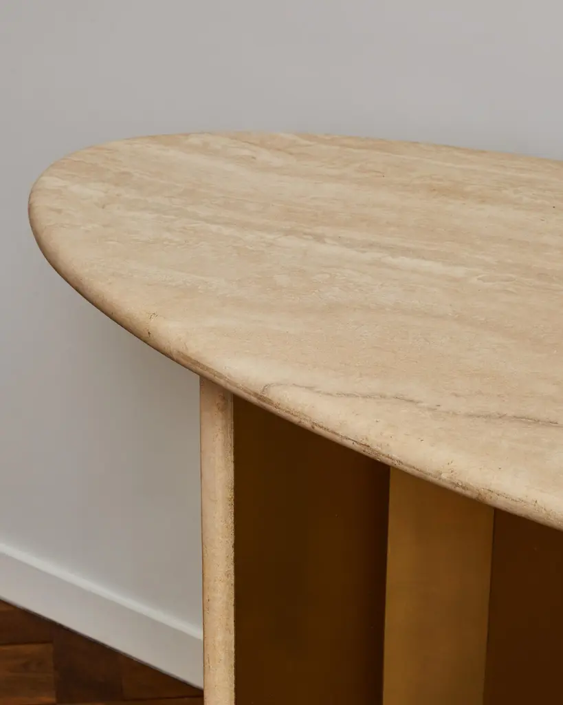 Superb console in massive travertine stone with brass plates on the insides of the bases.Creation by Studio Glustin.France, 2022.