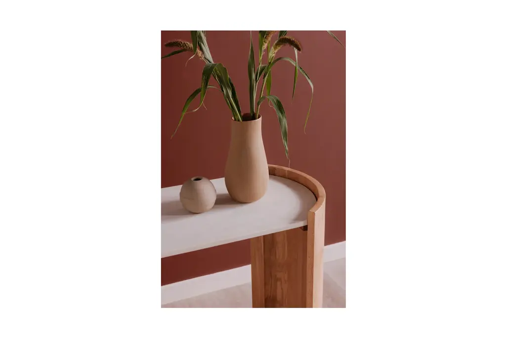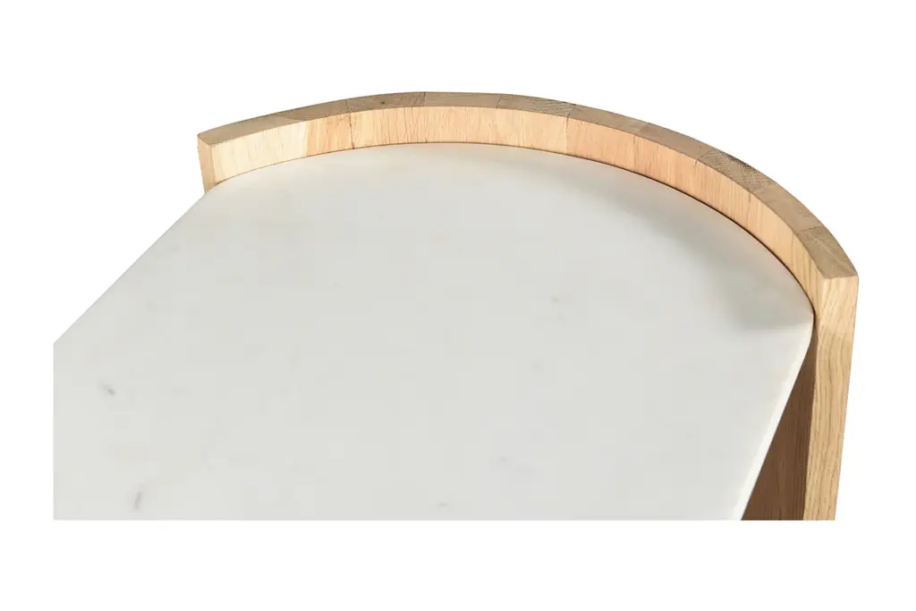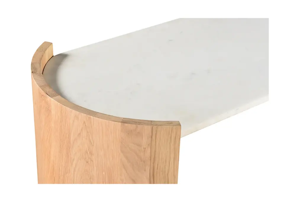 Inspired by French Art Deco design, the Trevi Console Table adds a sophisticated touch to your living space. Experience an artful combination of natural textures with curved, solid oak legs and a unique racetrack-shaped marble top. Style it in your hallway, behind your sofa, or anywhere where you need a little extra display space