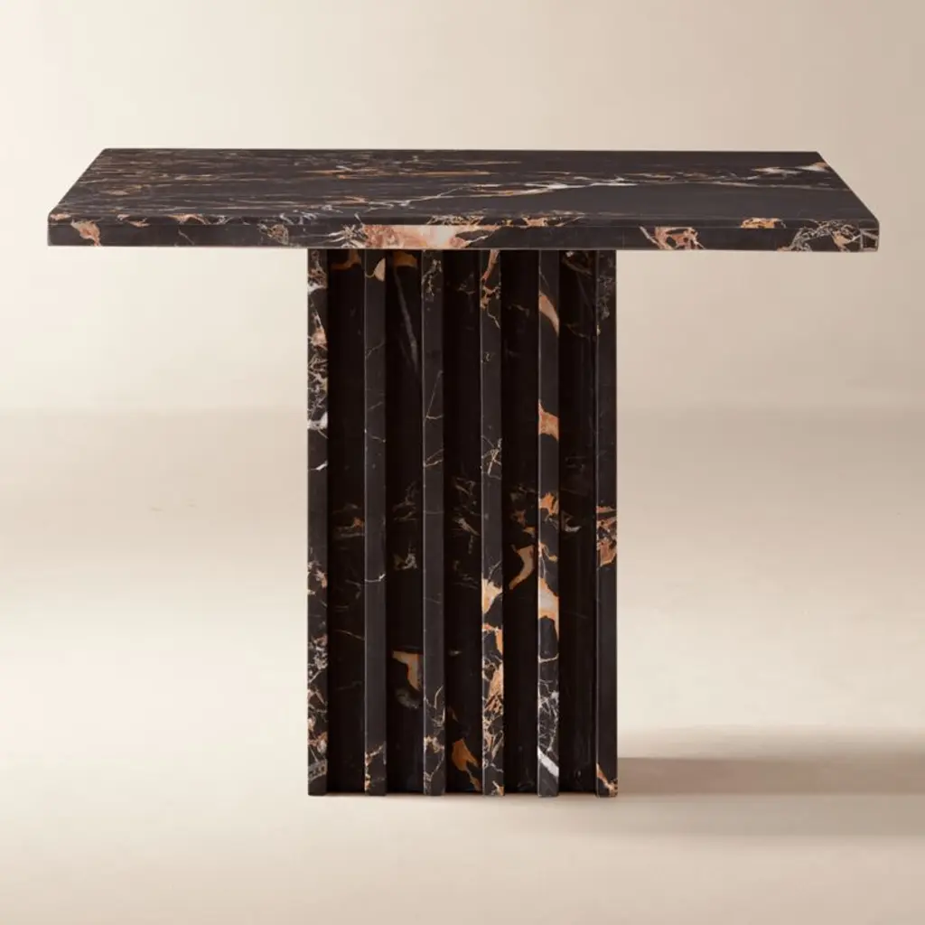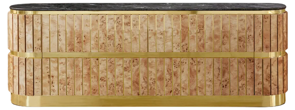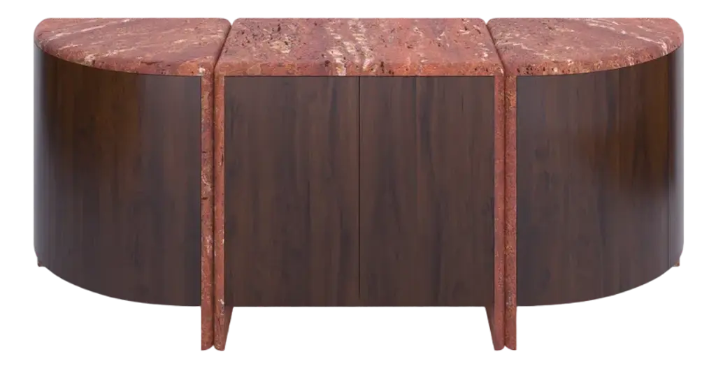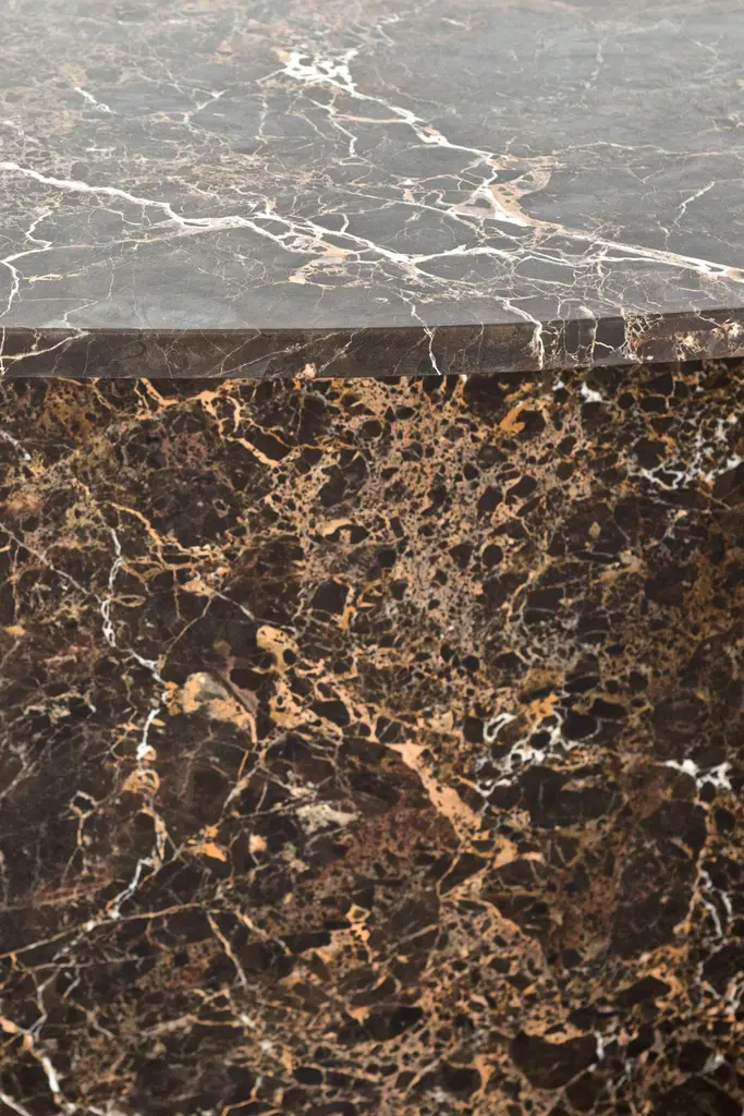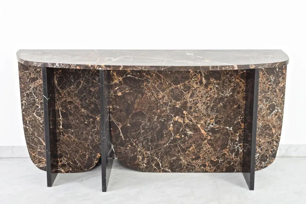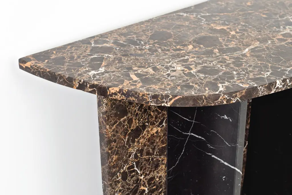 Trilithon marble console by OS And OOSDimensions: 180 x 59 x 81 cmMaterials: Emperador gold and nero marquina.Studio OS And OOS is design studio for small objects to larger spatial concepts;the studio tries to find the balance between form, Material and their relation to the surroundings and the user. For the duo it is the constant search to find the essence in the complex that drives them, taking an initial concept and working it into an object that conveys only what is meant to.The majority of work borders the line of design (in the Industrial/ functionality sense) and autonomous objects; best described as contemporary objects derived from concept, yet rationalized to give them purpose. The conclusion of these efforts results in neither a product nor pure artistic expression but a culmination of the both. A product where art=industry.As a result works of OS ? OOS have been commissioned by production partners such as FontanaArte, Please Wait to be Seated and Umbra-Shift, and have their work represented nationally and internationally at prestigious fairs such as Design Miami/Basel, PAD London and Paris, Collective Fair in New York, Fog Fair San Francisco, Design Days Dubai and Collectible in Brussels to mention a few.Their work has also been included at museums such as the Van Abbe Museum in Eindhoven, Mac’s Grand-Hornu in Belgium, The Design Museum in London and Villa Noailles in Hyeres, as well as having work acquired by the Vitra Design Museum for their permanent collection.Lately the studio also moved towards interior design completing recently the flagship store for Ace & Tate.Oskar Peet (NL/CAN) and Sophie Mensen (NL) are both graduates of the Design Academy Eindhoven (2009), and started the firm OS ? OOS in the autumn off 2011. Both live and work currently in the city of Eindhoven, the Netherlands. They also occasionally teach as guest teachers at the Design Academy Eindhoven and the Academy of Architecture in Amsterdam..