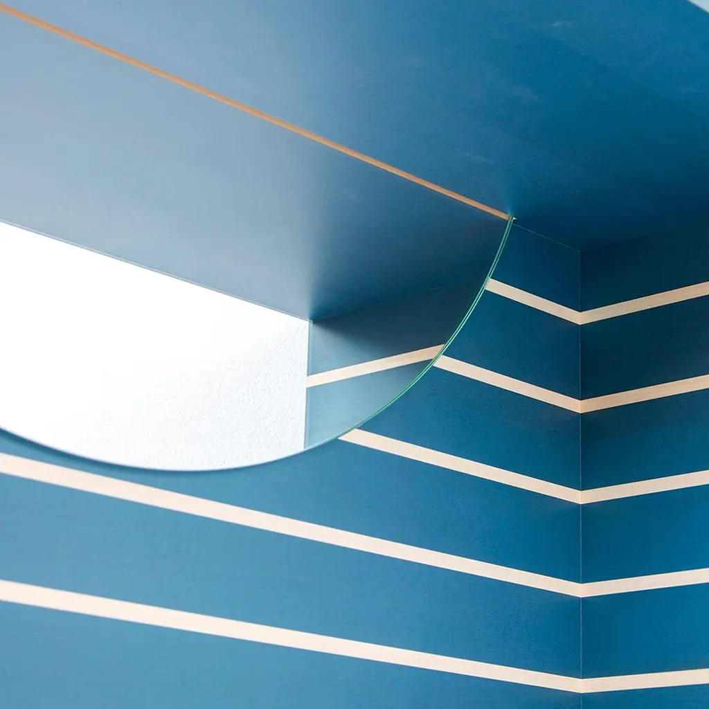 Designed by Sakura Adachi, this striking console is made of maple wood with two distinct finishes: natural on the outside and with blue and natural stripes on the outside. The minimal, rectangular silhouette features an off-center, round mirror that cuts the top like a moon surrounded by clouds in the sky (Tsukimi refers to the Japanese tradition of holding parties to view the harvest moon). Placed in a living room or large hallway, this piece will make a statement in any decor.