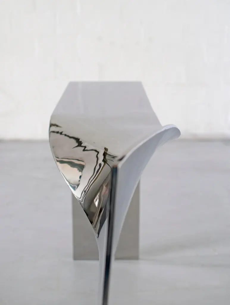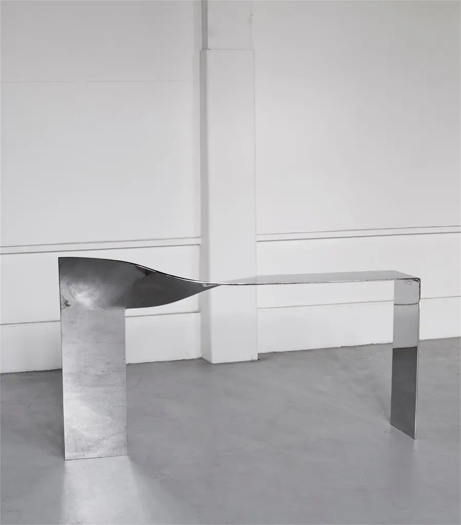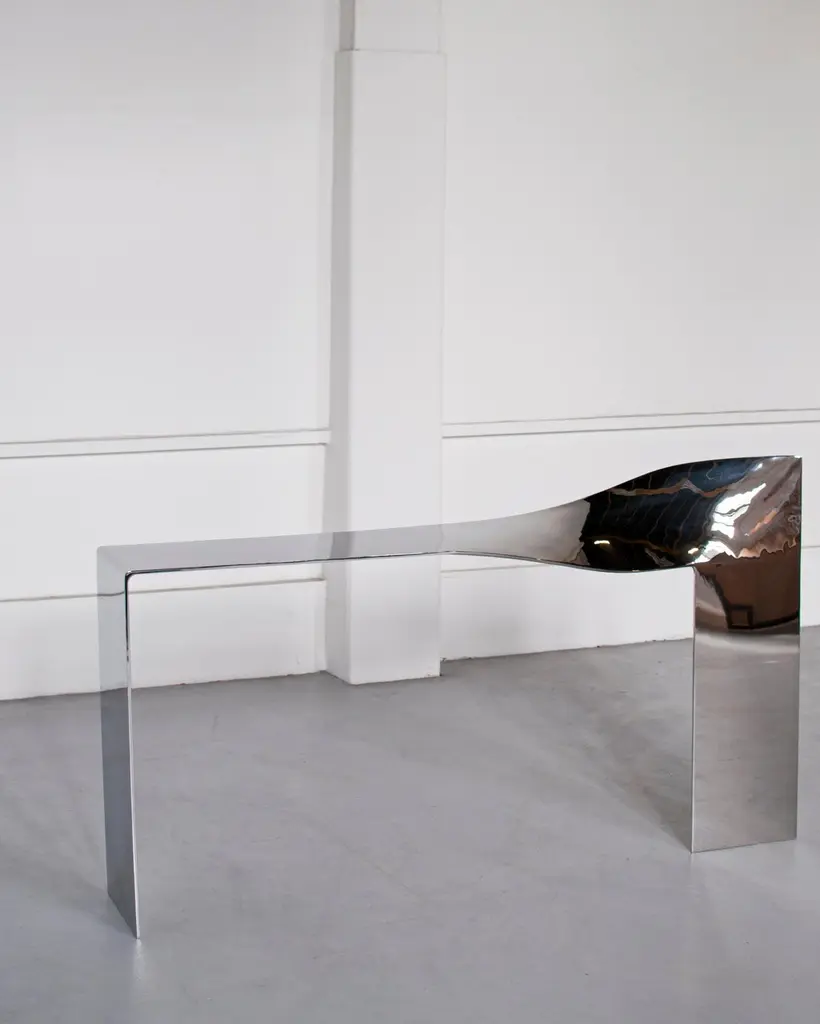 Twist Console by Pol Quadens Limited Edition Of 8+4 Pieces.Dimensions: D 40 x W 200 x H 95/130 cm.Materials: Polished stainless steel.Pol Quadens was born in Brussels. His father was active in the fields of composites the metal industry, and the world of materials, therefore, surrounded Pol since his early childhood. After his artistic studies, he starts restoring vintage cars. This experience has allowed him to gain strong practical skills and a deep knowledge of all materials.In 1987, he made his first creations and production of objects. His sensitivity and passion for the arts led him to create functional artworks. His CD shelf has sold more than 100,000 pieces and has become iconic in its category.